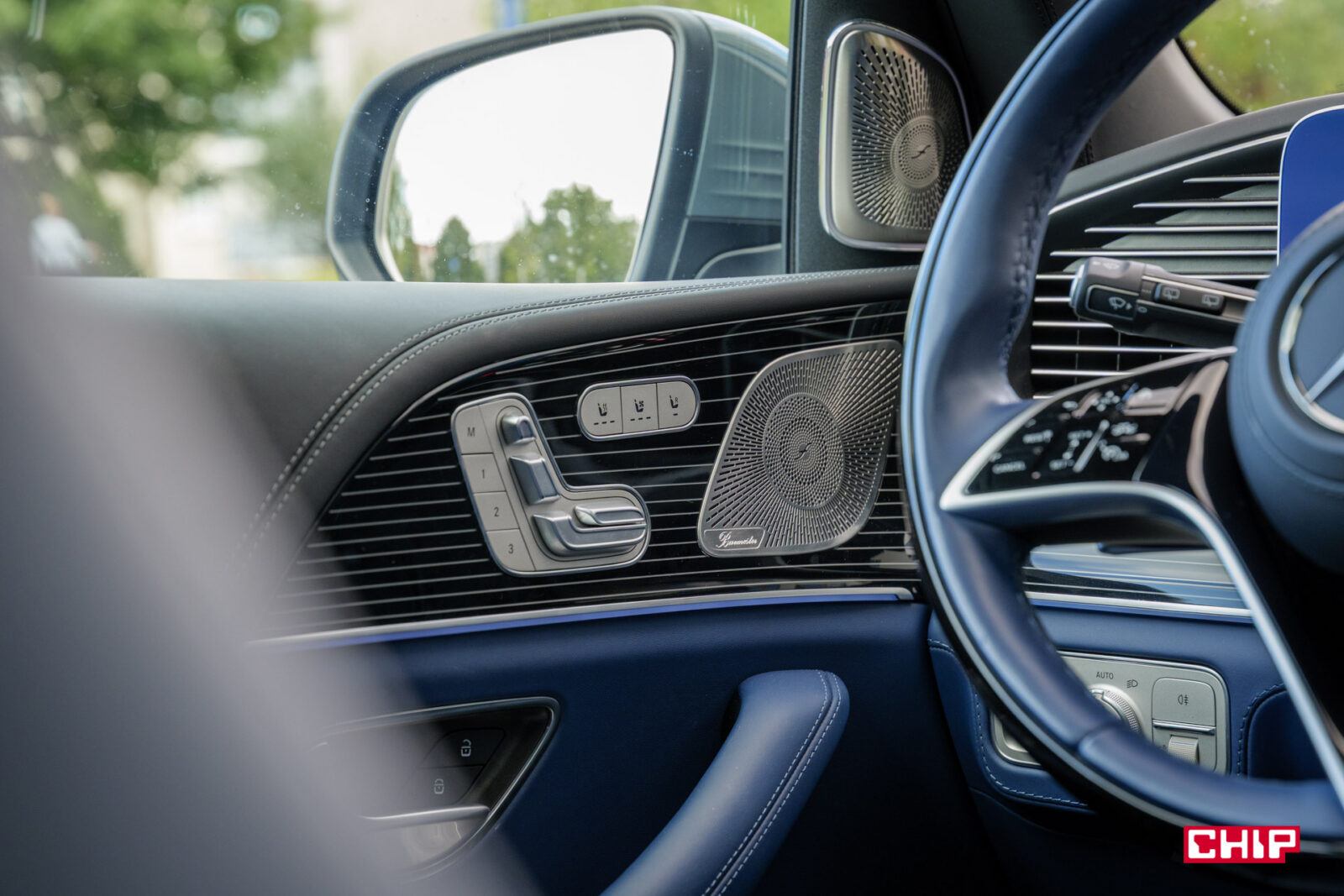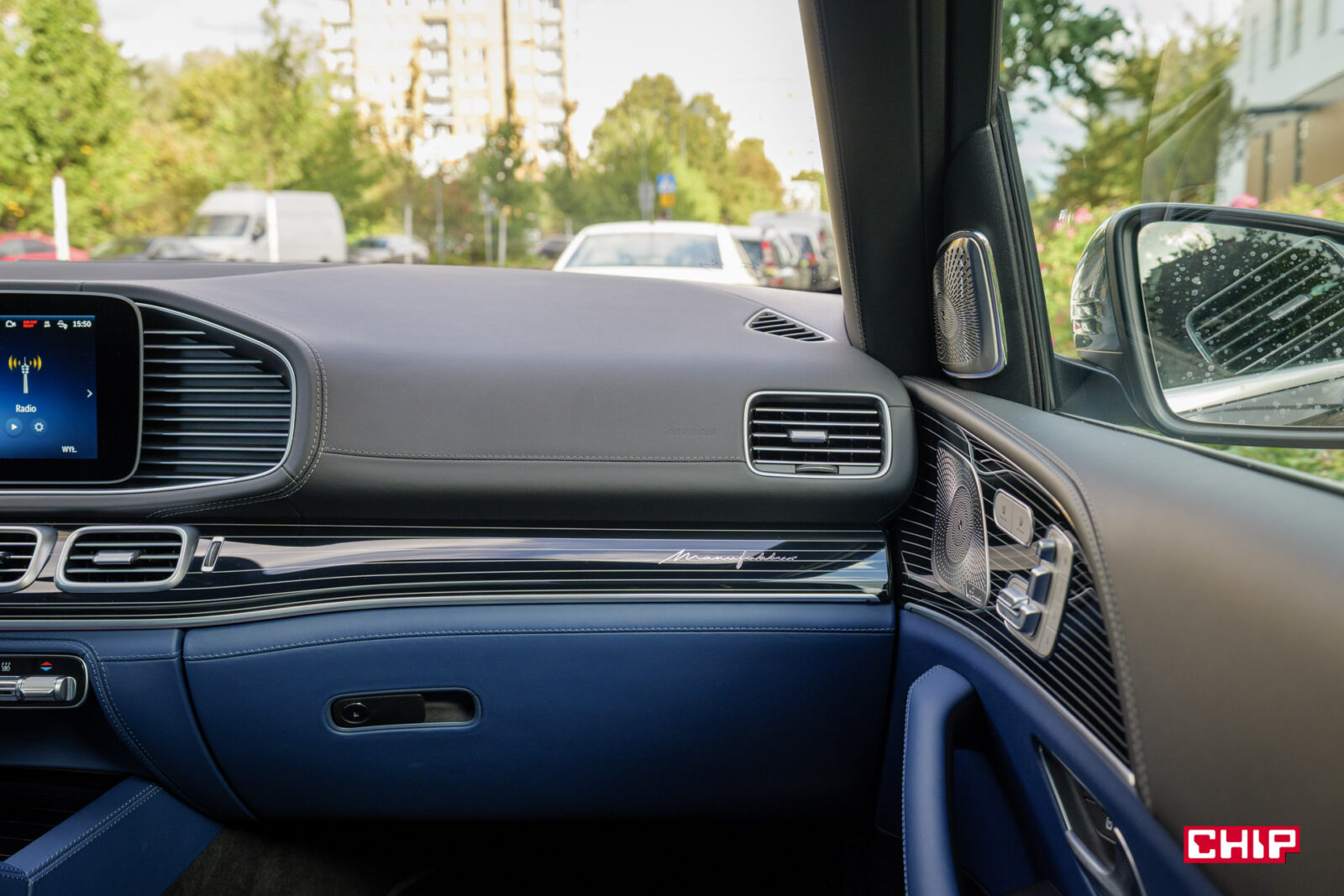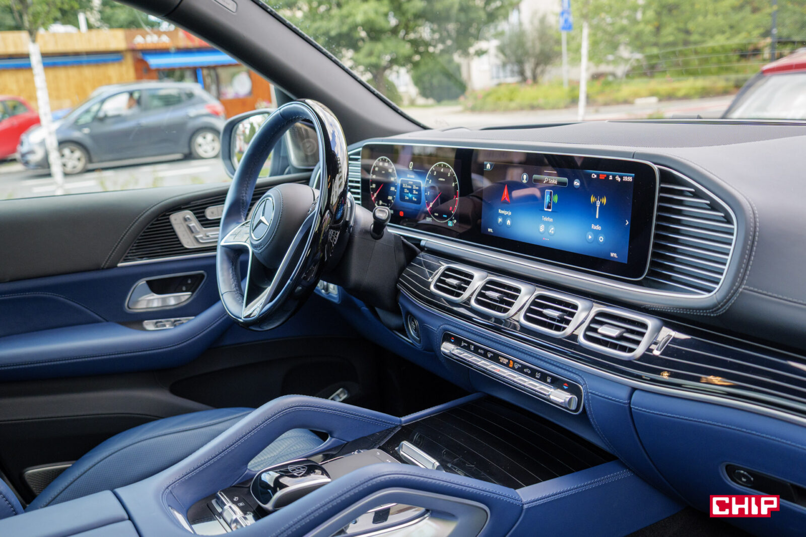 Błyszczą się, bo ktoś wybrał tutaj w konfiguratorze elementy wykończenia wnętrza Manufaktur – czarne w wysokim połysku z motywem flowing lines. Mówiąc wprost – piano black, za który Mercedes liczy sobie dodatkowe 3 310 zł. Cóż, podobno niektórzy faktycznie sobie to robią, natomiast w standardzie mamy dwa warianty wykończenia drewnem – jasny orzech lub ciemnoszary dąb. Akurat do niebieskiej tapicerki zdecydowanie lepiej pasuje druga opcja.