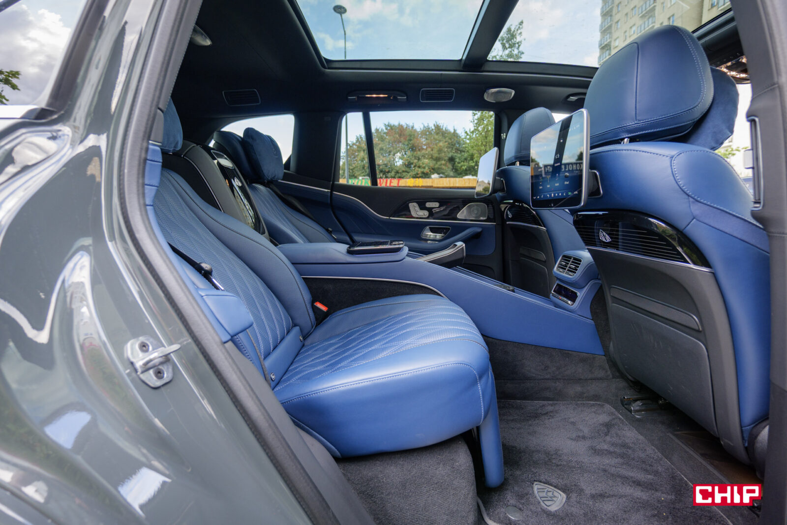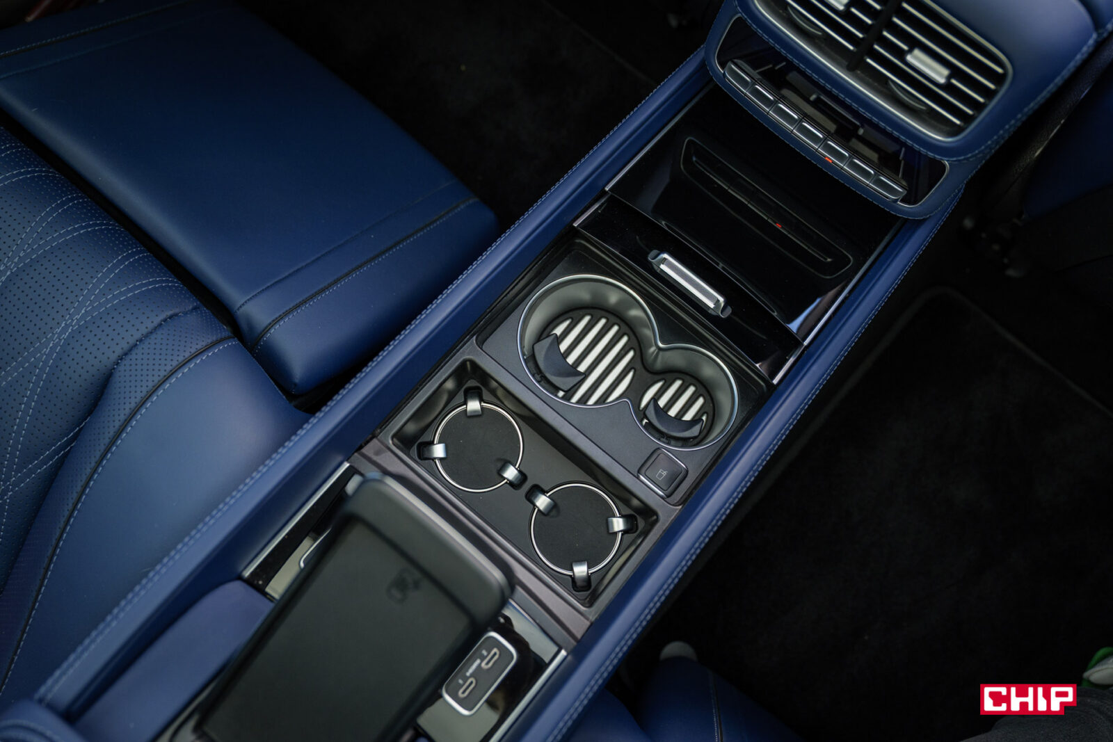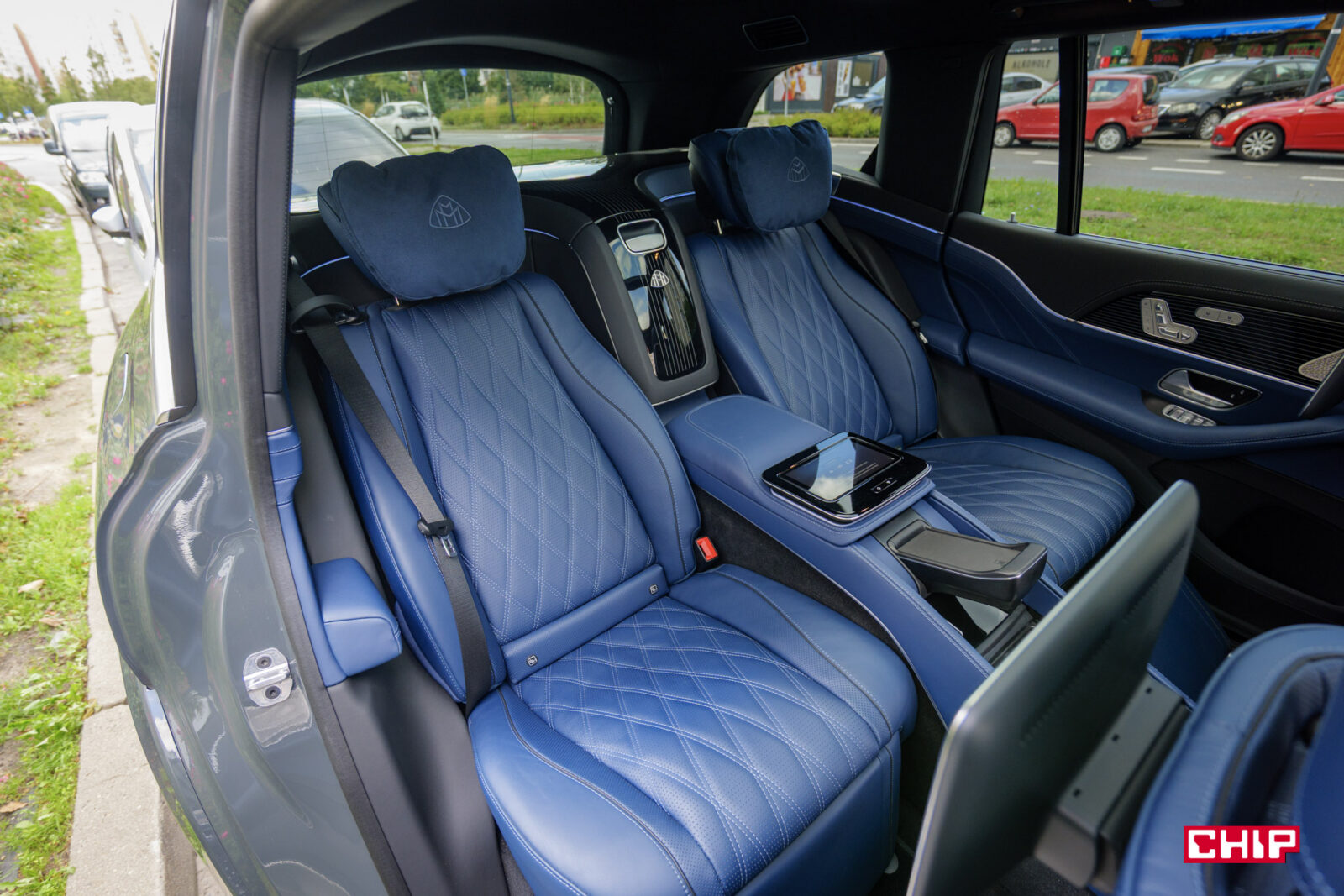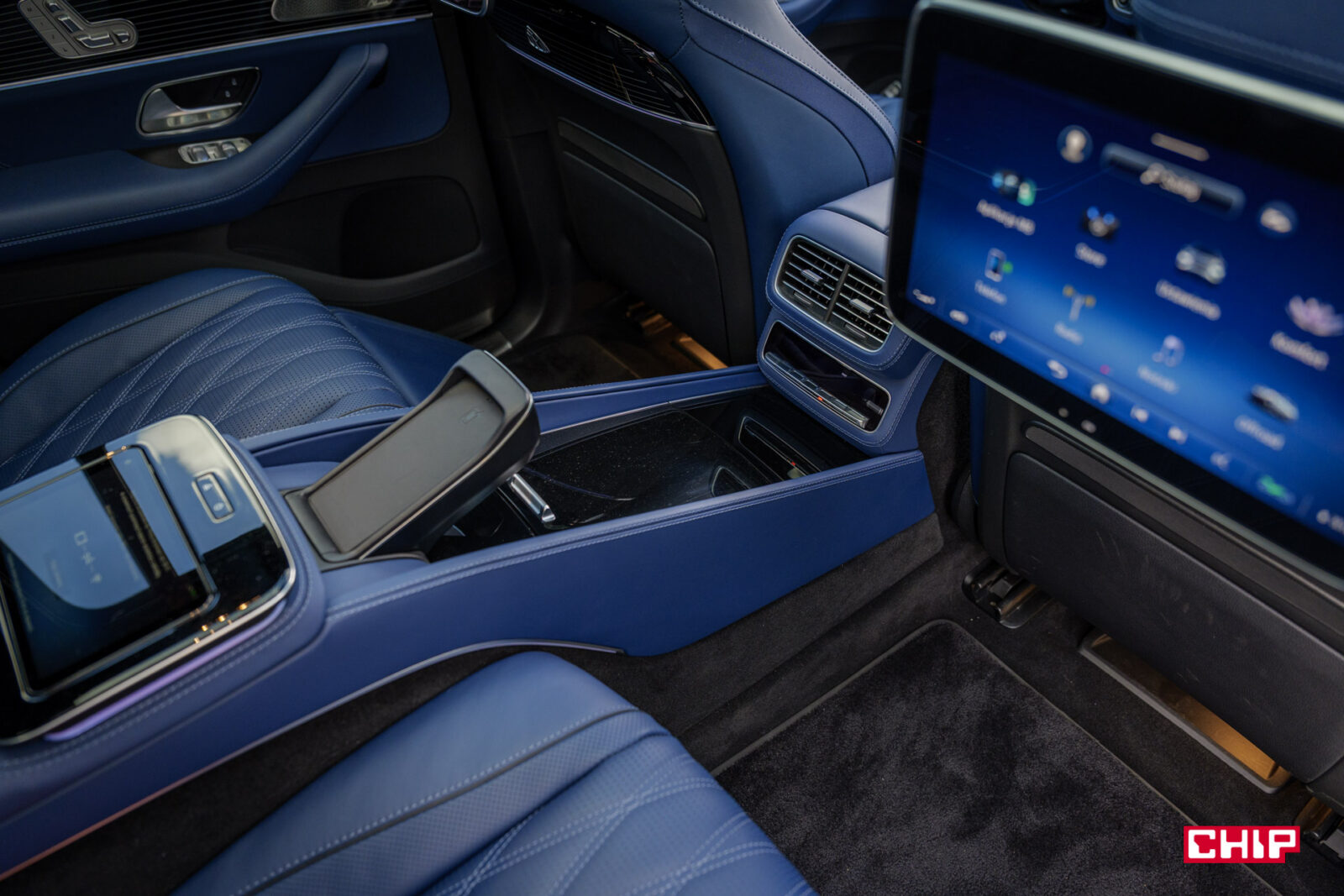 Dalej mamy – ekrany w zagłówkach, ładowarkę indukcyjną (mieszczącą największe smartfony), uchwyty na napoje z grzaniem i chłodzeniem, dodatkowy tablet do sterowania interfejsem, dwa porty USB-C, dwa porty HDMI, lodówkę, sterowanie roletą dachową i żaluzjami w bocznych szybach, rozkładane stoliki, dwie pary wysokiej jakości bezprzewodowych słuchawek (z możliwością podłączenia przewodowego) oraz kieliszki w lodówce, które w testowanym egzemplarzu niestety ktoś się nie bał i… podprowadził. Słowem – jest tu wszystko potrzebne do tego, aby poczuć się jak człowiek z zawodu prezes.