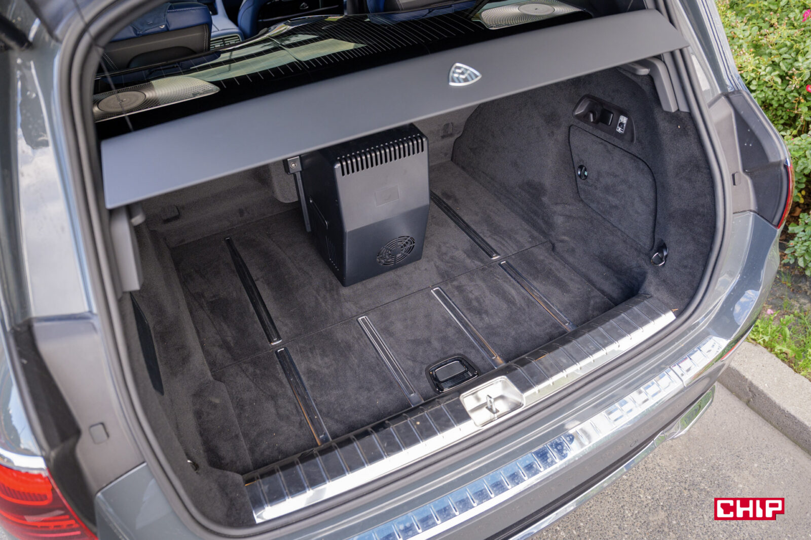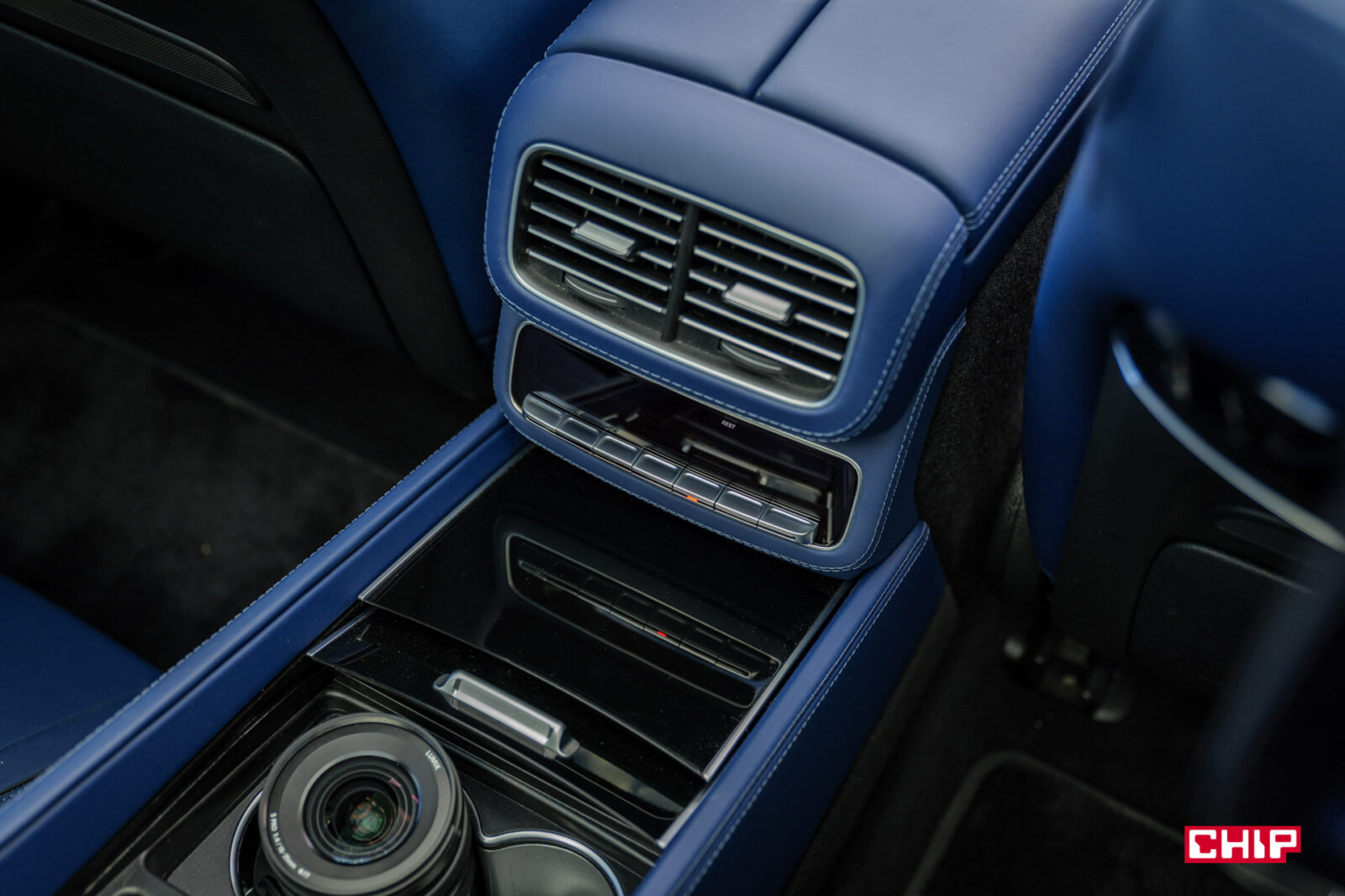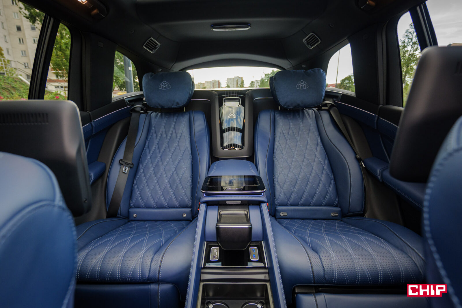 Dalej mamy – ekrany w zagłówkach, ładowarkę indukcyjną (mieszczącą największe smartfony), uchwyty na napoje z grzaniem i chłodzeniem, dodatkowy tablet do sterowania interfejsem, dwa porty USB-C, dwa porty HDMI, lodówkę, sterowanie roletą dachową i żaluzjami w bocznych szybach, rozkładane stoliki, dwie pary wysokiej jakości bezprzewodowych słuchawek (z możliwością podłączenia przewodowego) oraz kieliszki w lodówce, które w testowanym egzemplarzu niestety ktoś się nie bał i… podprowadził. Słowem – jest tu wszystko potrzebne do tego, aby poczuć się jak człowiek z zawodu prezes.