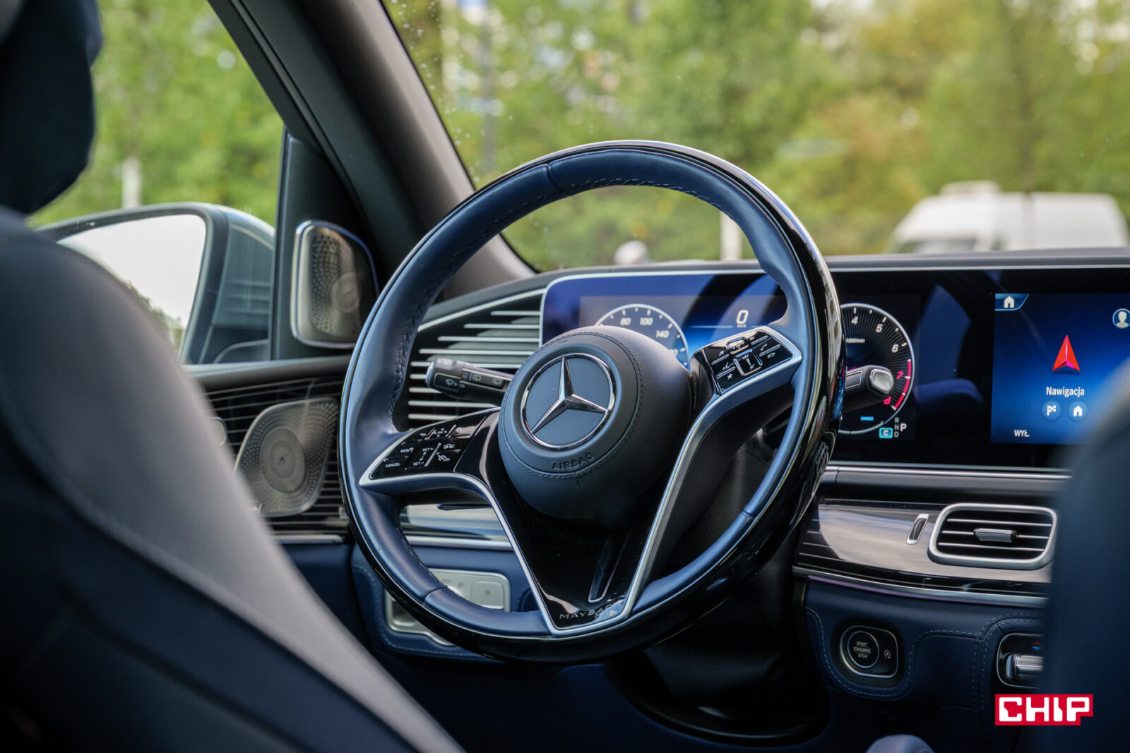 Wspomniany wcześniej brak usilnego usportowienia wizualnego daje nam do bólu elegancką kierownicę z logo Maybacha. W standardzie jest ona pokryta skórą Nappa, tutaj mamy kosztujący 3 396 zł wariant pokryty drewnem. Standardowo dla Mercedesa podgrzewanie kierownicy to dodatkowy wydatek – 1 497 zł, ale jest on dodawany do wyposażenia automatycznie, po wyborze jednego z bogatszych pakietów.