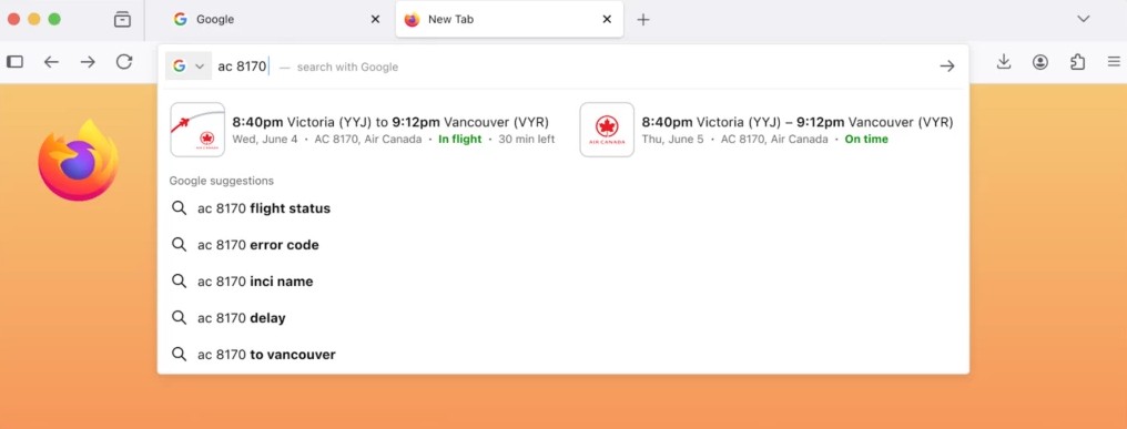 - Status lotu — wpisując numer lotu, np. „AC 8170”, natychmiast zobaczysz w pasku adresu trasę lotu, czasy odlotu i przylotu oraz aktualny status.