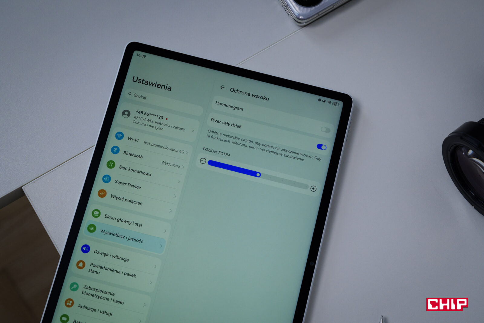Dodatkowo Huawei MatePad 12 X 2025 ma dwie ciekawe funkcje, które pozytywnie wpływają na nasz wzrok. Pierwszy to Ochrona wzroku. Możemy ją włączyć na stałe lub wprowadzić harmonogram i funkcja uruchomi się automatycznie np. po godzinie 22. Jeśli korzystacie z tabletu późnym wieczorem, a dobrze wiemy, że korzystacie, to dzięki temu Wasze oczy będą mniej zmęczone przed snem.