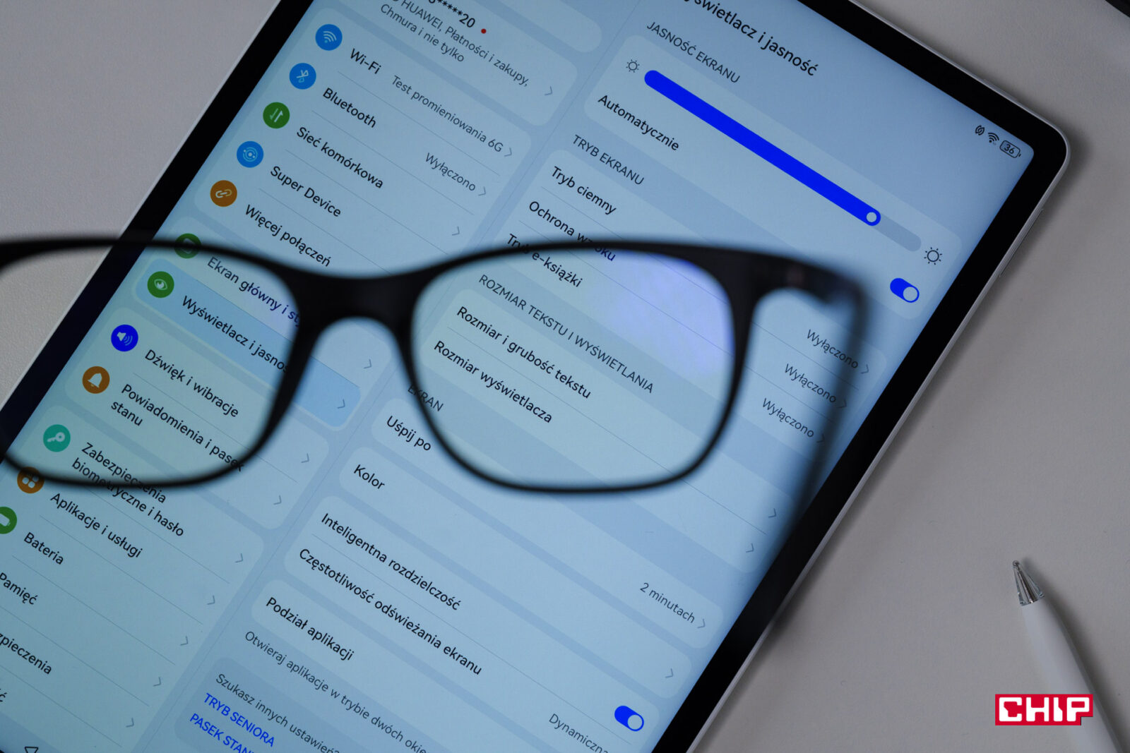 A tutaj mamy widok ekranu tabletu Huawei przez te same okulary. Jak widzicie – kompletnie nic się nie zmienia w kolorach, co jasno nam pokazuje niską emisję światła niebieskiego.