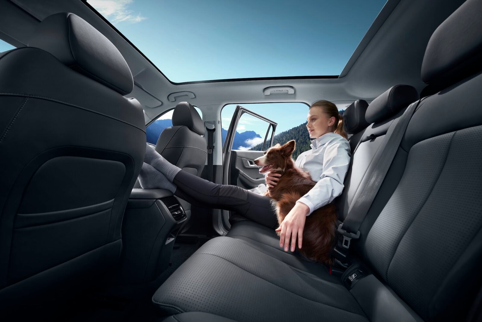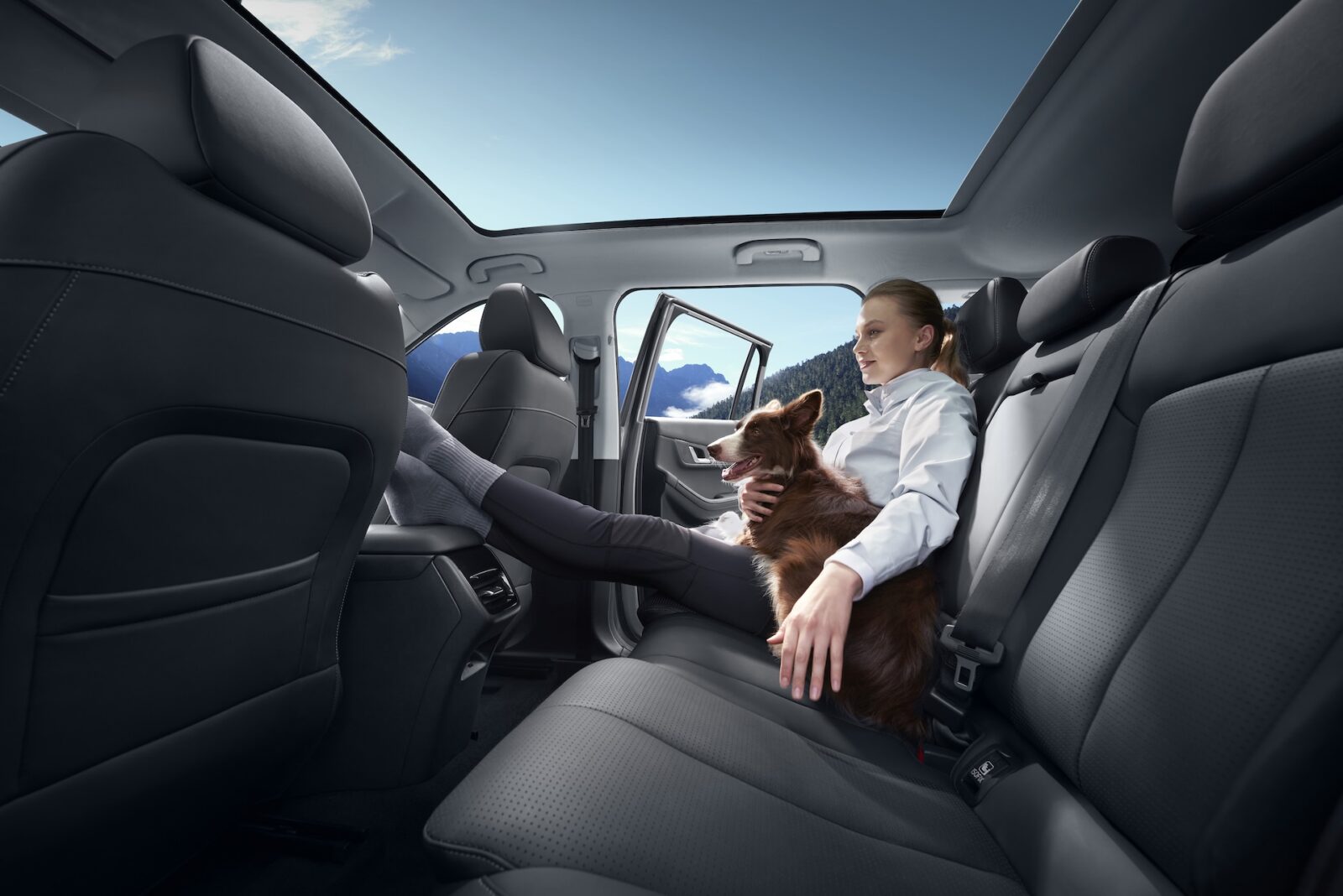 Wnętrza są nie tylko przyjazne zwierzakom, ale też bardzo nowoczesne. Na desce rozdzielczej znajdziemy ekran główny o przekątnej 13,2 cala, na którym możemy wyświetlić interfejs Android Auto lub Apple CarPlay, które działają bezprzewodowo i jest to dostępne w standardzie. Ekran kierowcy ma przekątną 8,9 cala i jest to w pełni cyfrowy kokpit. Wnętrza są też bardzo praktyczne, bo znajdziemy w nich aż 35 różnych schowków i uchwytów. Do tego mamy boczne szyby z izolacją akustyczną, 5-warstwowe, bardzo miękkie fotele oraz największy w swojej klasie, opcjonalny dach panoramiczny o powierzchni 1,45 m2.