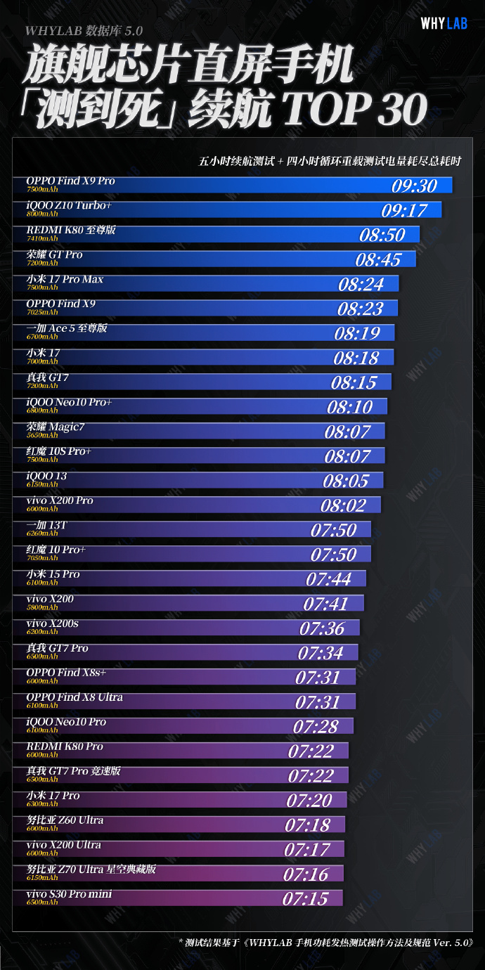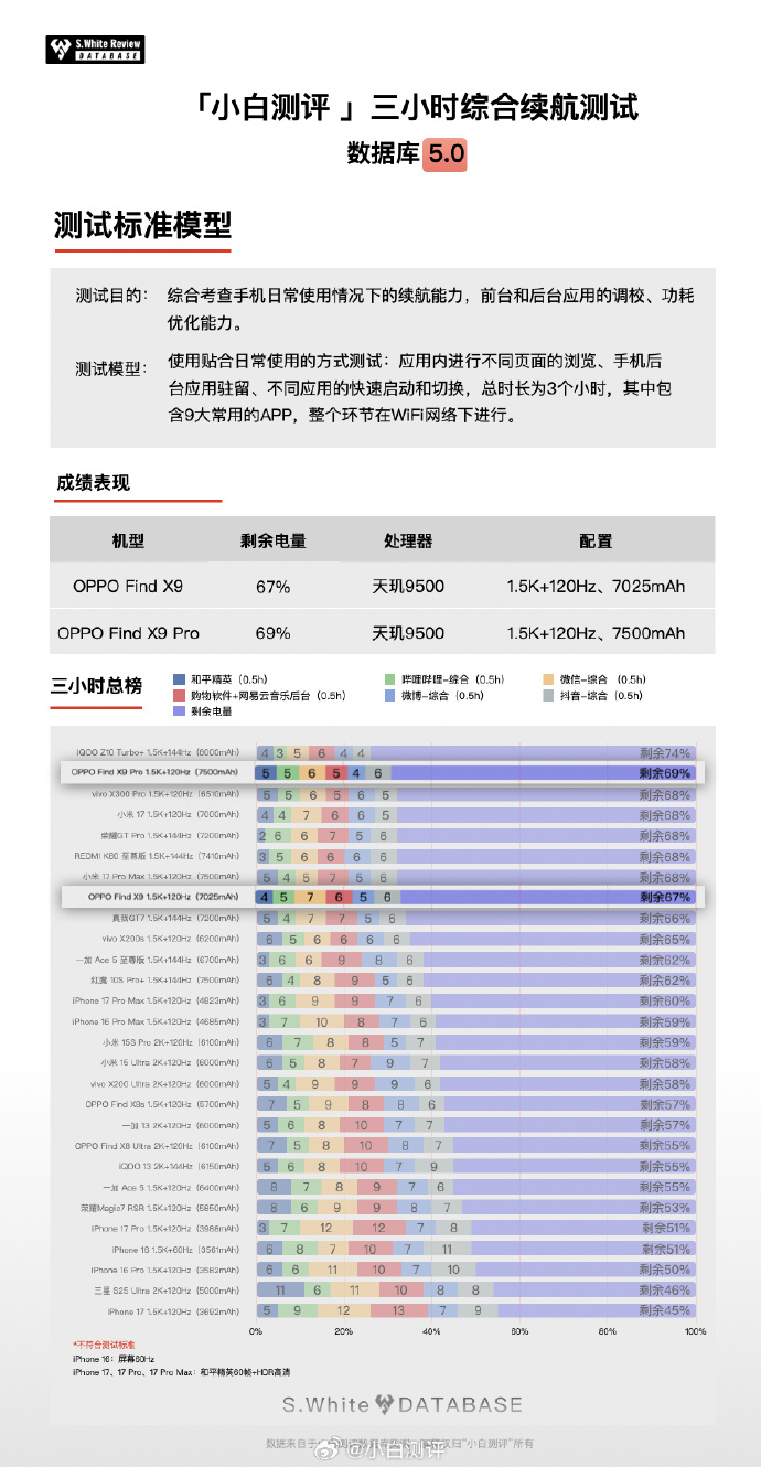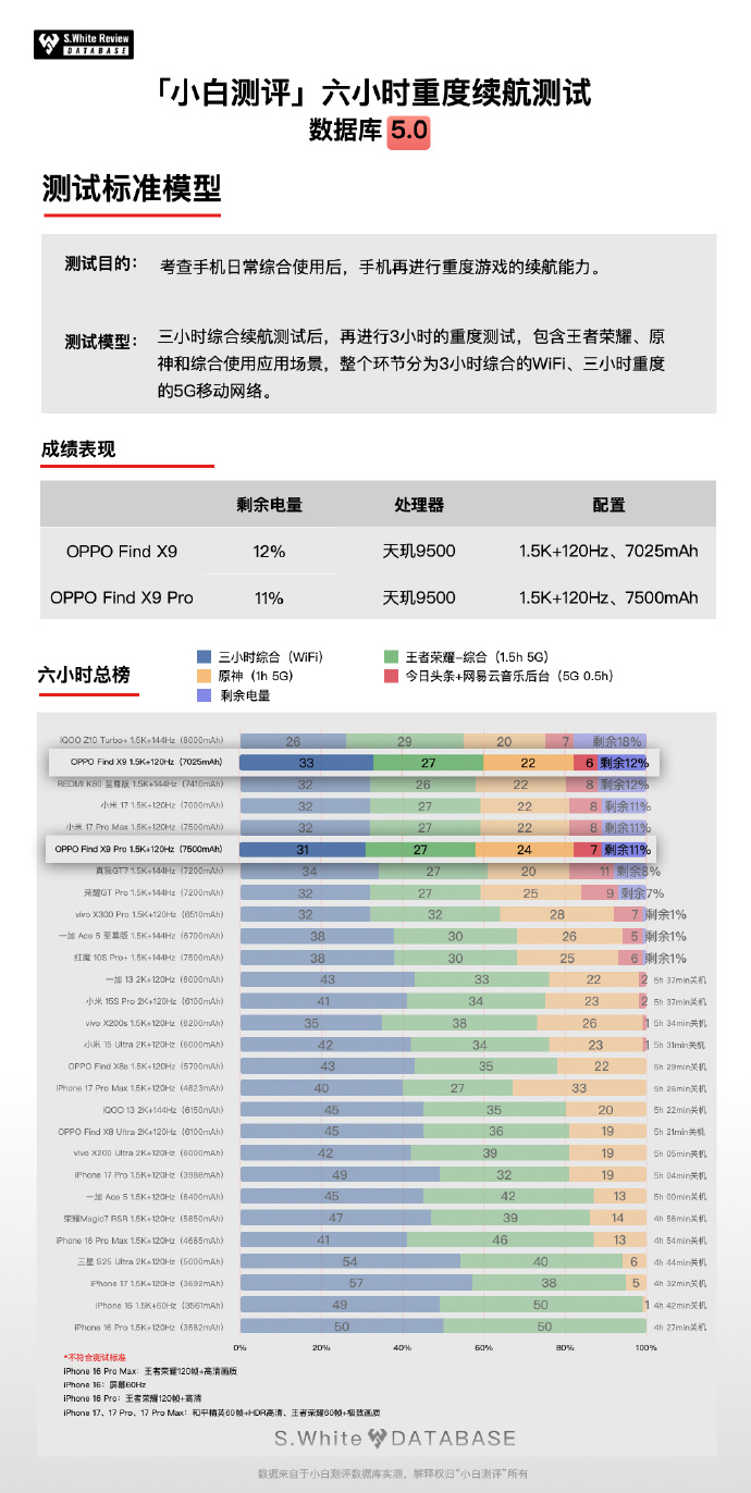 Co więcej, nawet standardowy Oppo Find X9 z mniejszą baterią (7025 mAh) zdołał delikatnie wyprzedzić Xiaomi, osiągając 6 godzin i 51 minut.