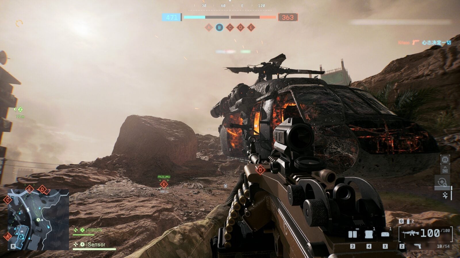 Jeśli zaś idzie o tryby gry, to najbardziej wciągnęło mnie to, jak gra radzi sobie z tempem na łącznie dziewięciu dostępnych aktualnie mapach. Tryby są stare i nowe, a wśród nich Conquest i Breakthrough prowadzą front spokojniej, Rush i Domination trzymają drużynę w krótszych zrywach, a całkiem nowa Eskalacja robi rzecz zaskakująco filmową – im dalej w las, tym mapa dosłownie się kurczy, bo kolejne punkty znikają z puli i cała walka zagęszcza się wokół kilku ostatnich celów. Kiedy oba zespoły idą łeb w łeb, ostatnie minuty to gęsty dym, gruz, zawalające się ściany i ten specyficzny rodzaj desperacji, o który w sieciowych shooterach dziś coraz trudniej.