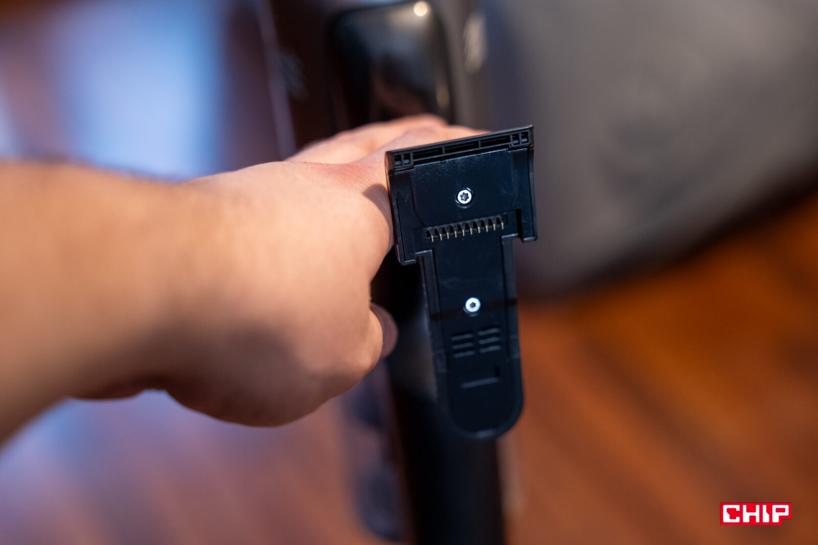 Nim dotrzemy do odkurzacza, naszym oczom ukaże się stacja dokująca o wymiarach mniej więcej 34 na 28 centymetrów (szerokość). Podejrzewam, że sama w sobie waży z połowę masy, co ma sens. To to samo, plastikowe rozwiązanie, które jednak jest na tyle zwarte i dobrze trzyma się na podłodze, nie ruszając się na boki nawet wtedy, gdy nie odkładamy urządzenia precyzyjnie na dok do ładowania. Aby uzyskać funkcję ładowania, musimy połączyć podstawę z pionowym elementem, co wieńczy satysfakcjonujące kliknięcie.