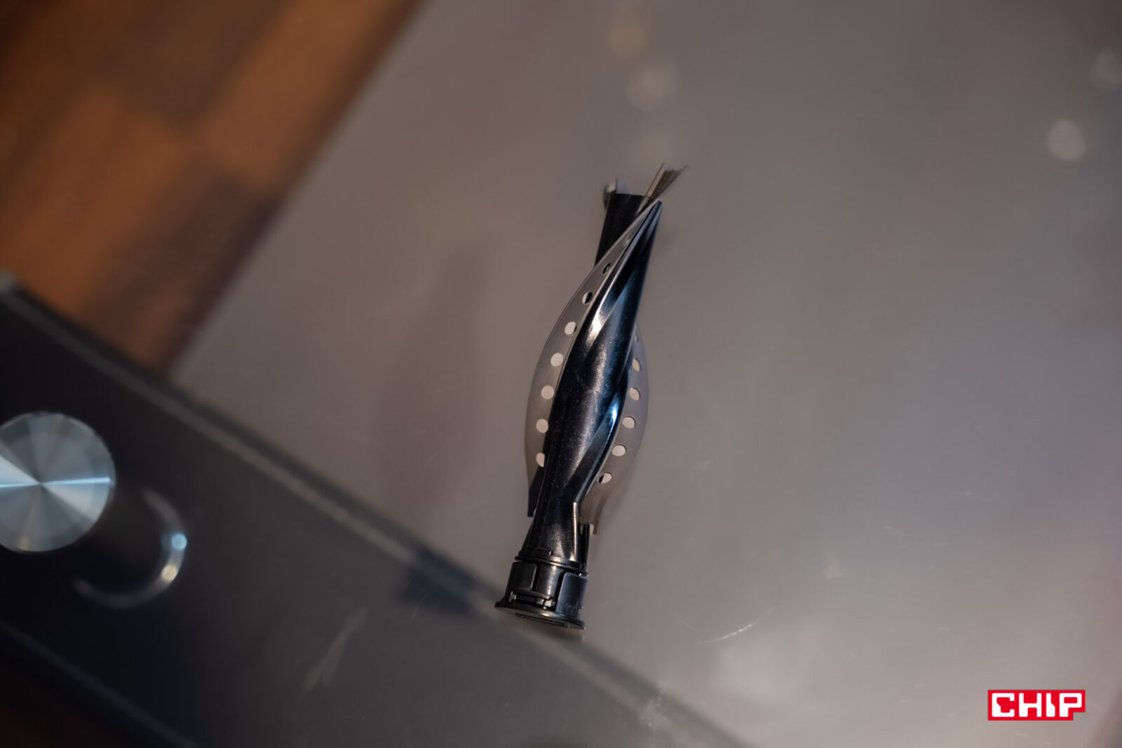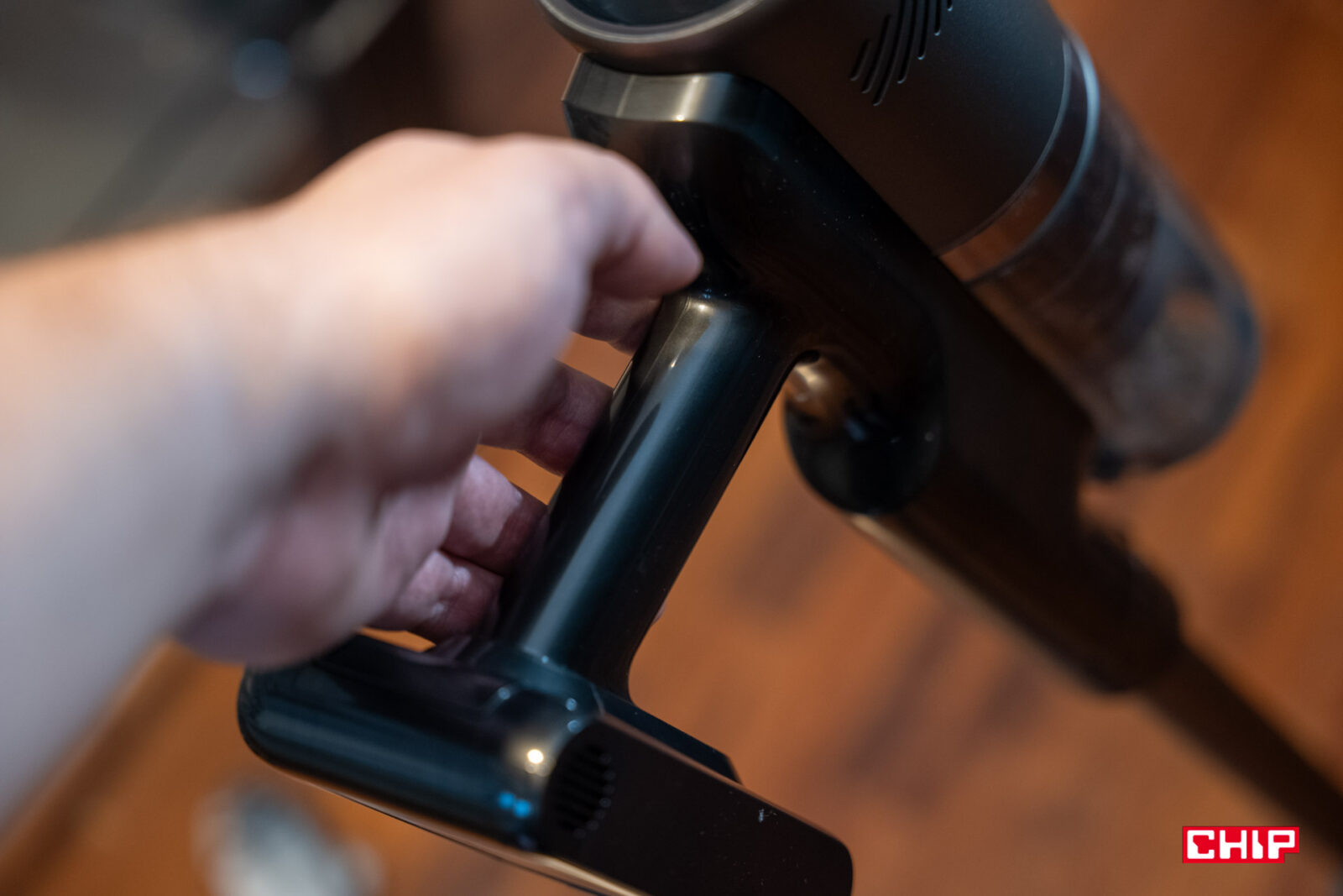 Zacznijmy od rękojeści, która jednocześnie łączy korpus z baterią. Sama w sobie jest dość smukła i przy większych dłoniach może nie być aż tak łatwa w trzymaniu, ale jak na moje i tak niemałe dłonie, całość trzymało się dobrze. Bateria odpowiada za rozsądną przeciwwagę dla korpusu, a wyloty powietrza umieszczono tak, że nie wieją na nas ani na dłoń podczas ruchów. Całością manewruje się dobrze, niezależnie od założonej końcówki. Nie mamy tu oparcia pod nasze palce, ale nie jest ono potrzebne, bo całość nie wyślizguje się z dłoni.