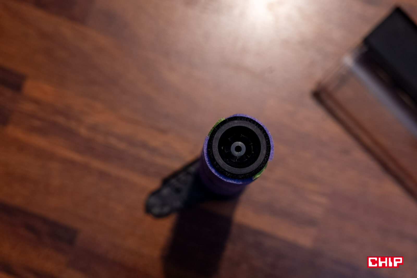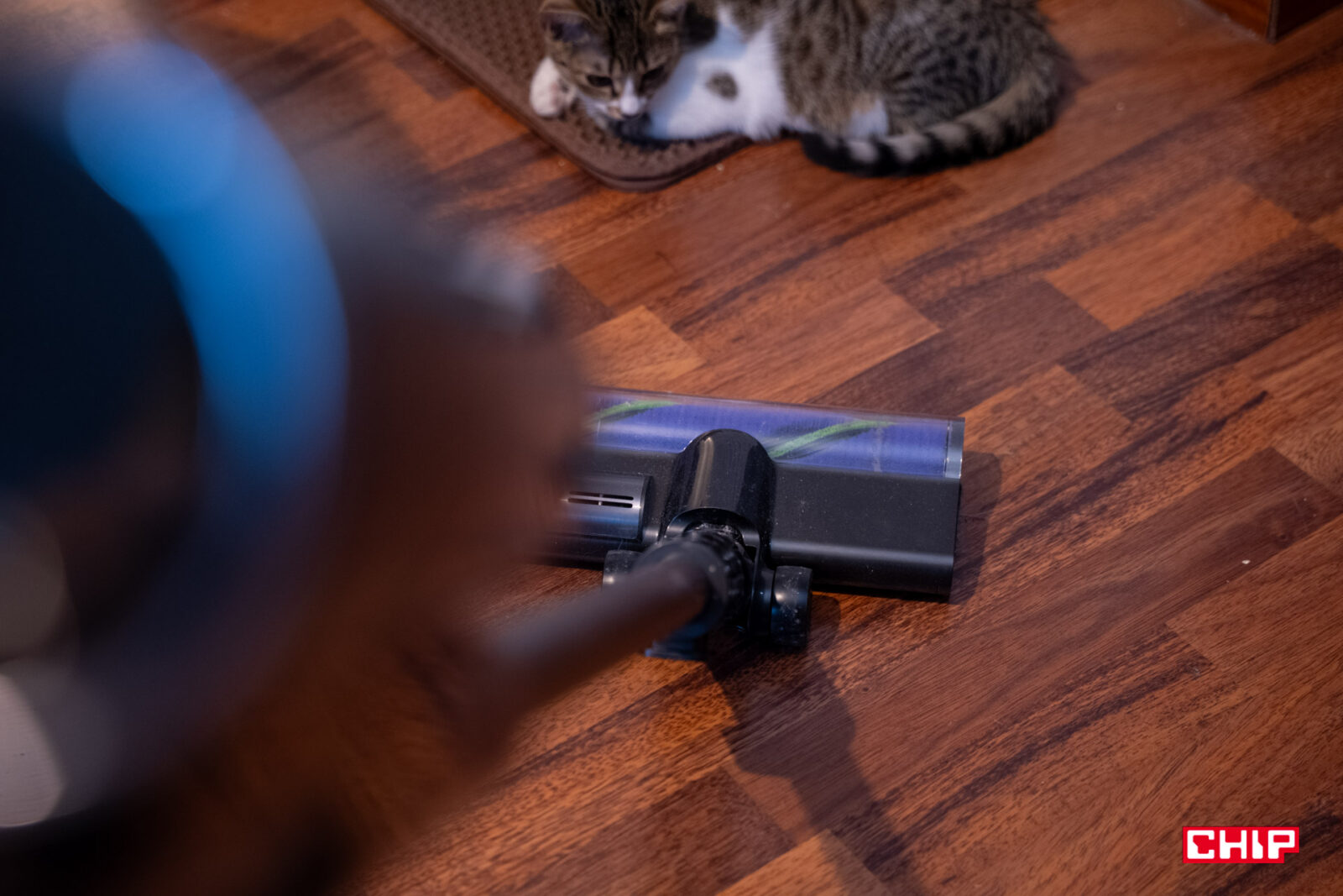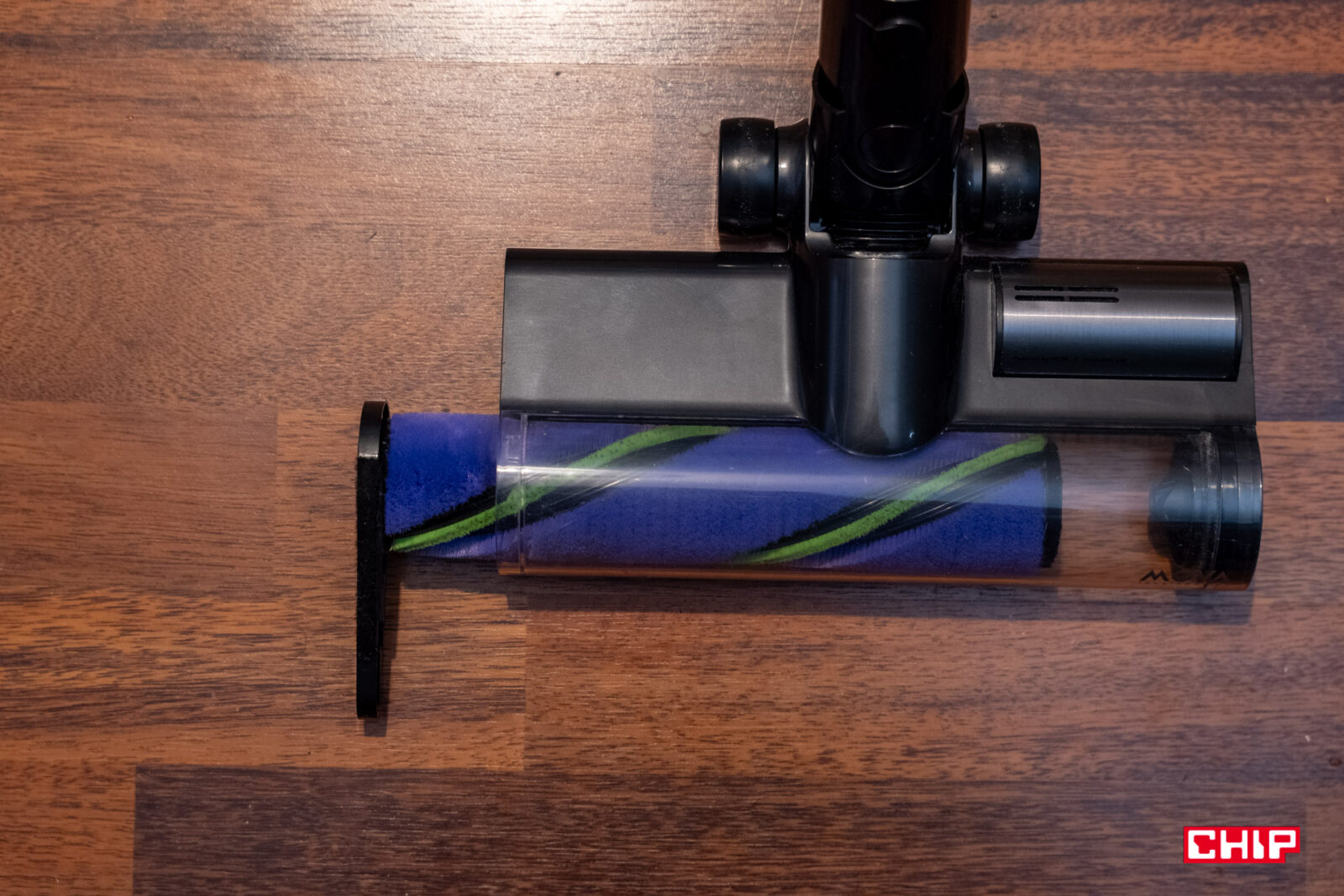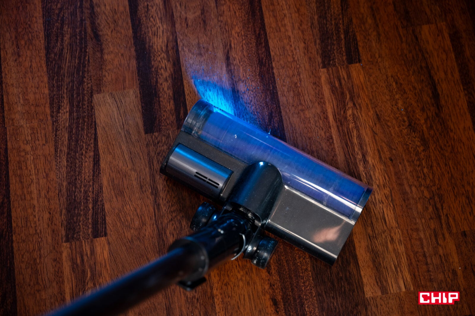 Zacznijmy od plusów, a do tych niewątpliwie należy podświetlenie OptiInsight, lub, bez marketingowej nazwy, błękitne światło znajdujące się w rogu szczotki wielofunkcyjnej, które rozprzestrzenia się pod kątem 140 stopni. Zarówno jego kolor, jak i moc pozwalają wymiernie dostrzec rezultaty naszego sprzątania. Inaczej niż w przypadku spotykanych u konkurencji zwykłych pasków LED, ta struga światła niemal przykleja się do podłogi i wyraźnie pokazuje, co się na niej dzieje. Byłem w szoku, gdy zobaczyłem brud, którego nie sposób było dostrzec w inny sposób. Jeśli macie zwykłą szczotkę z podstawowym podświetleniem, odczujecie gigantyczną różnicę w precyzji.