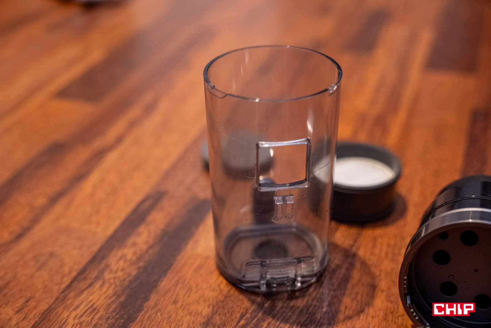 Korpus, jak na odkurzacze, prezentuje się dość kompaktowo. W oczy rzuca się pojemnik o pojemności 0,35 litra. To stosunkowo niedużo i na początku obawiałem się o to, czy da się tym w ogóle coś posprzątać. O tym napiszę później, ale cieszy, że system czyszczenia i demontażu jest tu tak samo prosty jak w droższych odkurzaczach. Wystarczy nacisnąć boczny przycisk, by wyjąć pojemnik, a następnie chwycić rękojeść u góry, by odkręcić część z filtrem. To znacząco upraszcza proces czyszczenia, w szczególności, gdy w grę wchodzi usuwanie zawijających się włosów.