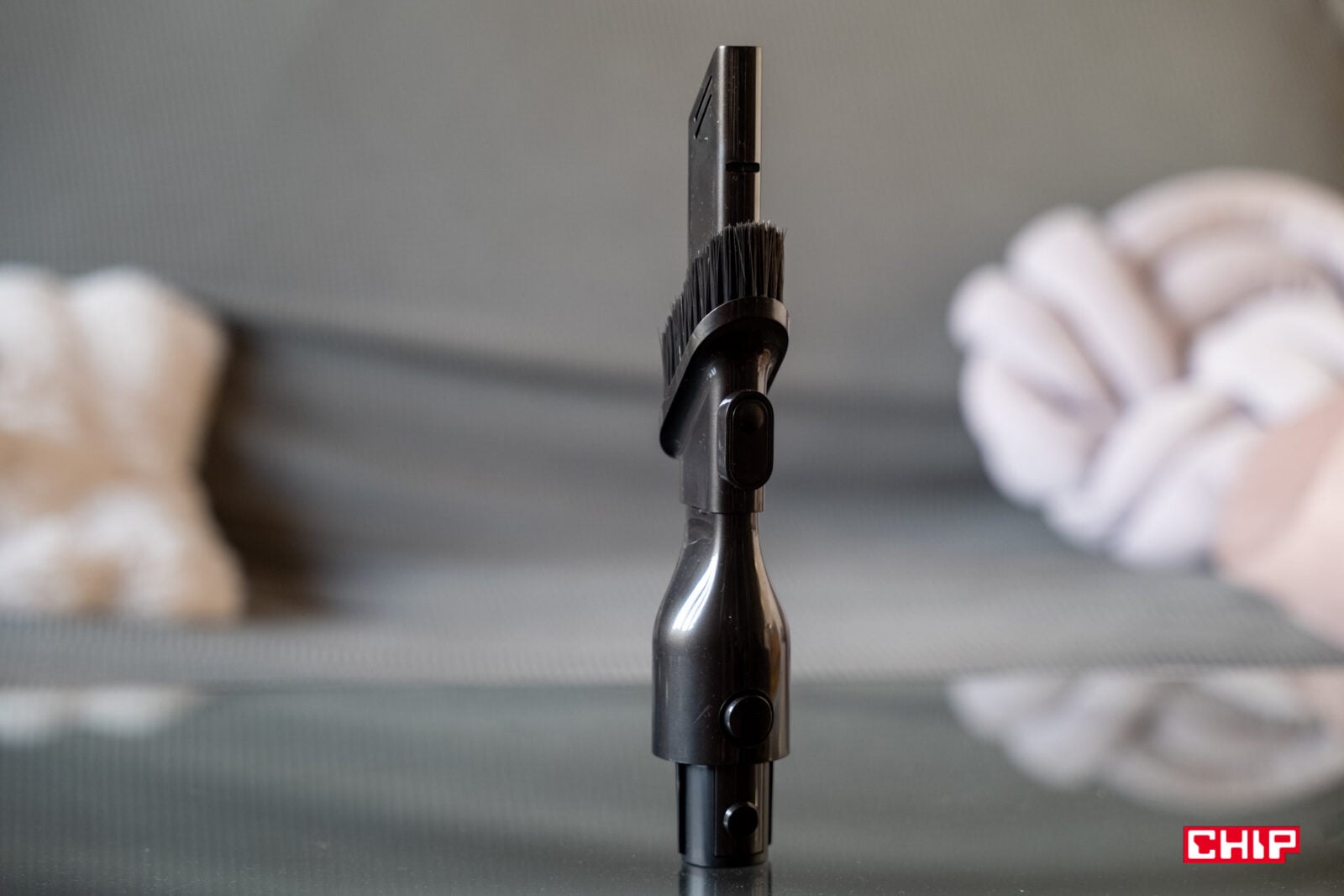 Później znajdziemy sam odkurzacz z podczepioną do niego baterią, ale także i końcówki pozwalające przeistoczyć go w znacznie mniejsze urządzenie. Elektryczna miniszczotka ma pozwolić na pracę na dywanach i materiałach, a uniwersalne narzędzie z przesuwaną szczotką pozwoli docierać do wąskich krawędzi i fragmentów za meblami. Szkoda, że producent nie pokusił się dorzucenie do zestawu elastycznej rury, ale za tę cenę i tak nie jest źle.