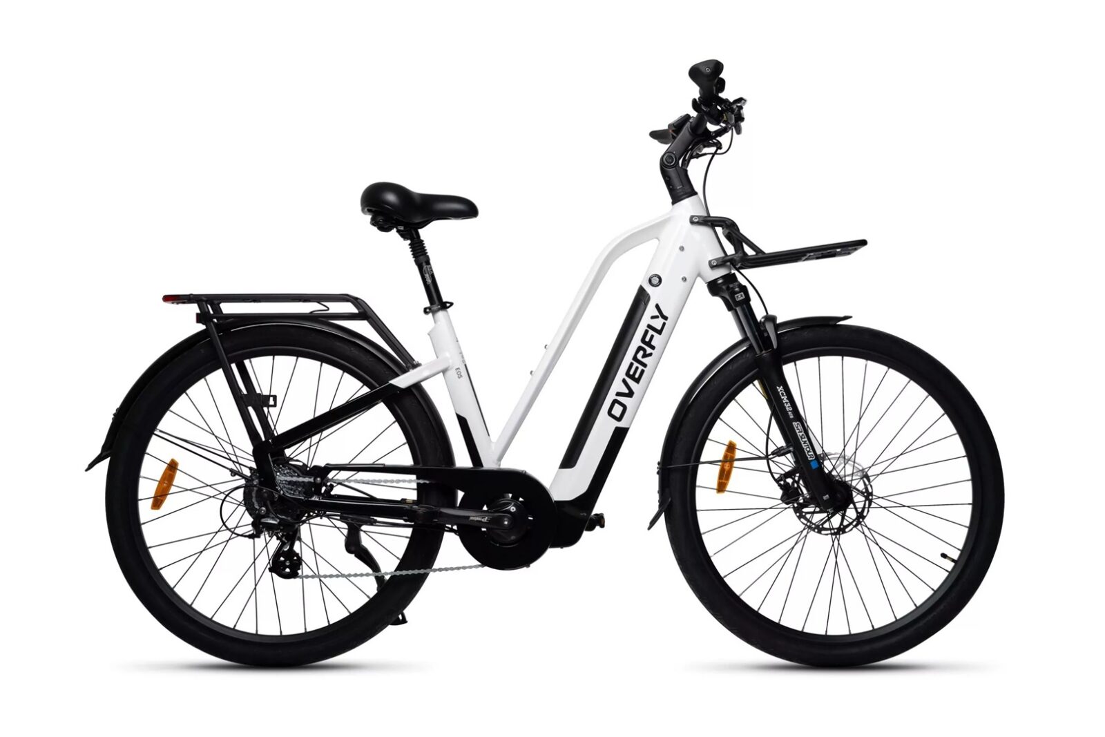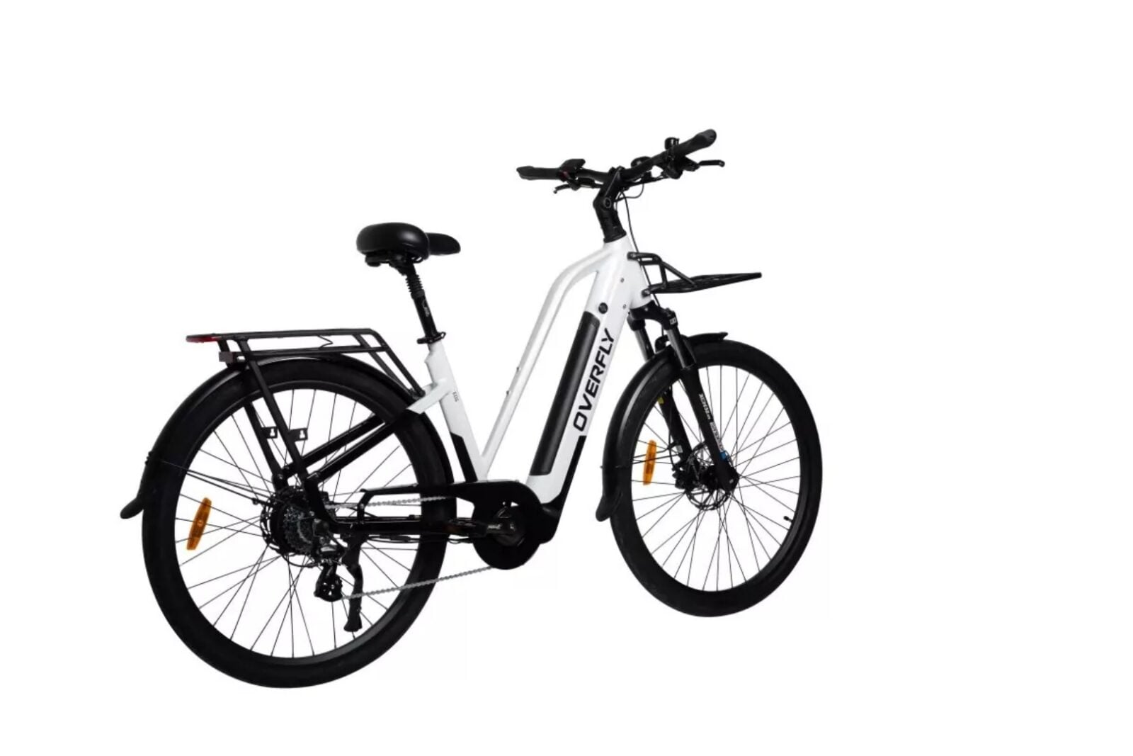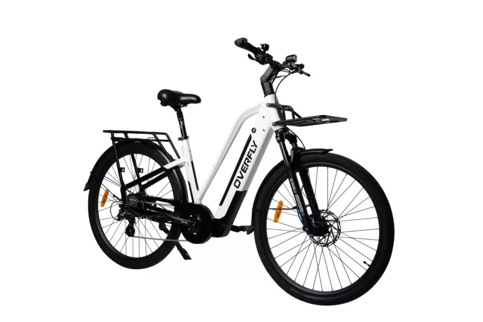 Podstawę roweru Overfly Eos stanowi aluminiowa rama o rozmiarze 17 cali z podwójną rurą środkową i charakterystycznym niskim przekrokiem, który ułatwia codzienne użytkowanie w warunkach miejskich. Całość opiera się na 28-calowych kołach z oponami CST o przekroju 2.0 cala, co z kolei powinno zapewnić stabilność na różnych nawierzchniach. Napęd stanowi zaś silnik 48-V Shengyi zlokalizowany w piaście tylnego koła i generujący moment obrotowy na poziomie 50 Nm z pięcioma poziomami do wybrania z poziomu kontrolera na kierownicy z wyświetlaczem LCD. Taki silnik nie bije więc rekordów, ale do miejskiej jazdy będzie idealny. Tyczy się to również hydraulicznych hamulców tarczowych Tektro o średnicy 160 mm.