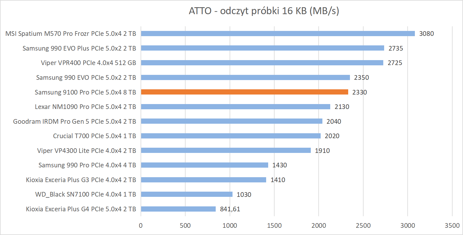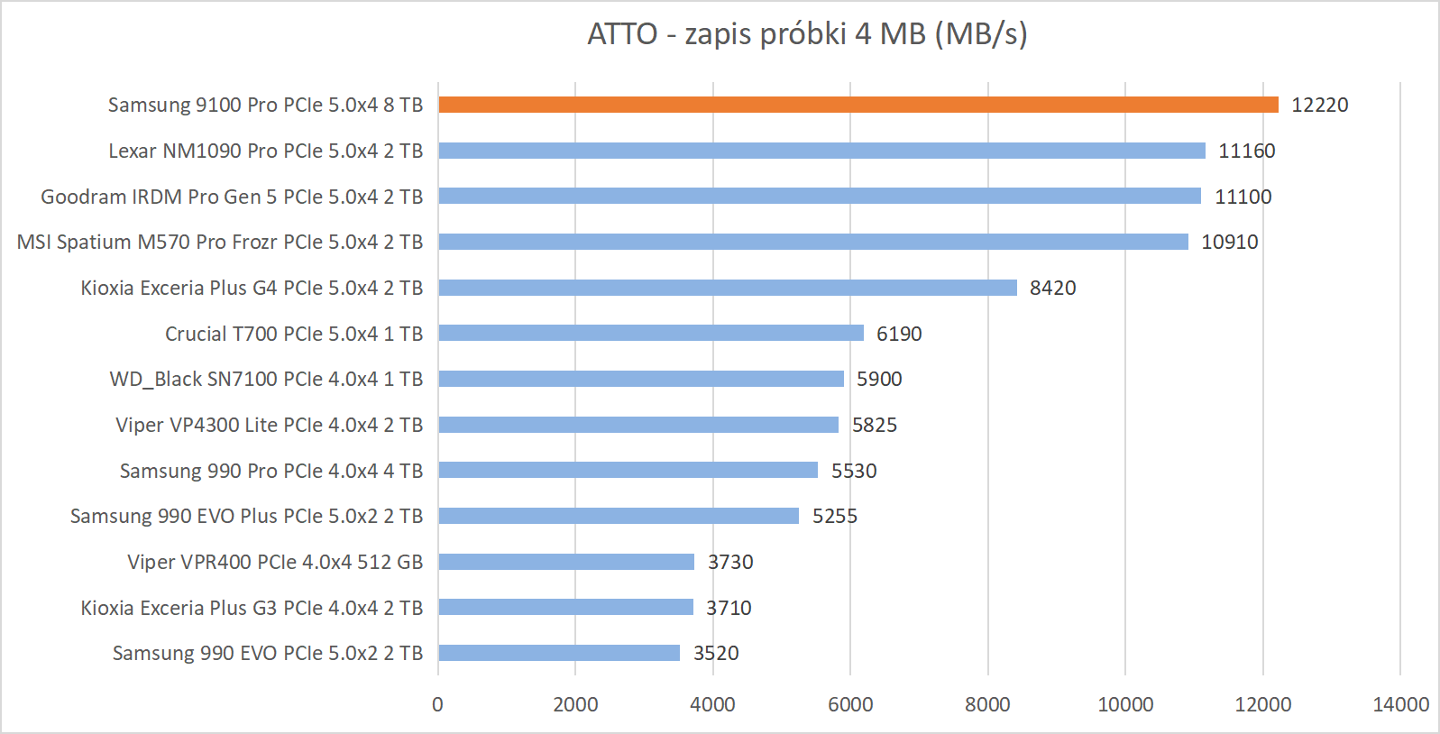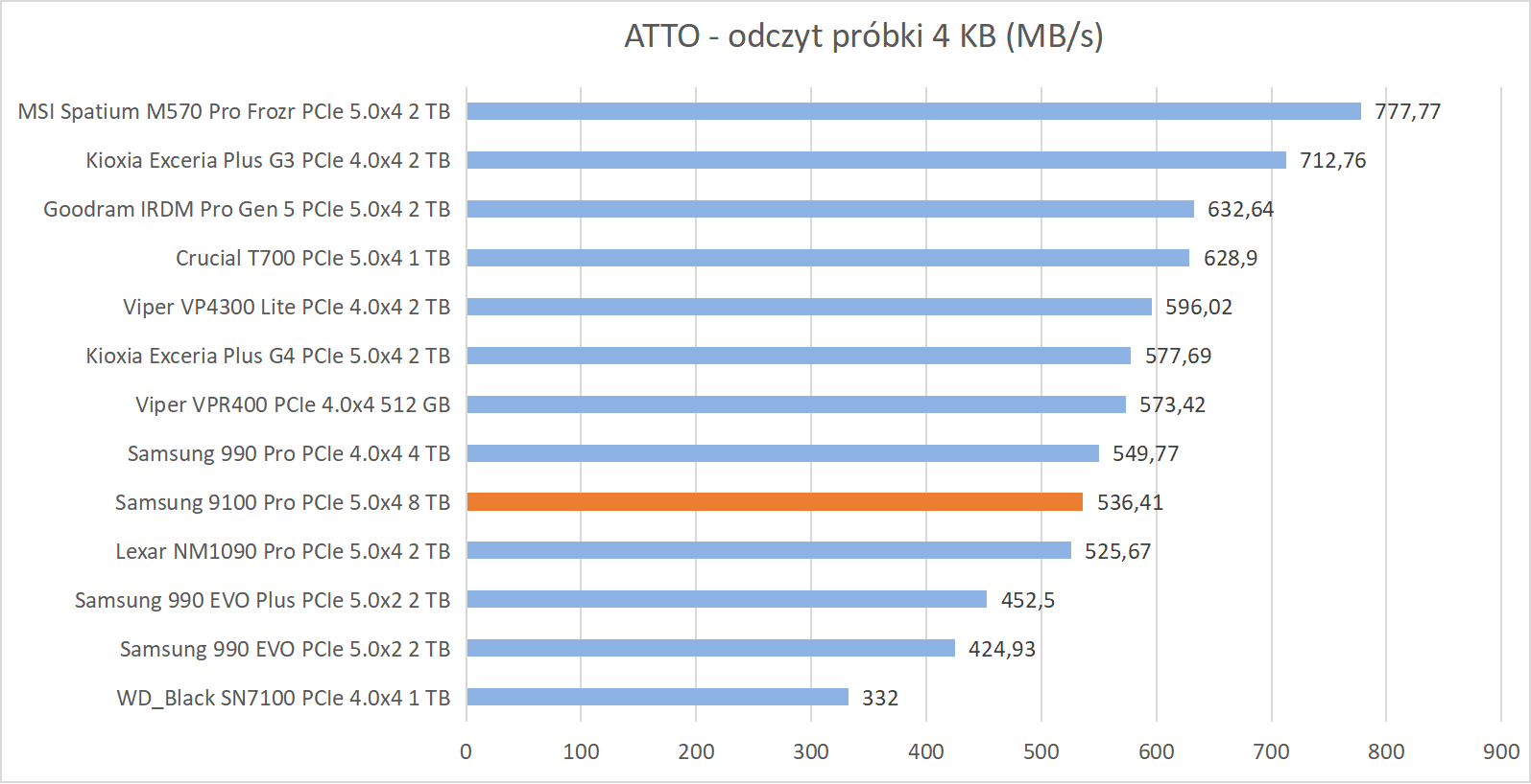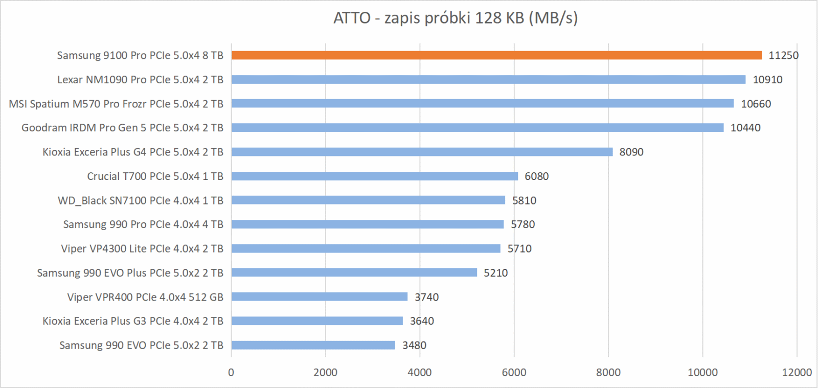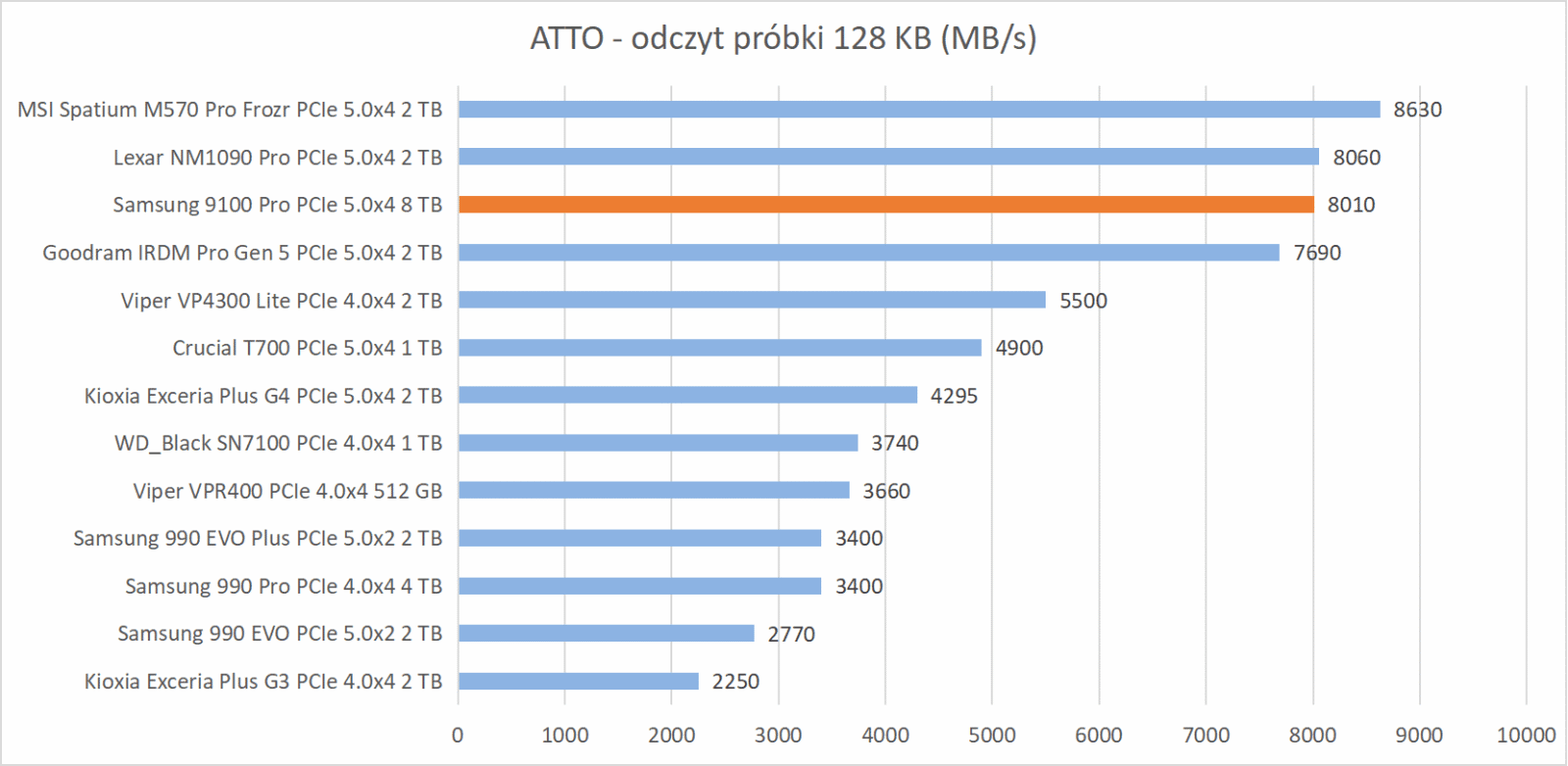 Syntetyczne testy pozwalają nam wstępnie ocenić możliwości danego dysku. Według pomiarów wykonanych w Crystal Disk Mark 8 oraz ATTO Disc Benchmark, dysk Samsung 9100 Pro 8 TB rzeczywiście można uznać za flagowego, bo w większości pomiarów znajduje się na podium, choć zdarzają się mu gorsze momenty w zapisie