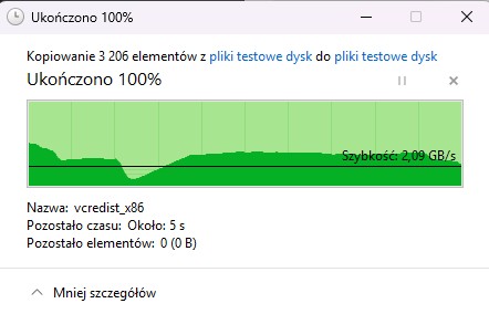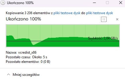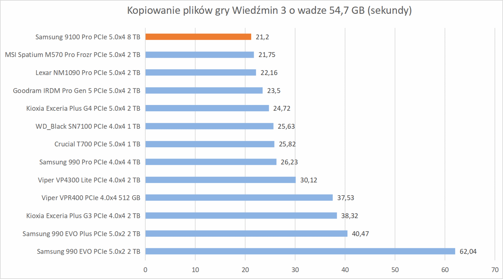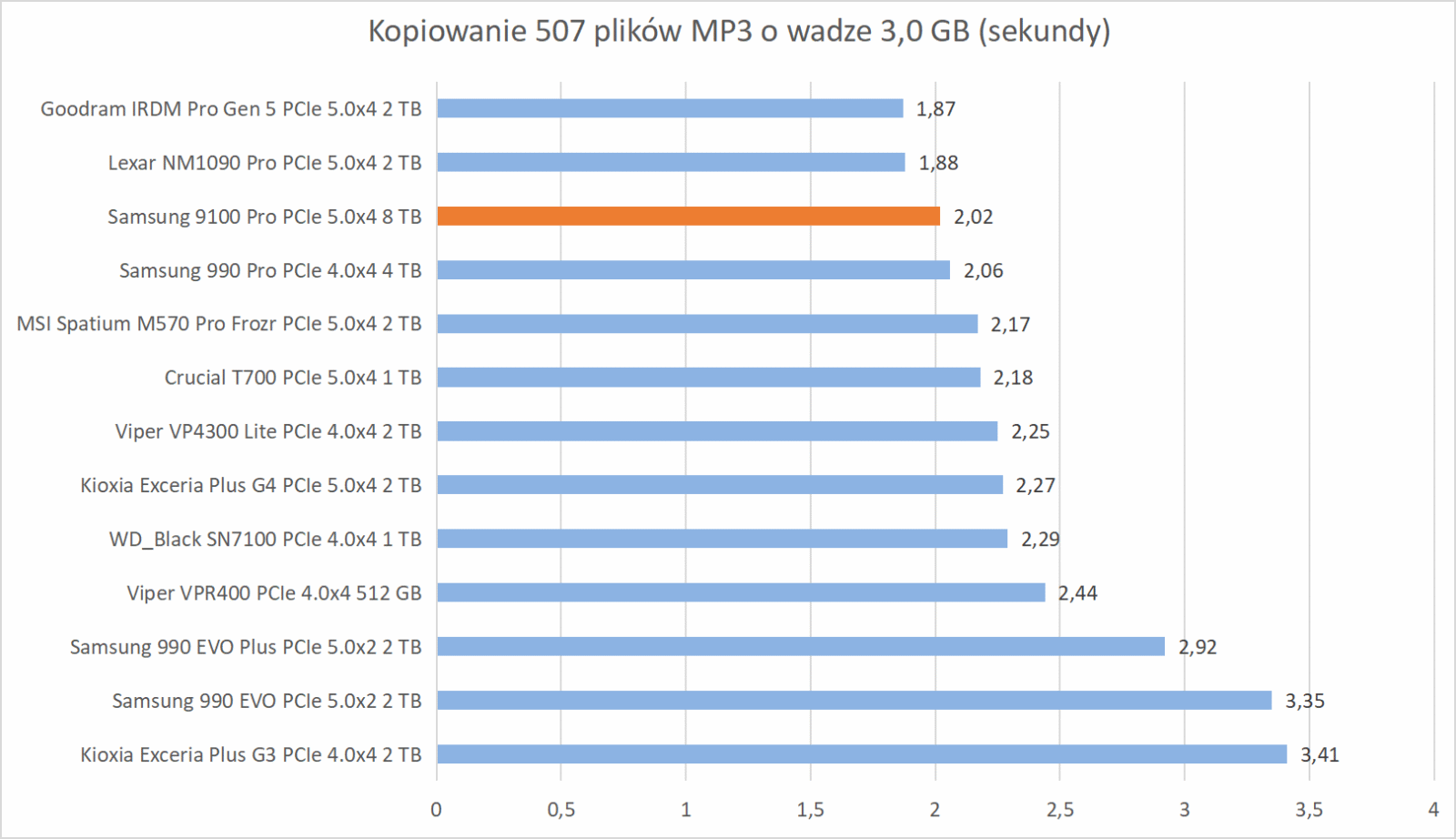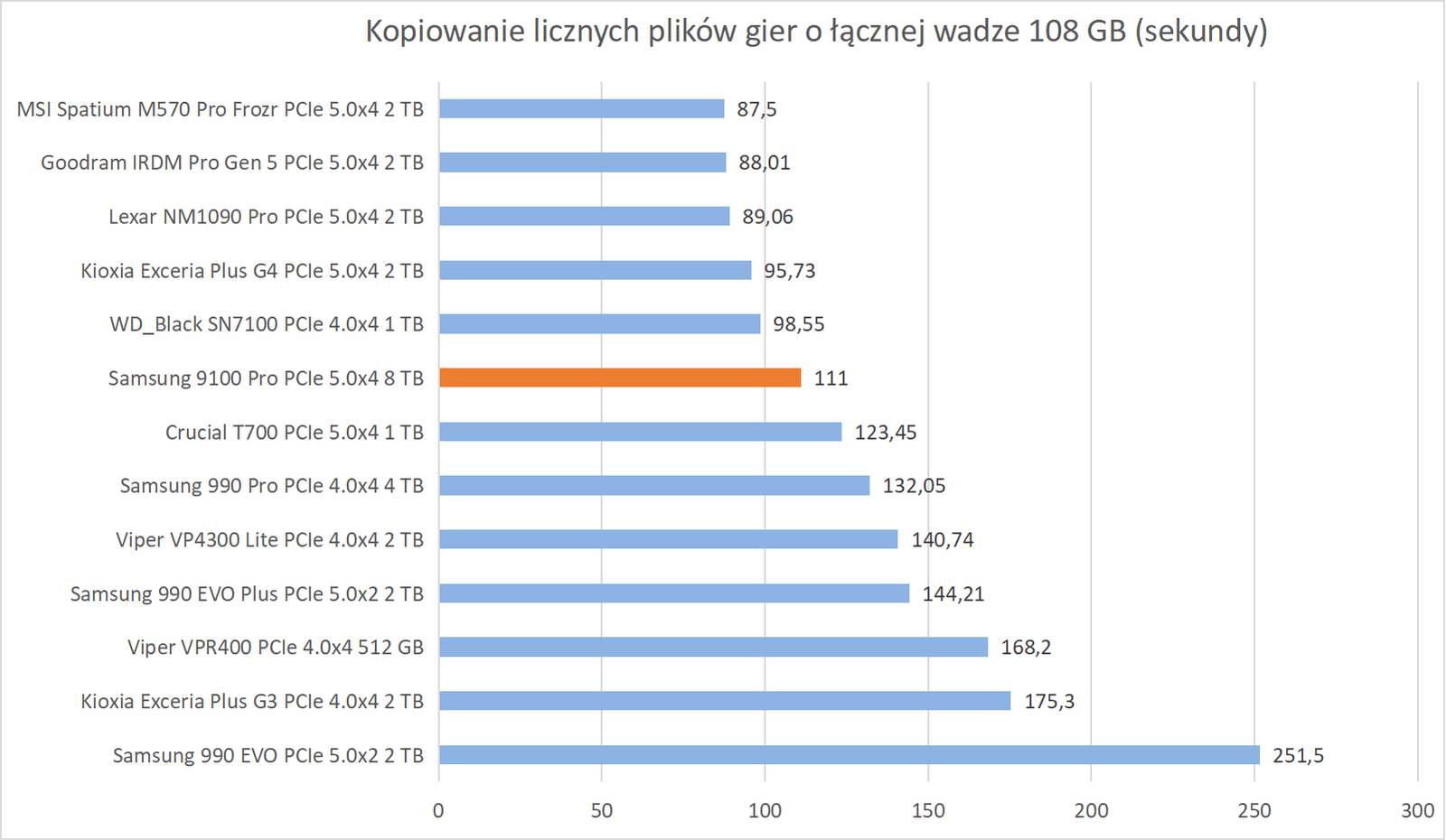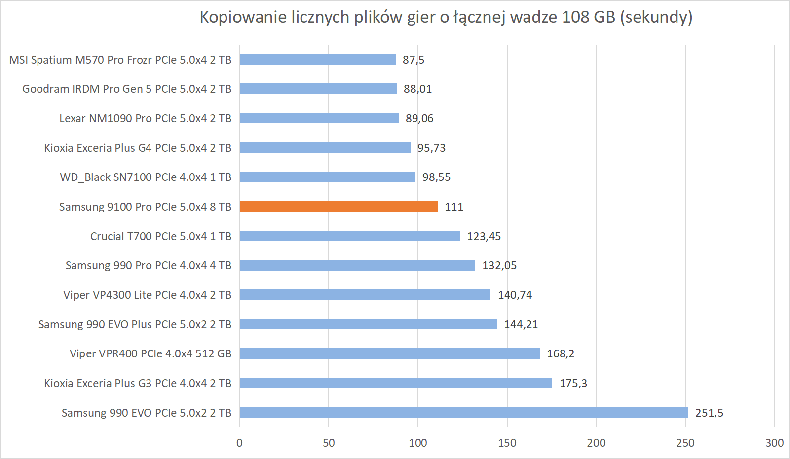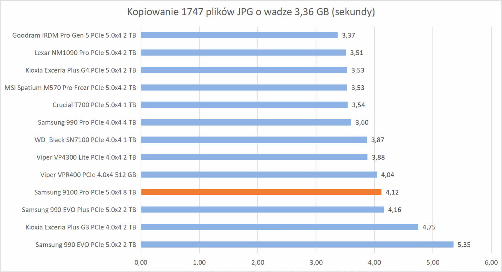 Chociaż Samsung 9100 Pro 8 TB spisał się najlepiej przy kopiowaniu dużych paczek plików, tak wyzwanie przenoszenia ogromnego folderu z mnóstwem mniejszych plików, stanowiło dla niego wyzwanie, któremu konkurencja sprostała znacznie lepiej.