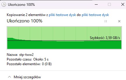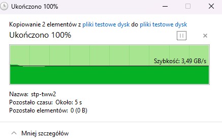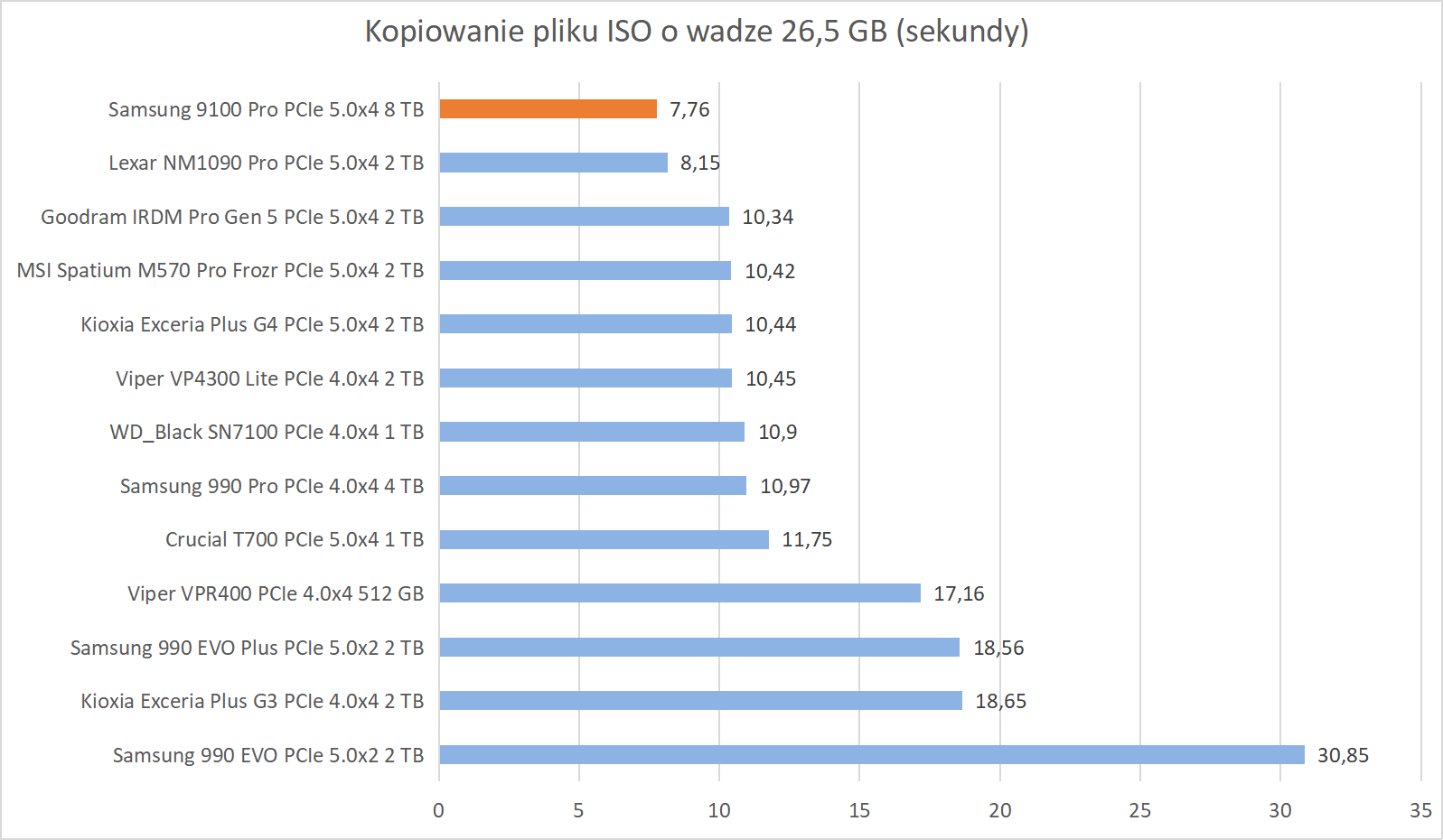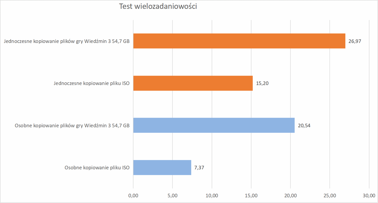 Zlecenie kilku transferów jednocześnie skraca czas o około 5%. Niewiele? Jak najbardziej, bo w idealnej sytuacji Samsung 9100 Pro 8 TB powinien poradzić sobie z zadaniami w czasie nieco krótszym, ale w przypadku dysków na PCIe 5.0 testy wielozadaniowości zwykle nie przynoszą spektakularnych wyników.