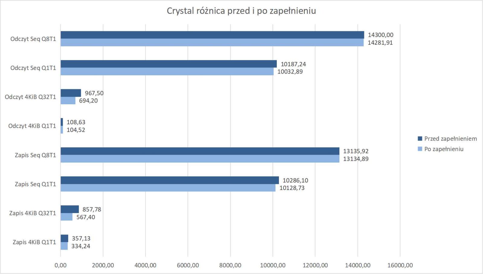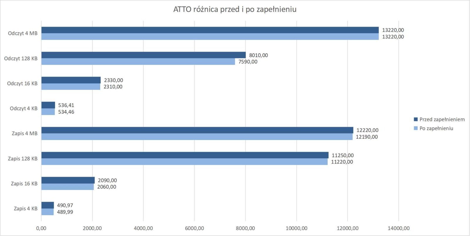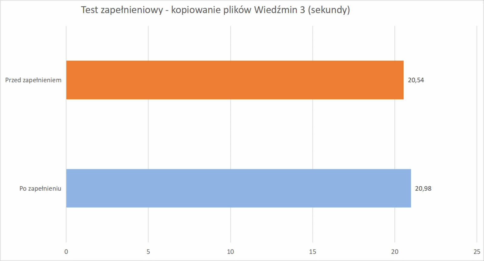 Spadek delikatny, ale ciągle zauważalny. Nie musicie jednak przejmować się tym, że po zapełnieniu dysku do prawie 100%, ten stanie się jedynie cieniem swojego “dawnego “niepełnego” siebie. Potwierdzają to testy syntetyczne oraz praktyczne.