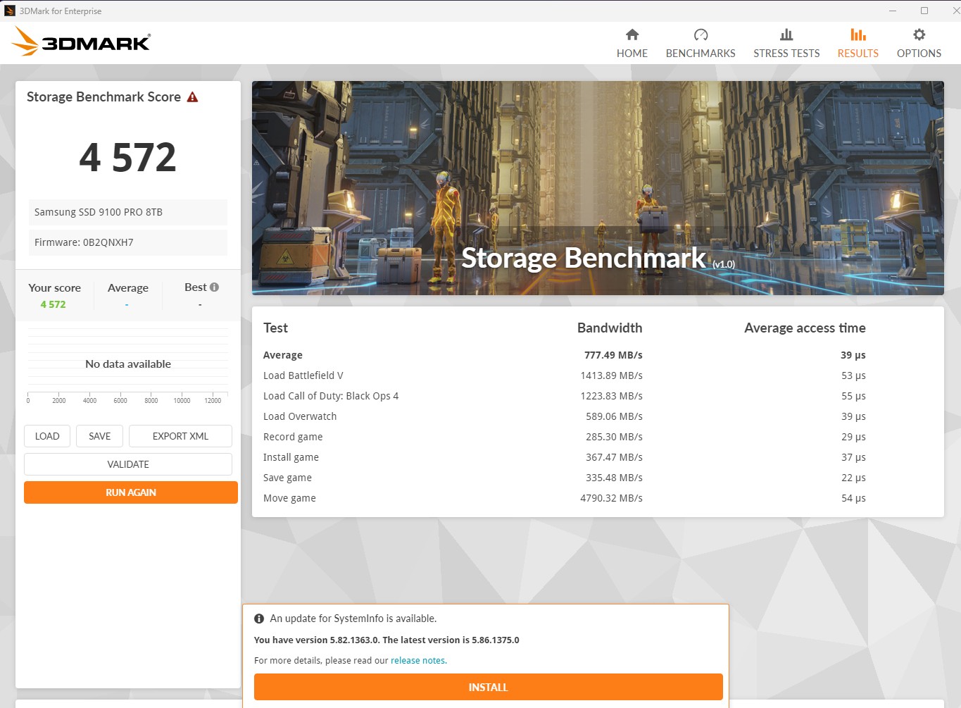 O ile kopiowanie plików zawsze jednoznacznie pokazuje poziom wydajności dysków, tak same aplikacje są już nieco bardziej skomplikowane, bo w procesie angażują nie tylko głównie dysk, ale przede wszystkim zarówno pamięć operacyjną, jak i procesor oraz kartę graficzną. Jednak nawet pomimo tego wysoką wydajność Samsung 9100 Pro 8 TB widać tutaj, jak na dłoni i potwierdza to weryfikacja w benchmarku 3DMark, który skupia się właśnie na grach.