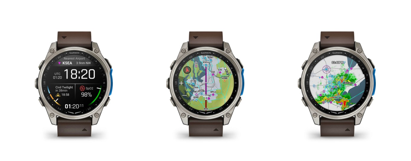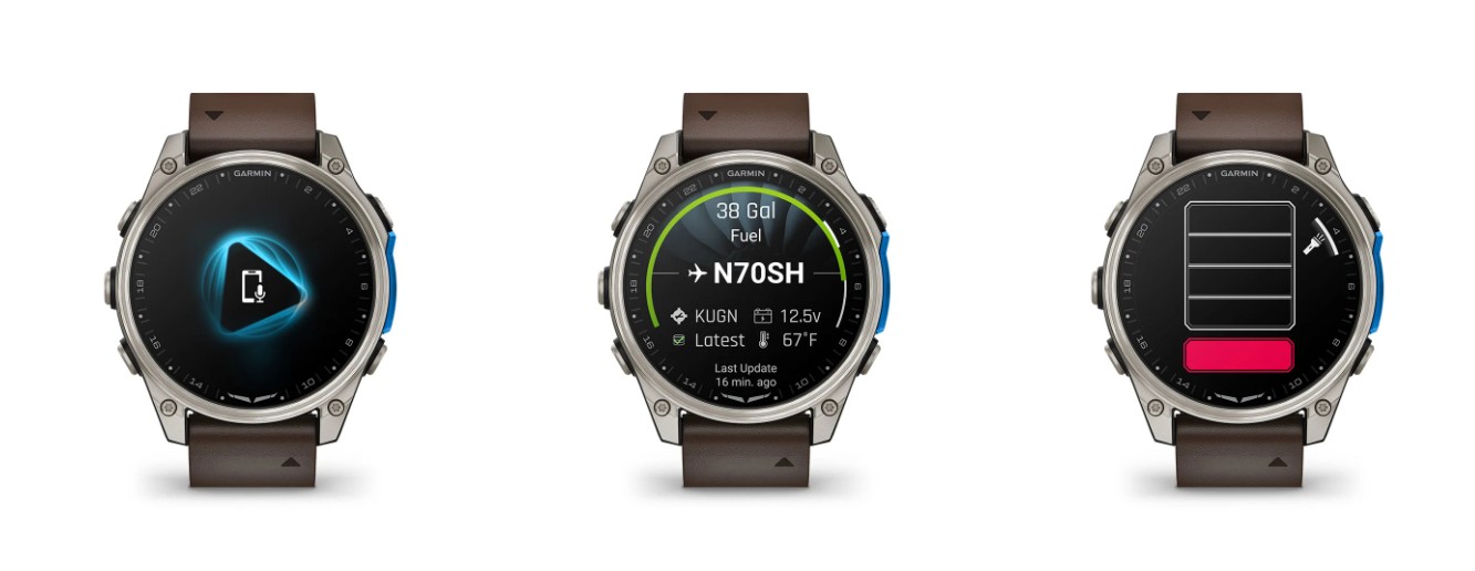 - PlaneSync — to jedna z najważniejszych nowości. Jeśli Twój samolot jest wyposażony w technologię Garmin PlaneSync, możesz zdalnie monitorować jego „pulpit” z zegarka. Obejmuje to sprawdzanie poziomu paliwa, stanu elektryki, aktualności bazy danych i lokalizacji samolotu.