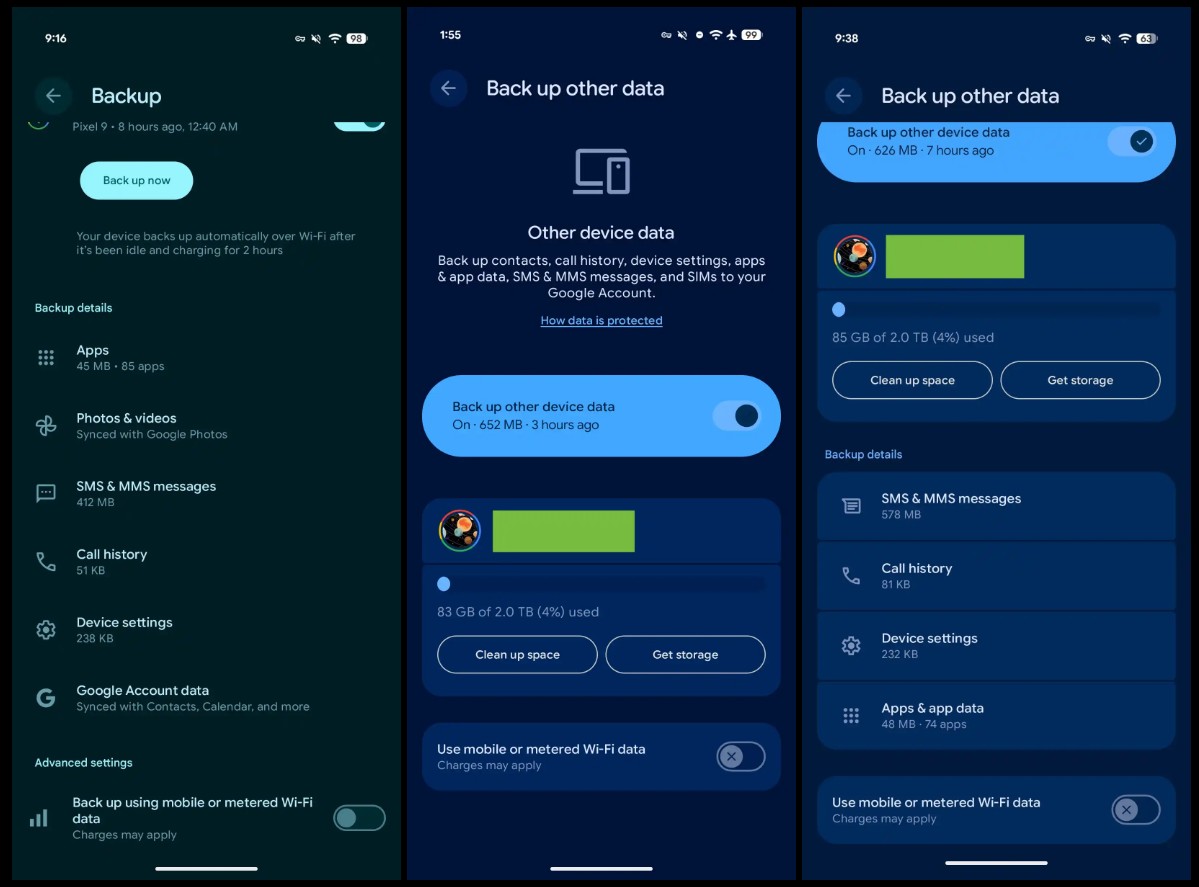 Po redesignie skurczyła się ona do zaledwie dwóch ogólnych pozycji: „Zdjęcia i filmy” oraz „Inne dane urządzenia”. Gdy stuknęliśmy w „Inne dane urządzenia”, mogliśmy zobaczyć przełączniki do włączania/wyłączania tworzenia kopii zapasowej tych danych i zezwolenia na używanie danych komórkowych, a także wskaźnik całkowitej zajętości miejsca w Google One. I to by było na tyle. Dla wielu użytkowników, którzy chcieli mieć pewność, że konkretne elementy, np. historia połączeń, są archiwizowane, to drastyczne uproszczenie było po prostu irytujące. Brakowało możliwości szybkiego sprawdzenia, co dokładnie wchodzi w skład tych “innych danych”.