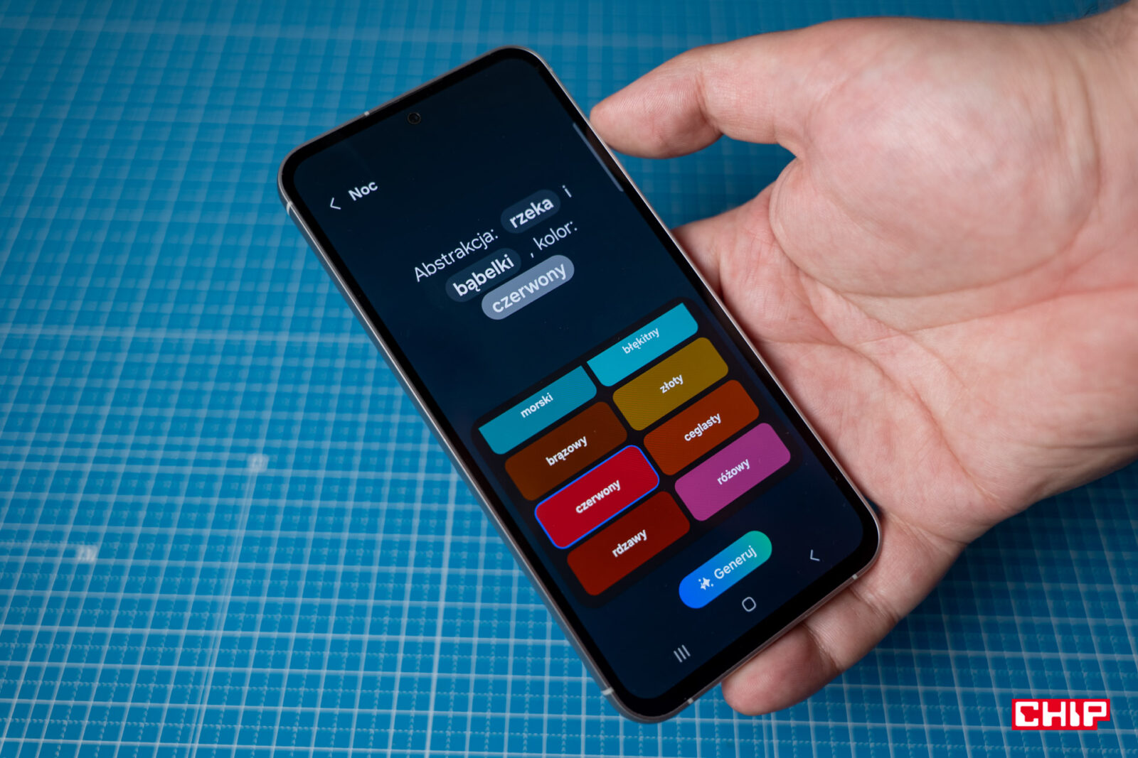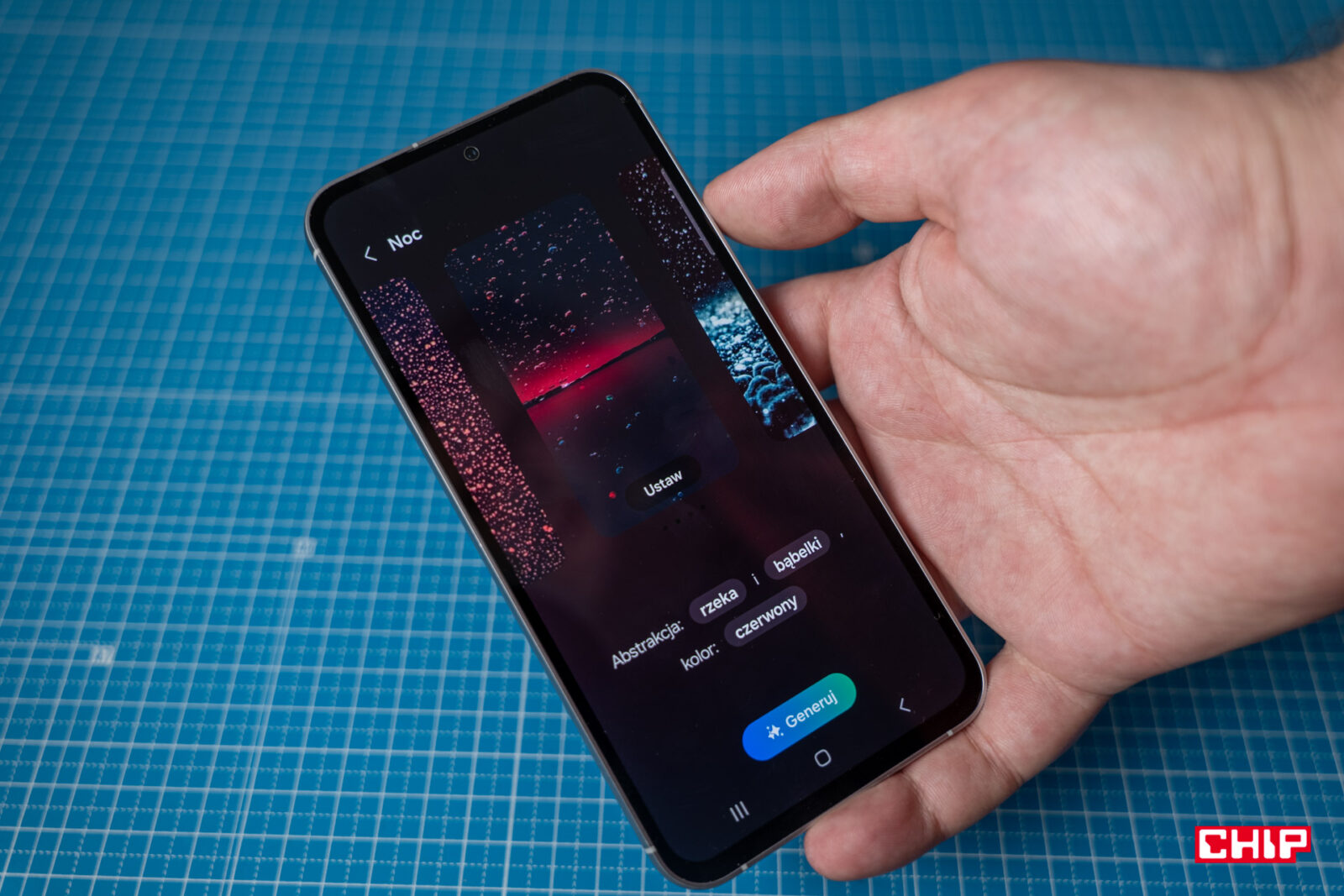 Dużo dzieje się także w kwestii możliwości graficznych. Samsung oferuje własne narzędzie do generowania tapet z użyciem sztucznej inteligencji, co odbywa się dzięki połączeniu kilku wytycznych. W zależności od tego, jaki wybierzemy przewodzący obiekt, dostaniemy dodatkowe opcje dotyczące chociażby koloru. Grafika może powstać w stylu malowanego obrazu, ale także jako imitacja zdjęcia nocnego czy bardzo kreatywne wytwory wyobraźni. Jeśli nie spodobają nam się efekty, dostaniemy opcję ponownego generowania.
