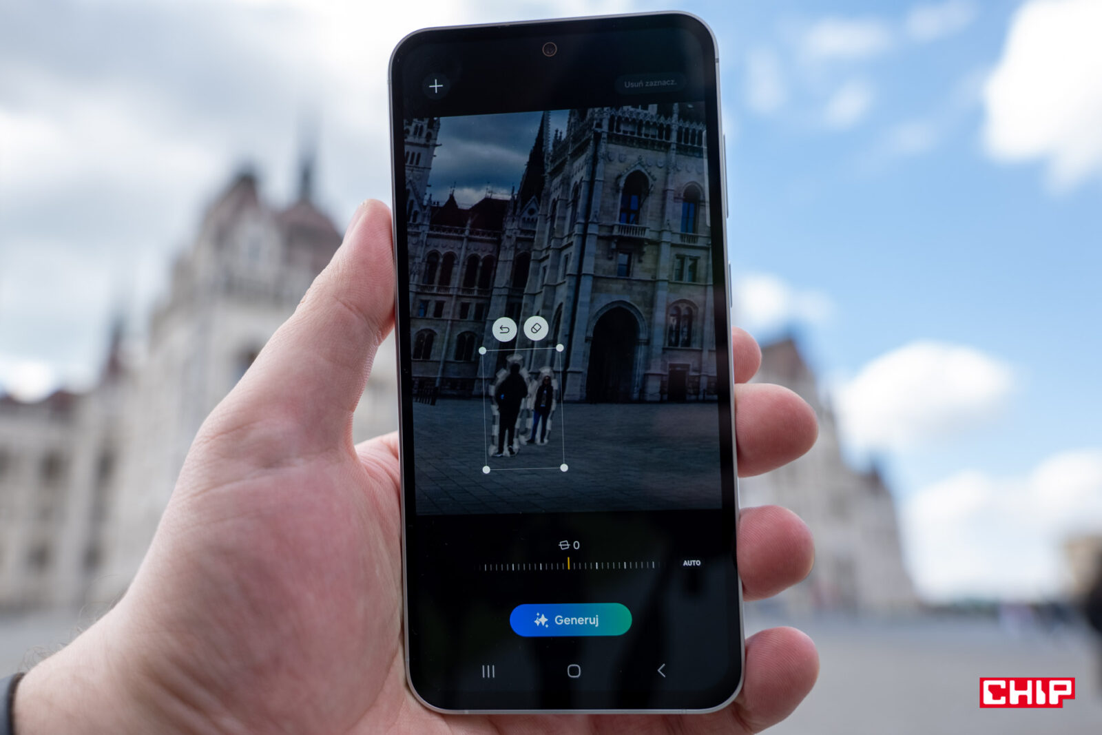Samsung implementuje narzędzia pozwalające efektywnie usuwać nie tylko osoby z tła naszego zdjęcia, ale i obiekty na naszej twarzy. Robi to z dużą precyzją i z zachowaniem detali dzięki rozumieniu, jak wygląda nasza twarz. Do tego całkiem dobrze uzupełnia detale związane z tłem. Jego skuteczność widać także wtedy, gdy rozszerzamy kadr. Choć nie znajdziemy tu aż tak dużego poszerzenia pola jak u konkurencji, tak szczegółowość jest wyższa, podobnie jak współczynnik podobieństwa względem reszty zdjęcia. Przy odpowiednim dołożeniu filtrów efekt może być pomijalny.