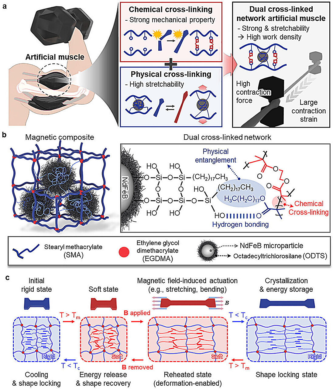 Dodatkowo w materiale umieszczono mikroskopijne cząsteczki magnetyczne z odpowiednio obrobioną powierzchnią. Dzięki temu ruchami mięśnia można precyzyjnie sterować za pomocą zewnętrznych pól magnetycznych, co przypomina nieco zdalne sterowanie, tylko w mikroskopijnej skali.