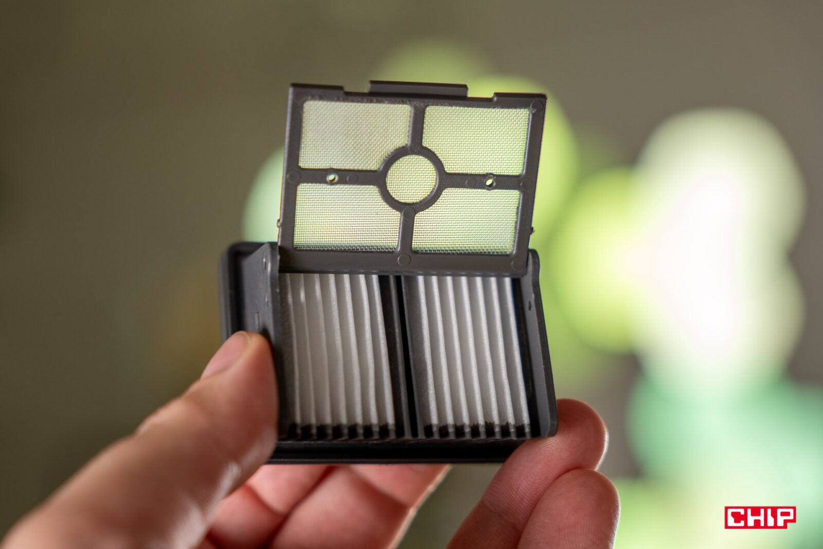 MOVA M50 Ultra prezentuje nieco inne podejście do filtrowania brudu. Największe jego kawałki mają znaleźć się w tylnej ściance w wyższej części zbiornika, natomiast reszta powędruje do dołu. Tam zmieści się 700 mililitrów płynu, a w razie potrzeby opróżnienia pojemnika dostaniemy stosowny komunikat – głosowo, w języku polskim, jak i w aplikacji mobilnej. W górnej części wyjmowanego filtra znajdziemy przestrzeń na filtr HEPA.