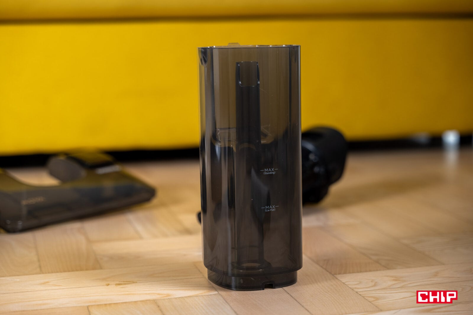 Oczywiście, jeśli nie jesteście fanem takich rozwiązań, to możecie je wyłączyć z poziomu aplikacji mobilnej. Według mnie poprawia ono skuteczność sprzątania, zwłaszcza gdy na podłodze znajdą się nieco większe elementy, takie jak ziemia. Jednocześnie pojemnik na wodę i płyn o pojemności 800 ml nie oznacza, że uratujecie się przed dolewaniem wody i środka do czyszczenia. Zapotrzebowanie urządzenia na wodę jest dość spore.