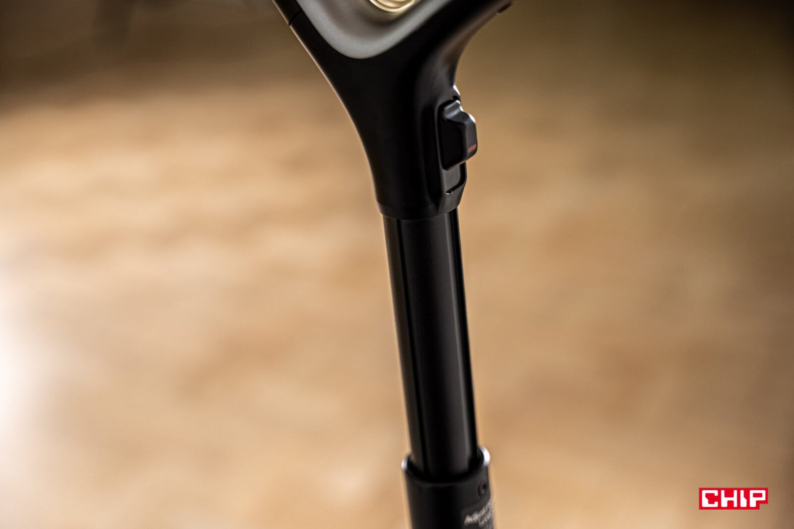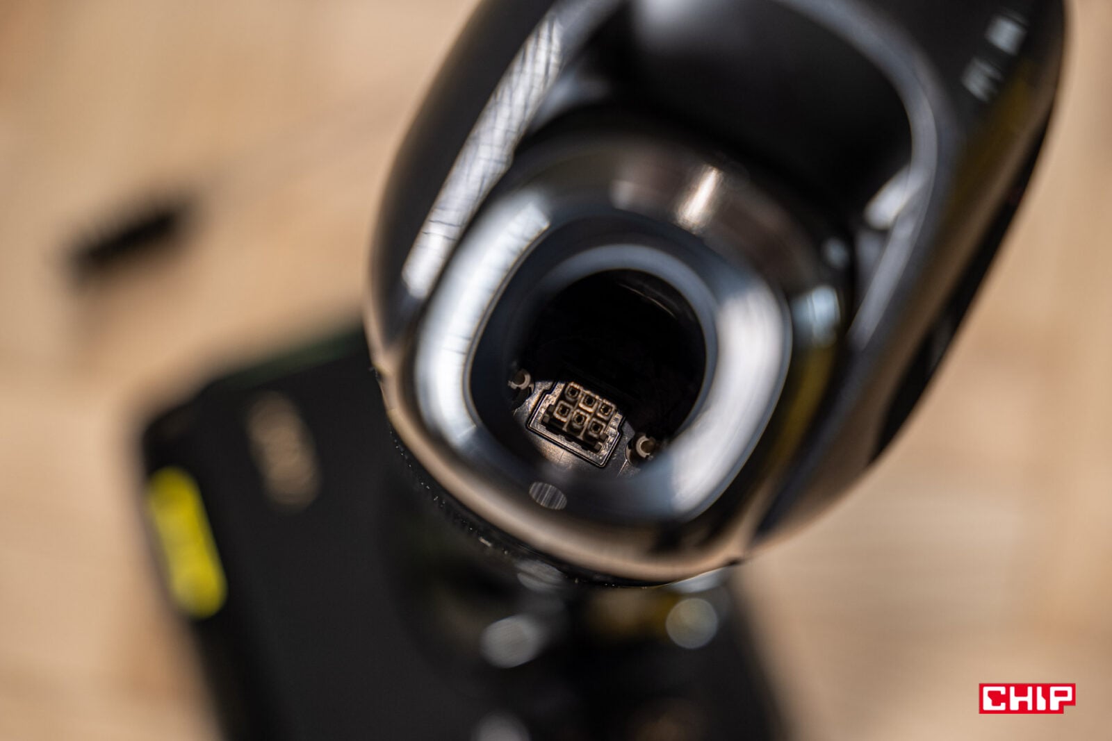Rączka to kolejny nieoczywisty element konstrukcji. Złoty pierścień służy do otworzenia mechanizmu pozwalającego na zagięcie, a nad nią znajduje się stosunkowo nieduży ekran (choć mi to akurat nie przeszkadza, warto zaznaczyć, że inni producenci stawiają na większe rozwiązania). Na najwyższym elemencie rękojeści znajduje się też przycisk, którym uruchomimy automatyczne mycie i suszenie szczotki mopującej. Rękojeść, choć nie wygląda na wygodną, została dobrze dopasowana do kształtu dłoni i nie wadzi przy dłuższym korzystaniu. Jedynie trzeba nieco zmienić chwyt, by kontrolować przycisk włączania i zmiany trybu kciukiem.