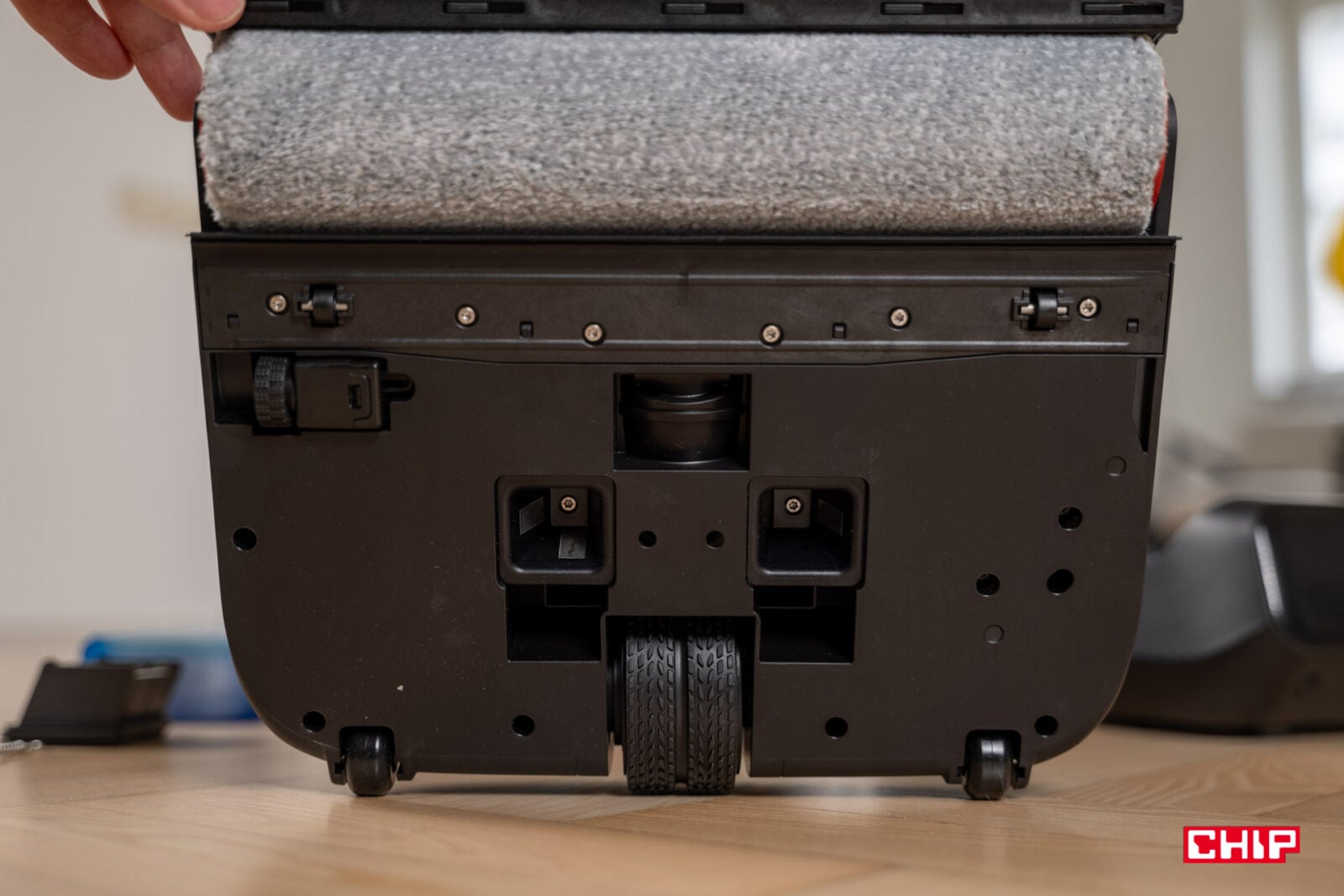 Wydaje się, że producent wszystko przemyślał. W razie potrzeby, gdyby sprzęt rozładował się daleko od stacji dokującej, możemy skorzystać z dużych tylnych kół, które pomogą w jego przewiezieniu.