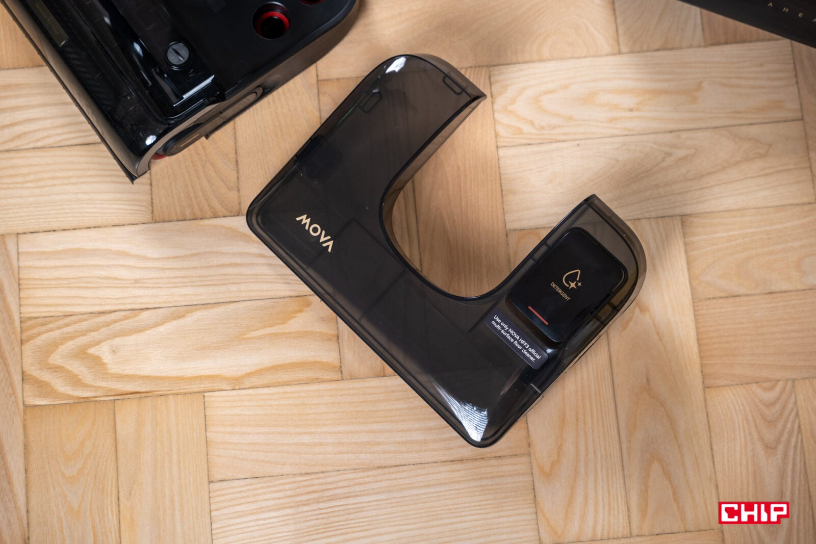 Spodobało mi się, że MOVA M50 Ultra oferuje zbiornik na wodę i płyn czyszczący, który otwory na płyn mieści w górnej części. To usprawnia proces uzupełniania płynów i sprawia, że nie musimy wyjmować zbiornika. Jeśli jednak łatwiej byłoby nam go zgarnąć do, chociażby, umywalki, to także możemy odłączyć go od konstrukcji. Gumowa zaślepka wymaga praktyki, by dobrze ją zamknąć, a dodatkowo należy pamiętać o tym, by zostawić choć część miejsca bez wody. Inaczej możecie nieco nachlapać na podłodze jeszcze przed sprzątaniem.