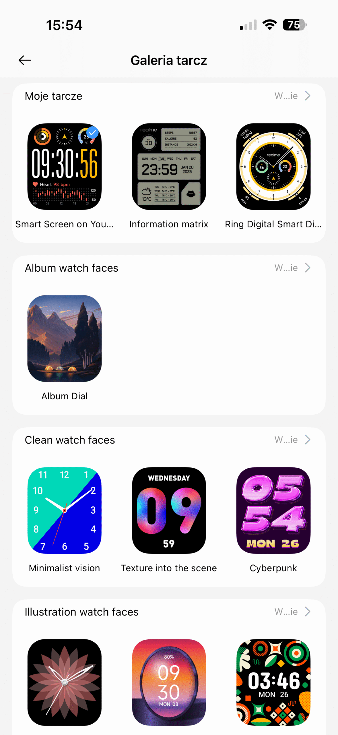 Realme Watch 5 działa pod kontrolą autorskiego, zamkniętego systemu operacyjnego. Takie rozwiązanie ma swoje wady i zalety – do plusów należy zaliczyć świetną optymalizację i niskie zapotrzebowanie na energię, co bezpośrednio przekłada się na długi czas pracy na baterii. Minusem jest całkowity brak możliwości instalowania dodatkowych aplikacji, jedynie tarczami można się pobawić i pozmieniać na przyjemniejszą dla oka. Interfejs jest prosty, intuicyjny i też zdradza podobieństwo do rozwiązań Apple’a, choć jest zarazem dużo bardziej toporny. Widać to choćby po tarczach – jest ich kilka na urządzeniu i ponad 300 do pobrania, ale jednocześnie na palcach jednej ręki policzyłbym te, które mi się jakoś podobają. Większość jest przesadnie efektowna i przez to mało czytelna.