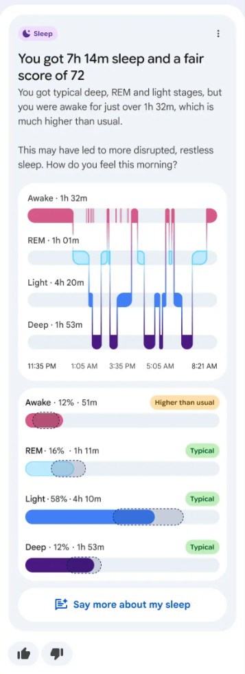 Karta „Zdrowie” to miejsce, gdzie znajdziesz siatkę Vitals (wcześniej metryka zdrowia): Tętno spoczynkowe, Zmienność rytmu serca (HRV), Odchylenia temperatury skóry i Tlen we krwi (SpO2). AI tu także służy pomocą, odpowiadając na szereg pytań. Jedną z bardziej innowacyjnych funkcji jest pomoc w przygotowaniu do wizyt lekarskich. Możemy zapytać system: „Mam coroczną kontrolę, jakie dobre pytania zadać mojemu lekarzowi?” AI przeanalizuje nasze dane zdrowotne i zasugeruje istotne kwestie do omówienia ze specjalistą.