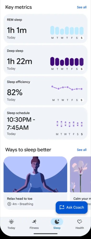 Choć wciąż mamy tu kartę „Today” z konfigurowalnymi metrykami na górze, jej design jest bardziej kompaktowy, a pozostała część strony głównej wypełniona jest kontekstowymi sugestiami w formie szczegółowych kart. Centralnym punktem nowego doświadczenia jest „Ask Coach”, dostępny w każdej chwili za pomocą pływającego przycisku. To proste okno czatu z historią rozmów, gdzie możesz zadawać pytania lub wprowadzać dane. Co ważne, wszelkie wprowadzone informacje są zapisywane, a Coach może generować wizualizacje i wykresy, by lepiej przedstawić dane.