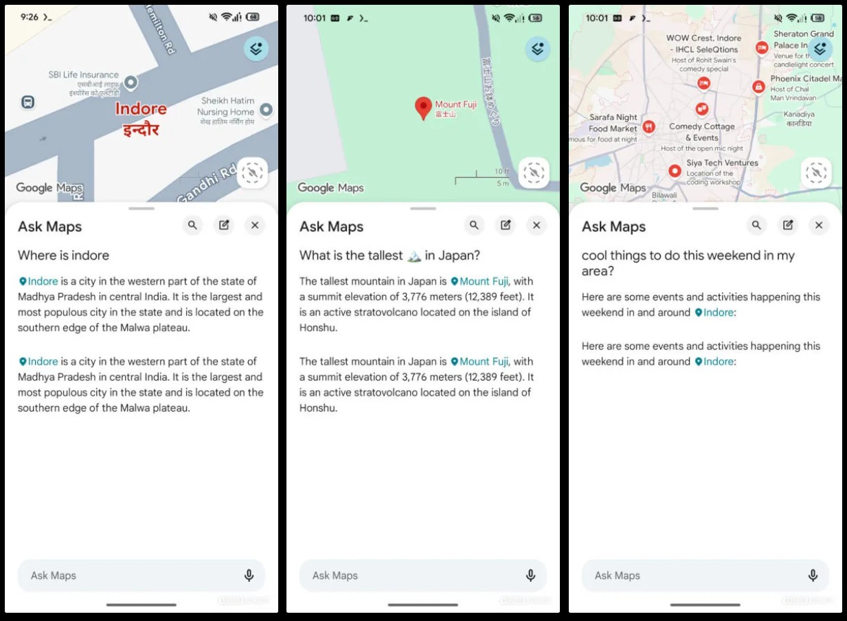 Po stuknięciu w ten chip naszym oczom ukaże się wysuwany od dołu ekran, a po jego przeciągnięciu w górę, zobaczymy interfejs, który jest niemal kalką z aplikacji Gemini. Na dole znajdzie się pole tekstowe z ikoną do wprowadzania głosowego oraz karuzela sugestii, które wyglądają jak typowe przykłady promptów dla AI, np. „restauracje, które serwują koktajle i małe przekąski” czy „fajne rzeczy do roboty w ten weekend w mojej okolicy”. To jasno pokazuje, że Google stawia na interakcję z Mapami za pomocą rozmowy, a nie tradycyjnych słów kluczowych.