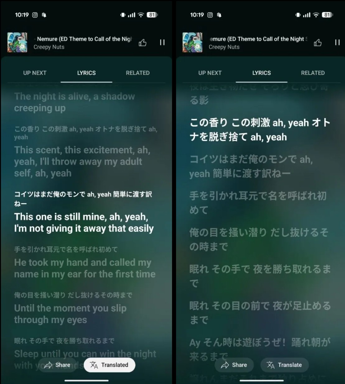 Po kliknięciu nowej opcji, pod oryginalnymi wersami tekstu natychmiast generowane jest maszynowe tłumaczenie. Obecnie użytkownicy nie mają możliwości ręcznego wyboru języka wyjściowego bezpośrednio w aplikacji, a tłumaczenie domyślnie odbywa się na język ustawiony jako systemowy na urządzeniu. Oczywiście, jeśli chcesz zmienić język, na który tłumaczy Gemini, możesz to zrobić, zmieniając język aplikacji YouTube Music w ustawieniach systemowych telefonu, aby wymusić żądany język.