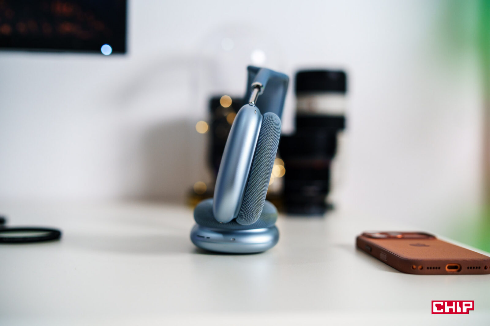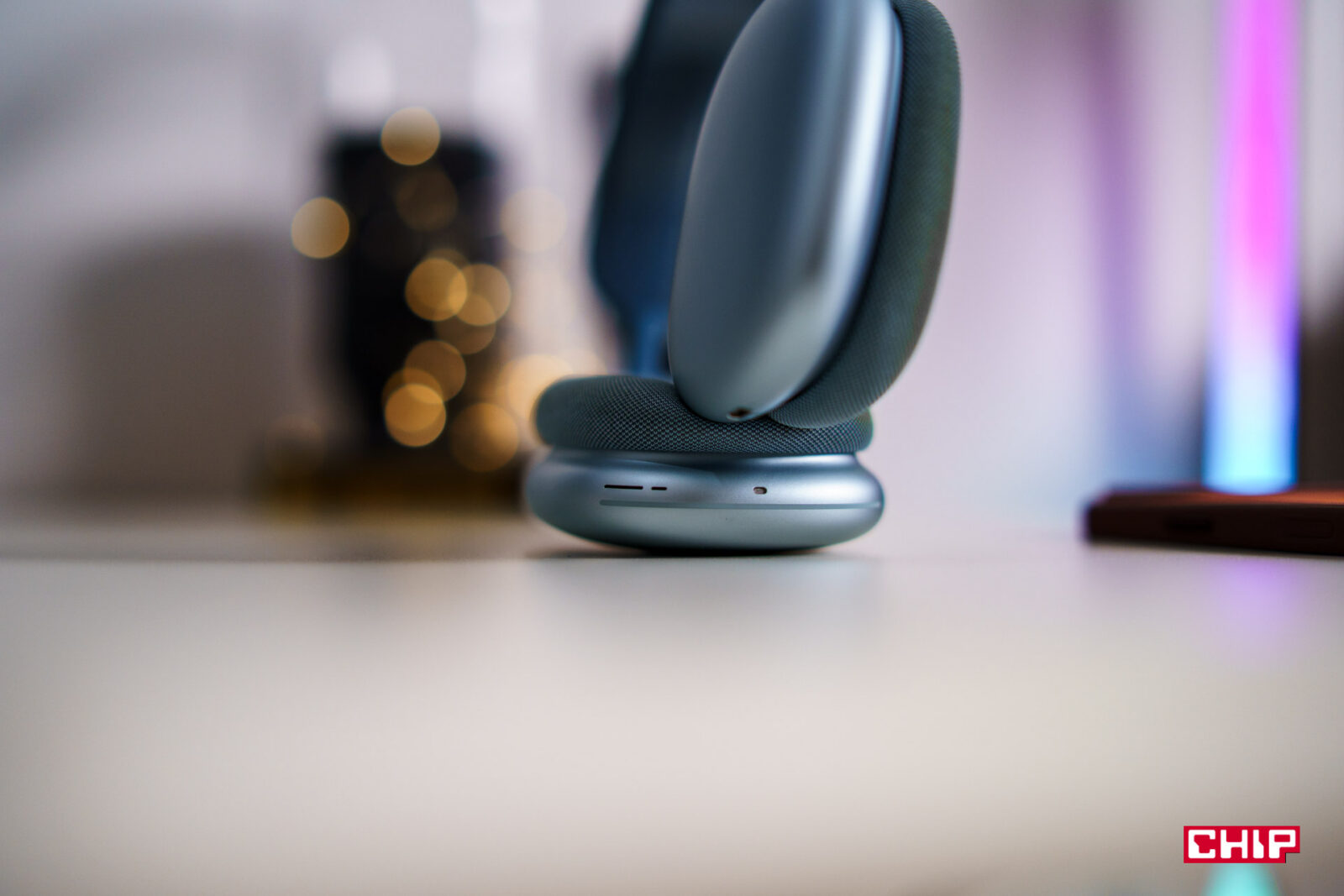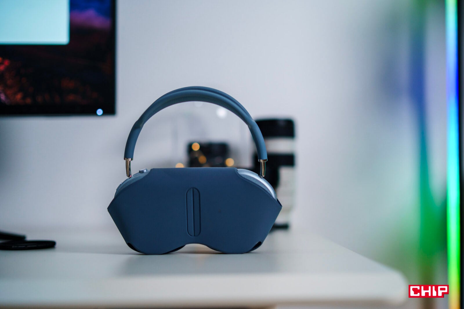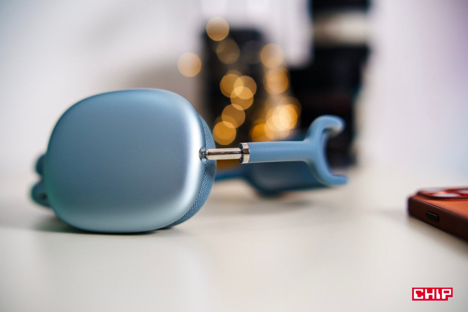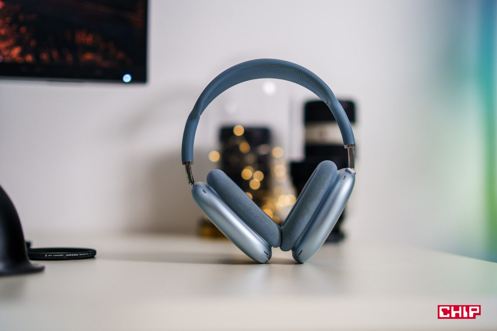 Niebieski wariant wygląda świetnie w typowo „apple’owy” sposób. Matowe, aluminiowe muszle, charakterystyczny pałąk z siatką i magnetyczne, łatwo wymienne poduszki. Całość robi wrażenie sprzętu „studyjnego”, a precyzja spasowania jest wzorowa — jak Apple zdążyło nas już przyzwyczaić. Jednocześnie to konstrukcja bez dwóch zdań konkretna — AirPods Max ważą około 386 g, co w dłuższych sesjach czuć na głowie. Wysoki docisk pomaga stabilności, ale nie każdemu przypadnie do gustu podczas wielogodzinnej pracy czy chodzenia, a szczególnie biegania z tymi słuchawkami na głowie.