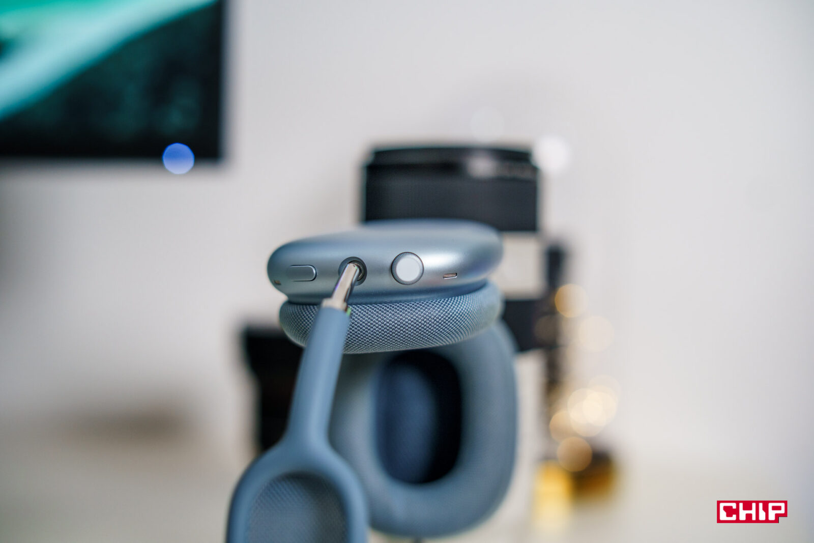 Obsługa słuchawek również jest banalna. AirPods Max mają tylko dwa przyciski na prawej muszli i jest to zestaw jak z Apple Watcha — obracana korona i podłużny przycisk. Koroną kontrolujemy głośność oraz przewijamy i pauzujemy utwory (jeden klik — pauza/odtwarzanie, dwa kliki — piosenka do przodu, trzy kliki — piosenka do tyłu), a obracając ją kontrolujemy głośność. Podłużny przycisk służy do zmiany trybu między ANC a transparentności.