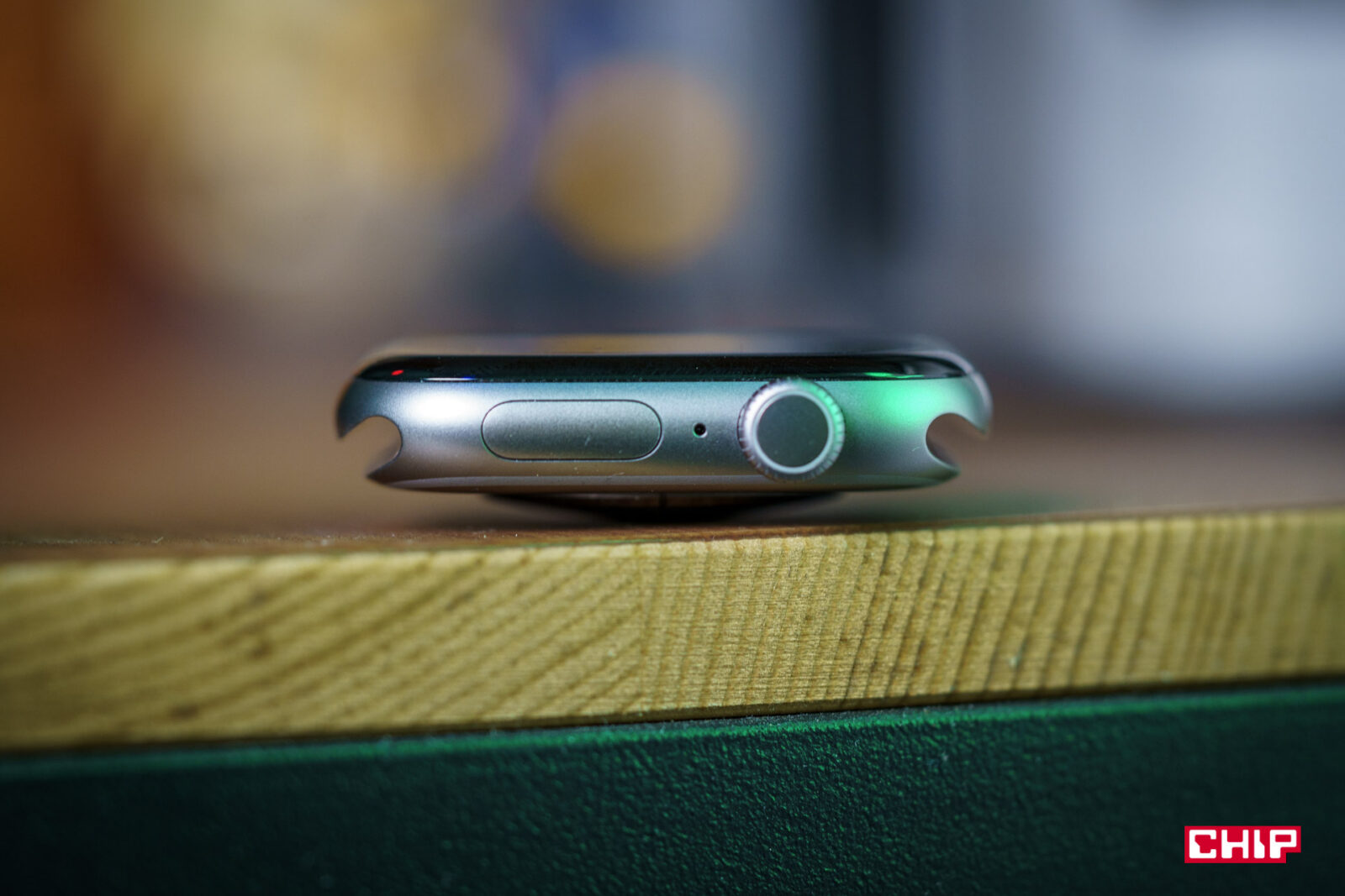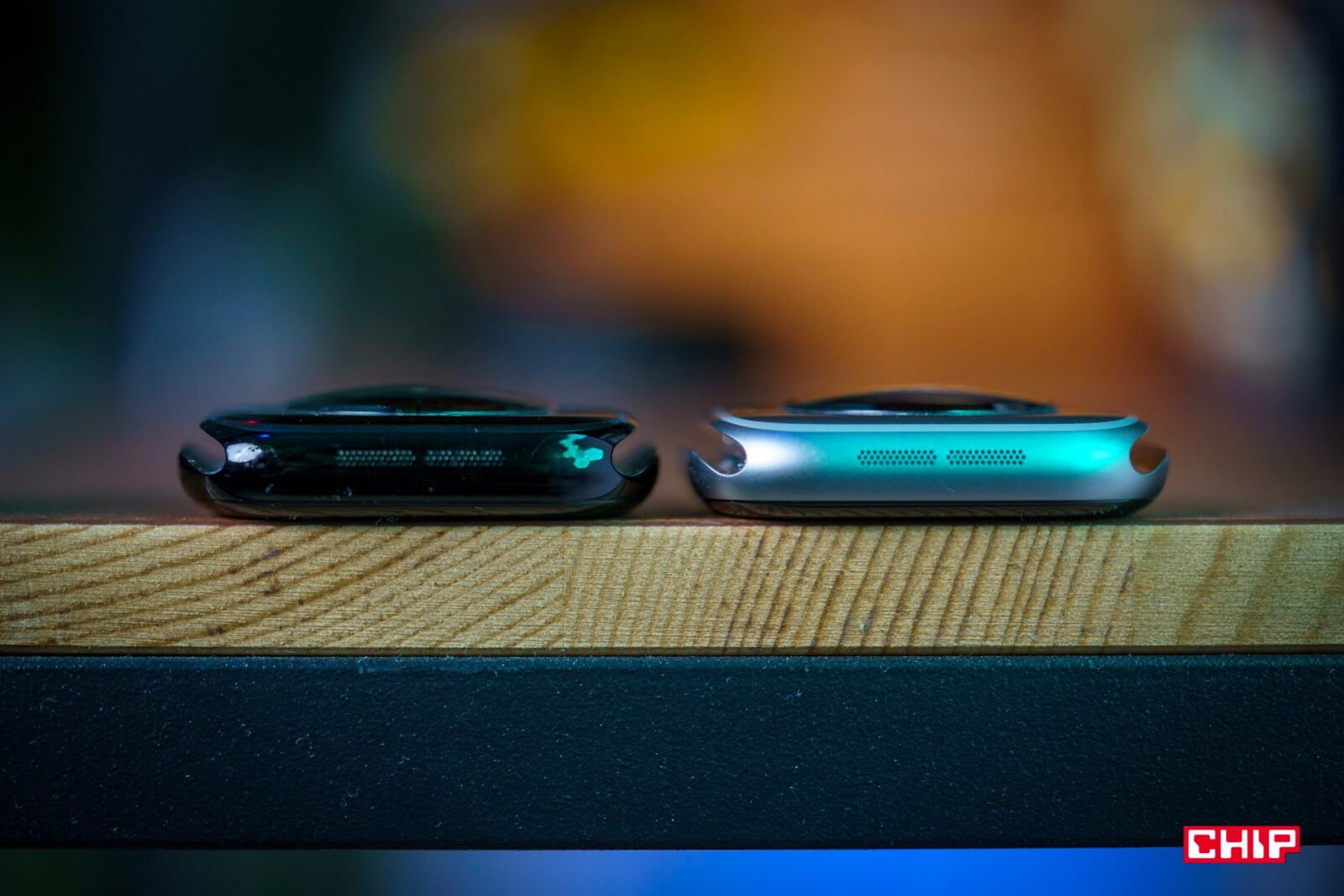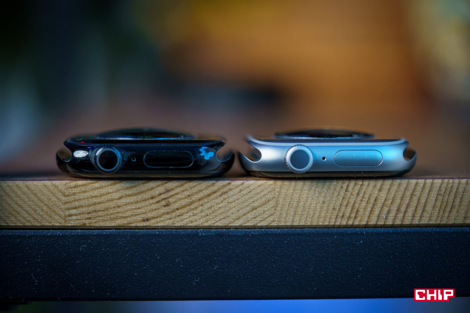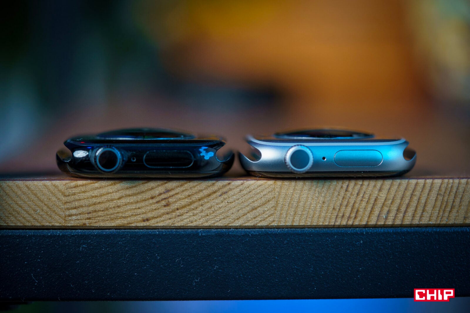 | Wymiary i masa | Wysokość: 46 mm Szerokość: 39 mm Grubość: 9,7 mm 416 na 496 pikseli Powierzchnia wyświetlacza: 1220 mm² Masa (koperta z aluminium, GPS): 37,8 g Masa (koperta z aluminium, GPS + Cellular):36,9 g Masa (koperta z tytanu): 43,1 g Pasuje na nadgarstki o obwodzie 140–245 mm Wysokość: 42 mm Szerokość: 36 mm Grubość: 9,7 mm 374 na 446 pikseli Powierzchnia wyświetlacza: 989 mm² Masa (koperta z aluminium, GPS): 30,3 g Masa (koperta z aluminium, GPS + Cellular):29,7 g Masa (koperta z tytanu): 34,6 g Pasuje na nadgarstki o obwodzie 130–200 mm |