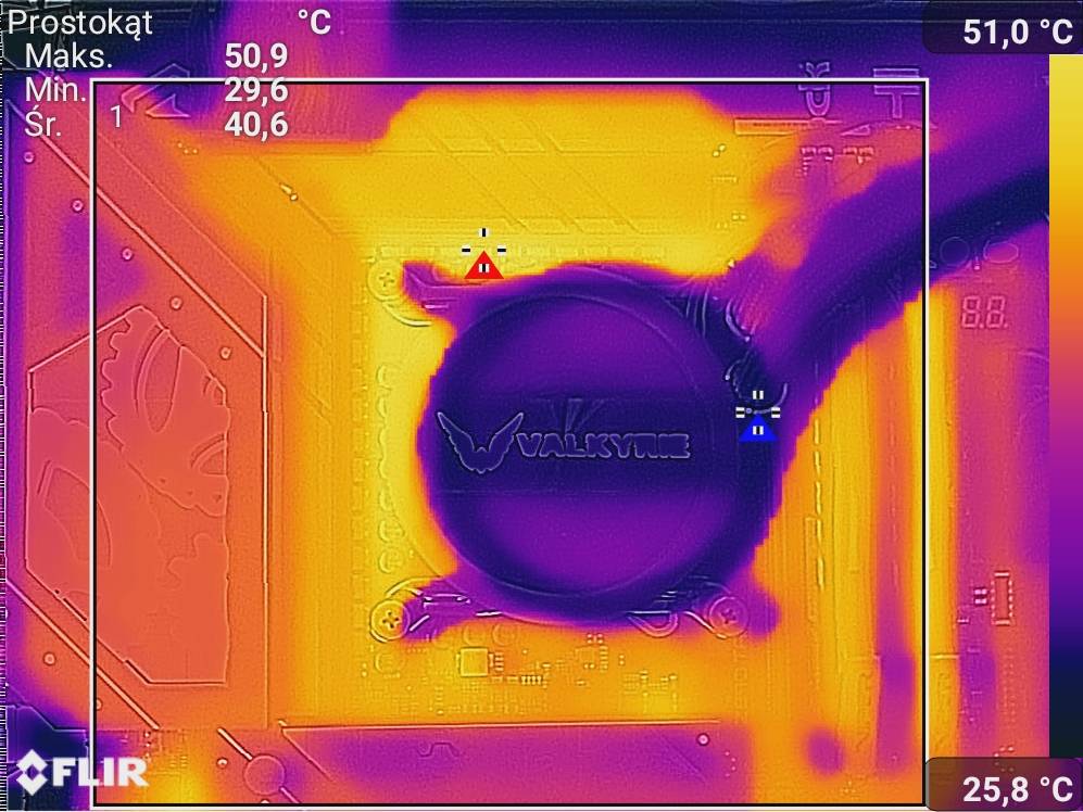W spoczynku wentylator osiąga ok. 3000 RPM. Tutaj przy cichych podzespołach może on być słyszalny. Pod obciążeniem rozkręca się do ok. 4000 RPM – jest głośniejszy, ale przy AiO 360 działającym na 100% na pewno go nie usłyszycie. Temperatury sekcji są bardzo niskie i na tyle niskie, że moim zdaniem spokojnie możecie włączyć tryb Silent, a nawet ręcznie ustawić go tak, aby włączał się przy znacznie większej temperaturze.