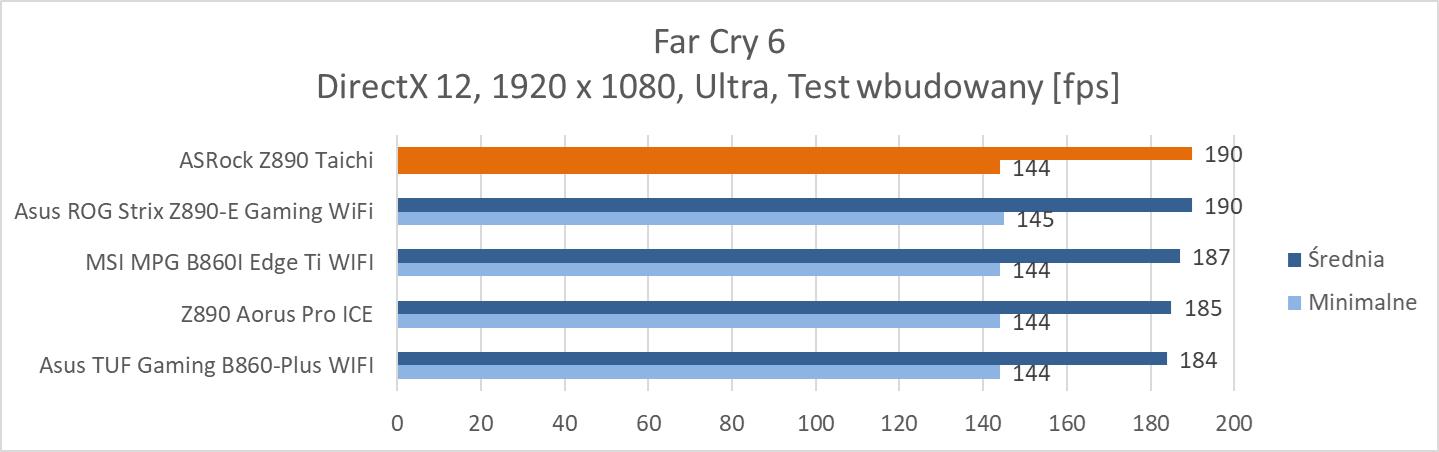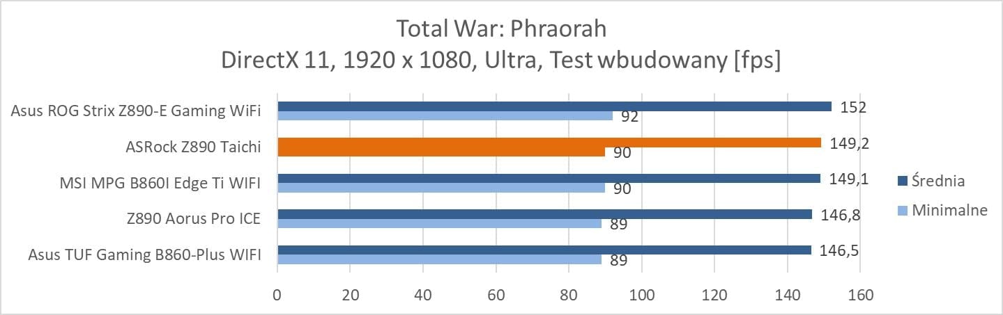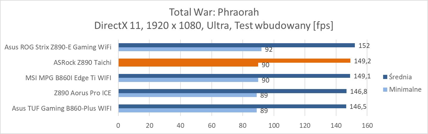 Na koniec przeprowadziłem testy w trzech grach: Total War: Phraorah, Assassin’s Creed Mirage oraz Far Cry 6. Testy wykonałem w rozdzielczości 1920 x 1080 px przy najwyższych ustawieniach. Wyłączyłem tylko ray tracing oraz DLSS/FSR, jeśli dana gra miała takie opcje. Testy przeprowadziłem przy wykorzystaniu wbudowanych w gry benchmarków. W przypadku Total War był to benchmark battle.