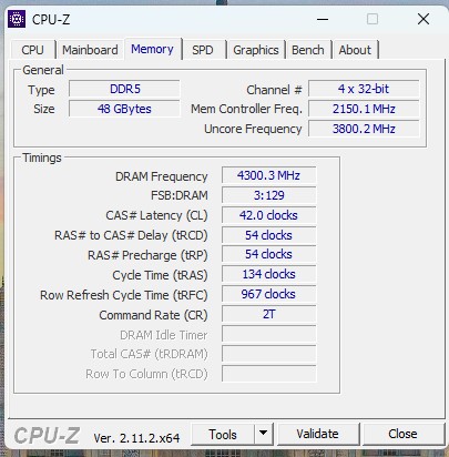 Sprawdziłem tutaj działanie pamięci CUDIMM Kingston 8800 MHz CL42 2x 24 GB. Po włączeniu profilu XMP pamięci domyślnie włączyły się w trybie Gear 4. Po ręcznym przełączeniu na Gear 2 8800 MHz nie było stabilne, ale całość przeszła testy przy 8600 MHz.