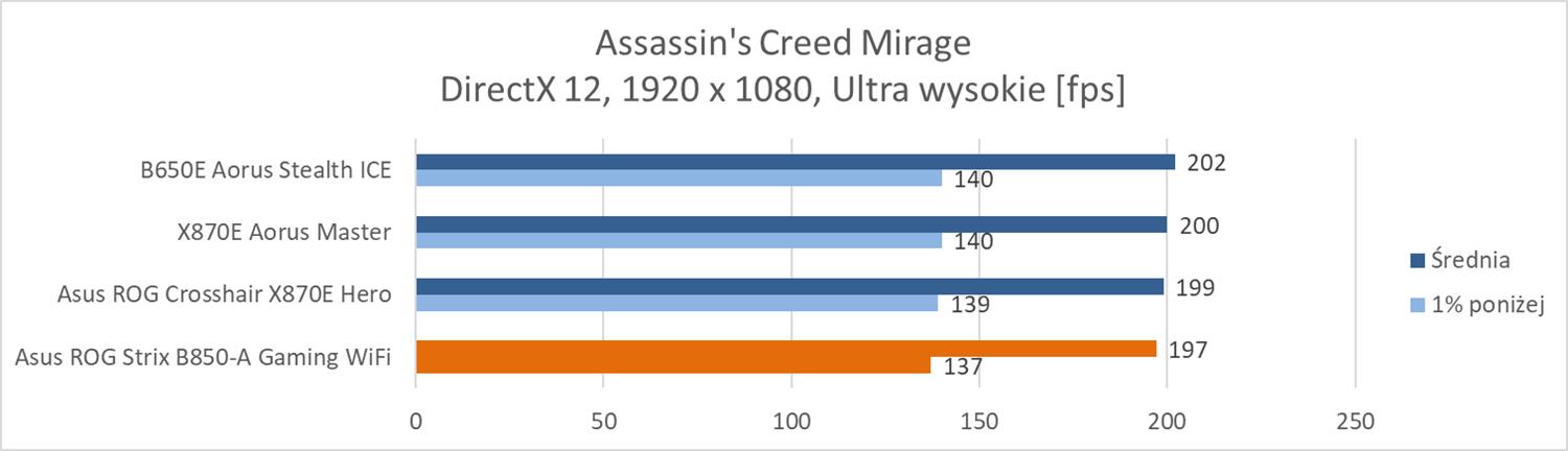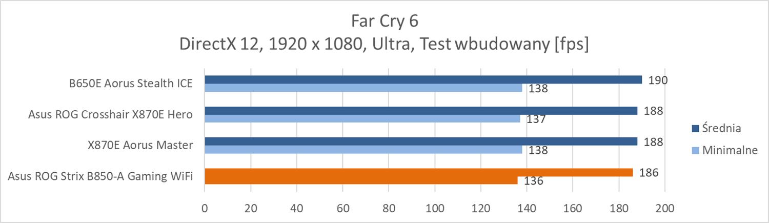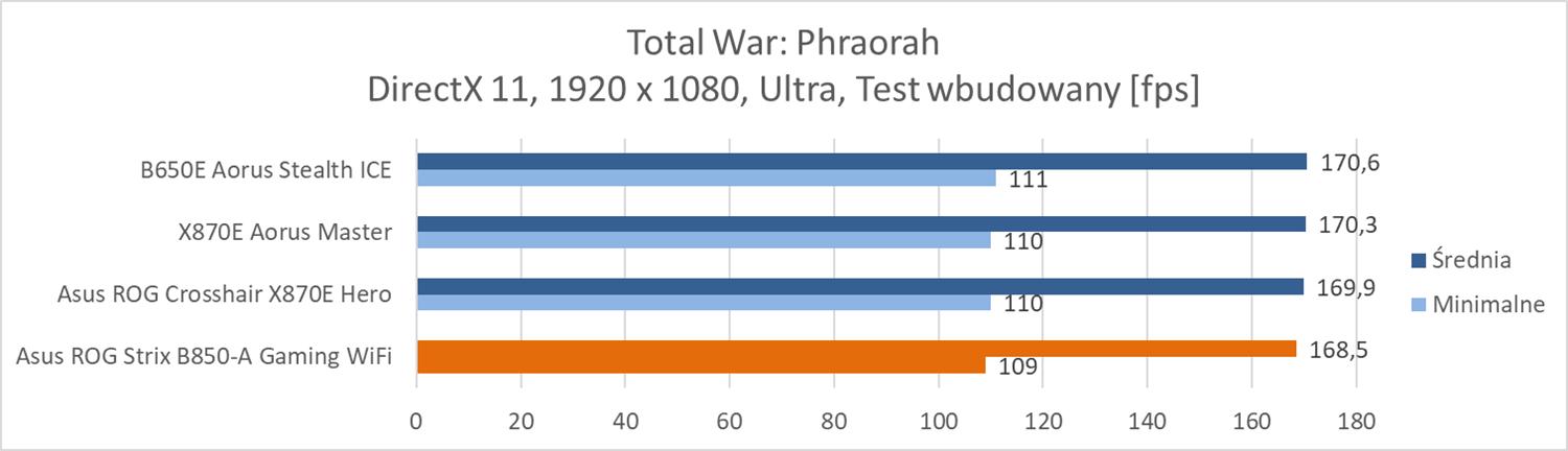 Na koniec przeprowadziłem testy w trzech grach: Total War: Phraorah, Assassin’s Creed Mirage oraz Far Cry 6. Testy wykonałem w rozdzielczości 1920 x 1080 px przy najwyższych ustawieniach. Wyłączyłem tylko ray tracing oraz DLSS/FSR, jeśli dana gra miała takie opcje. Testy przeprowadziłem przy wykorzystaniu wbudowanych w gry benchmarków. W przypadku Total War był to benchmark battle.