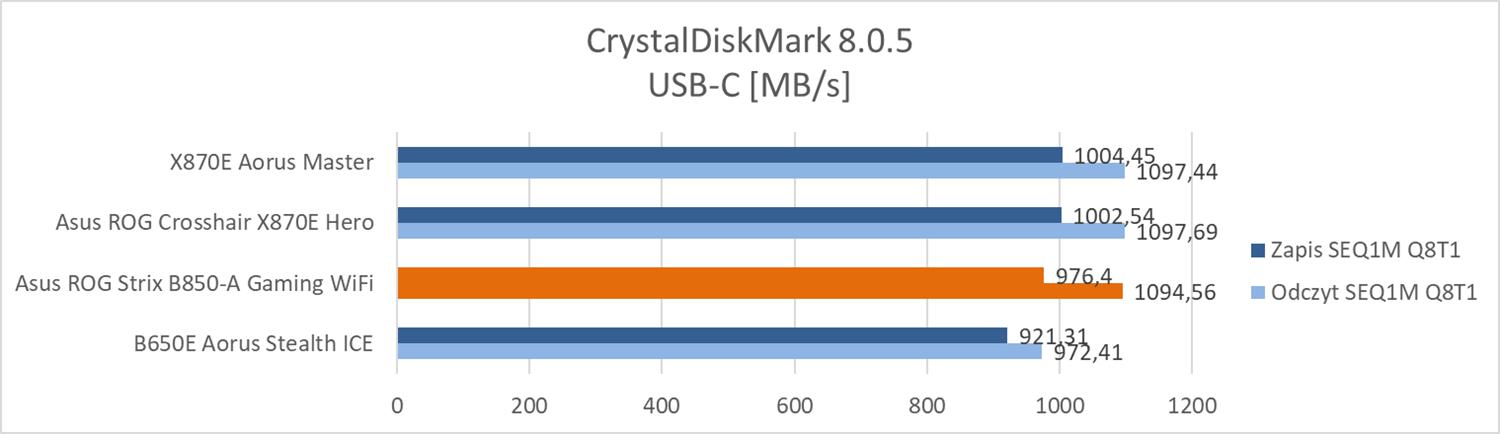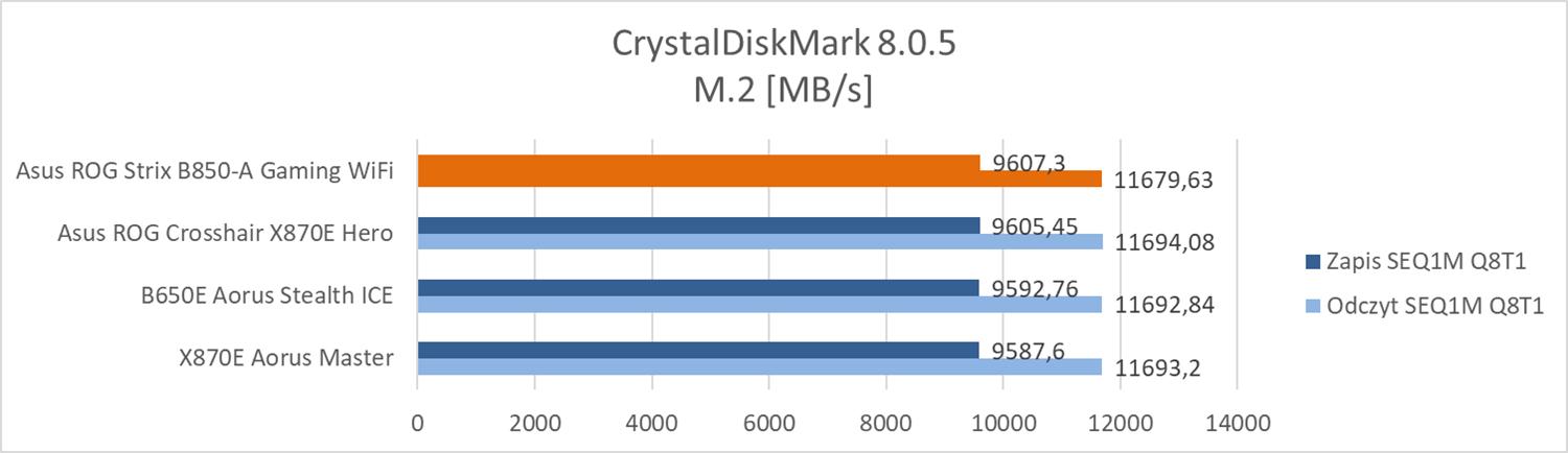 Asus ROG Strix B850-A Gaming WiFi to konstrukcja stworzona pod procesory AM5. Sekcja zasilania ma 14 (VCore, 80A) + 2 (SoC, 80A) + 2 (Misc, 80A) faz zasilania. Chłodzona jest dzięki dwóm radiatorom (bez ciepłowodu) oraz termopadom o wysokiej przewodności cieplnej. Całość zasilana jest z dwóch złączy 8-pin. Taka sekcja nie powinno mieć problemów nawet z najmocniejszym procesorem. Sprawdzę w testach, jak w rzeczywistości ona wypada w połączeniu z Ryzenem 9 7950X.