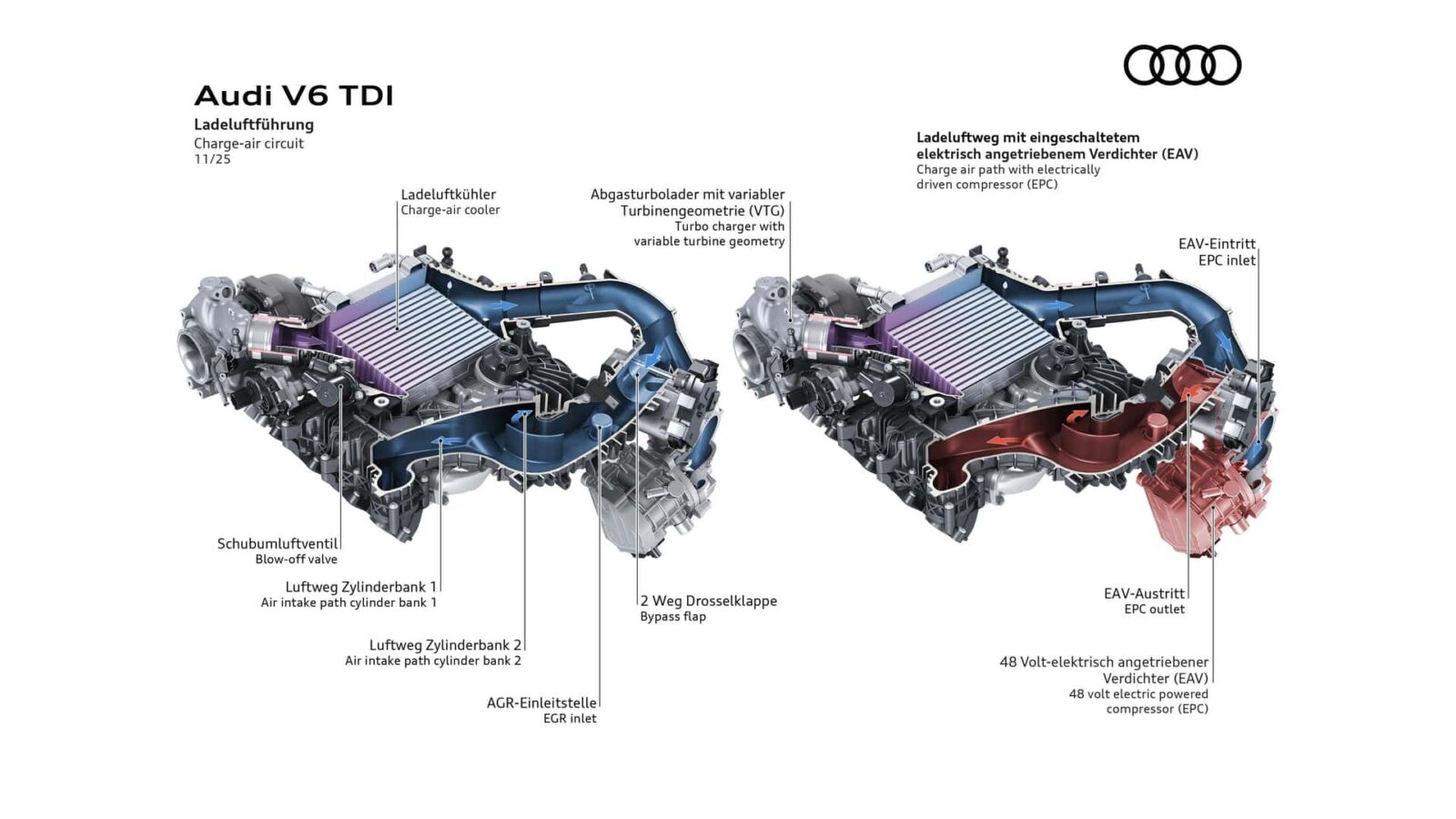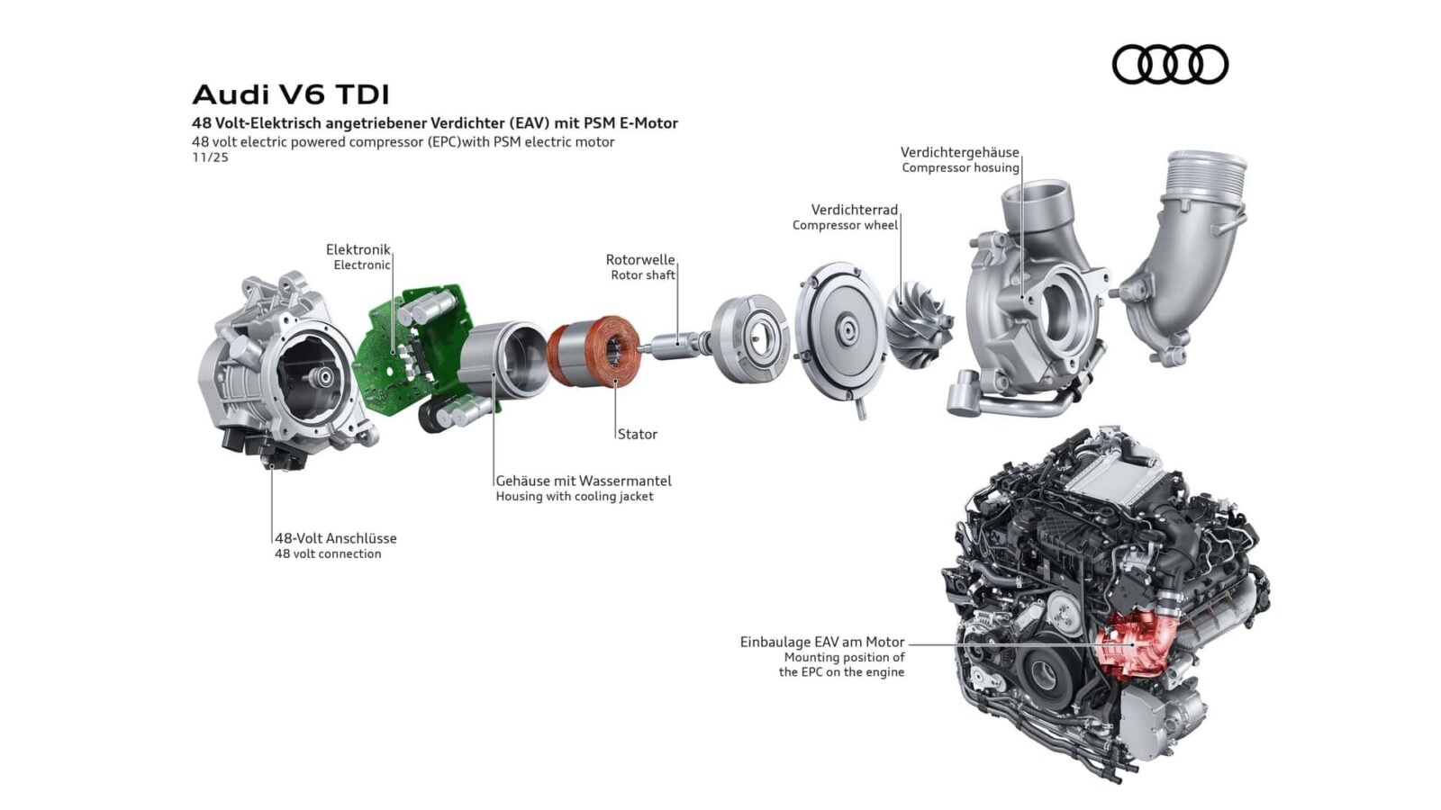 W A6 i Q5 nowy sześciocylindrowy silnik wysokoprężny Audi doczeka się wsparcia w formie systemu łagodnej hybrydy z elektrycznie napędzaną sprężarką. Nie jest to pierwszy raz, kiedy ten producent oferuje 48-woltowe silniki wysokoprężne V-6, ale nigdy wcześniej taki układ nie współpracował z elektrycznie napędzaną sprężarką, która jest zamontowana za turbosprężarką i chłodnicą międzystopniową w kanale dolotowym. W efekcie podczas ruszania system łagodnej hybrydy dodaje tymczasowo do dyspozycji 24 KM i 230 Nm, ale poprawki na tym się nie kończą.