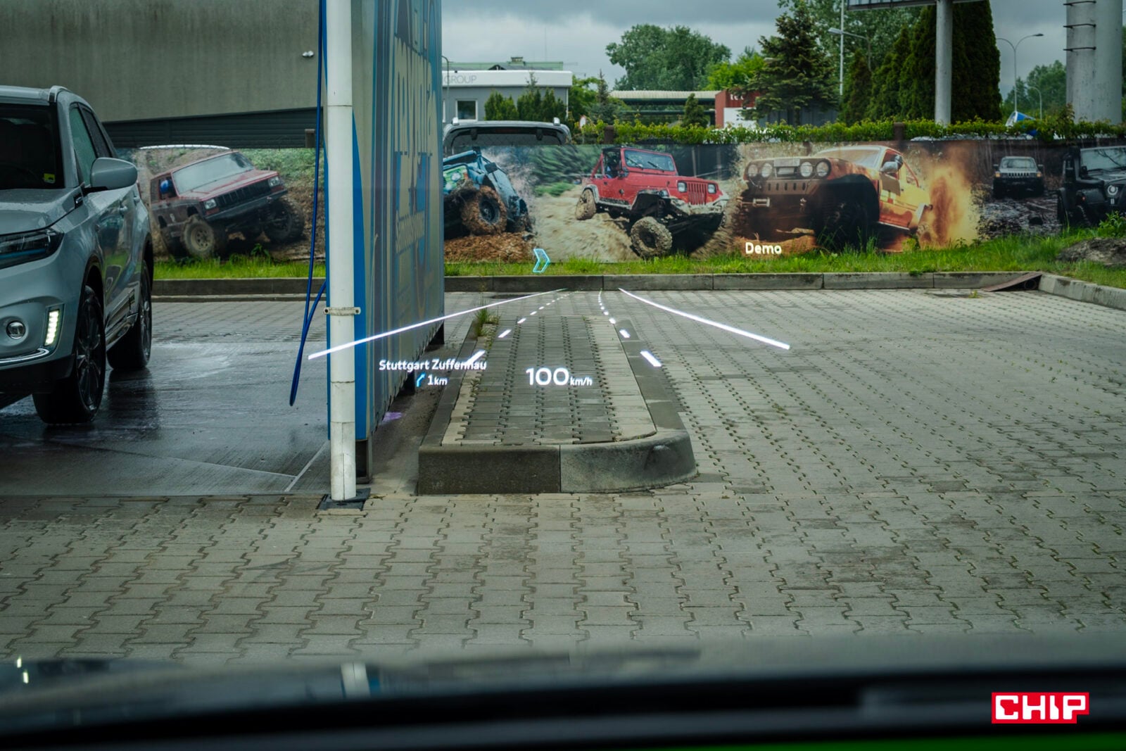 Nad ekranem kierowcy znajdziemy bardzo duży head-up, który jest po części kopią treści wyświetlanych niżej. Tu znajdziemy informacje o prędkości czy nawet przebiegu trasy, wliczając w to wskazówki nawigacyjne wykorzystujące rozszerzoną rzeczywistość.