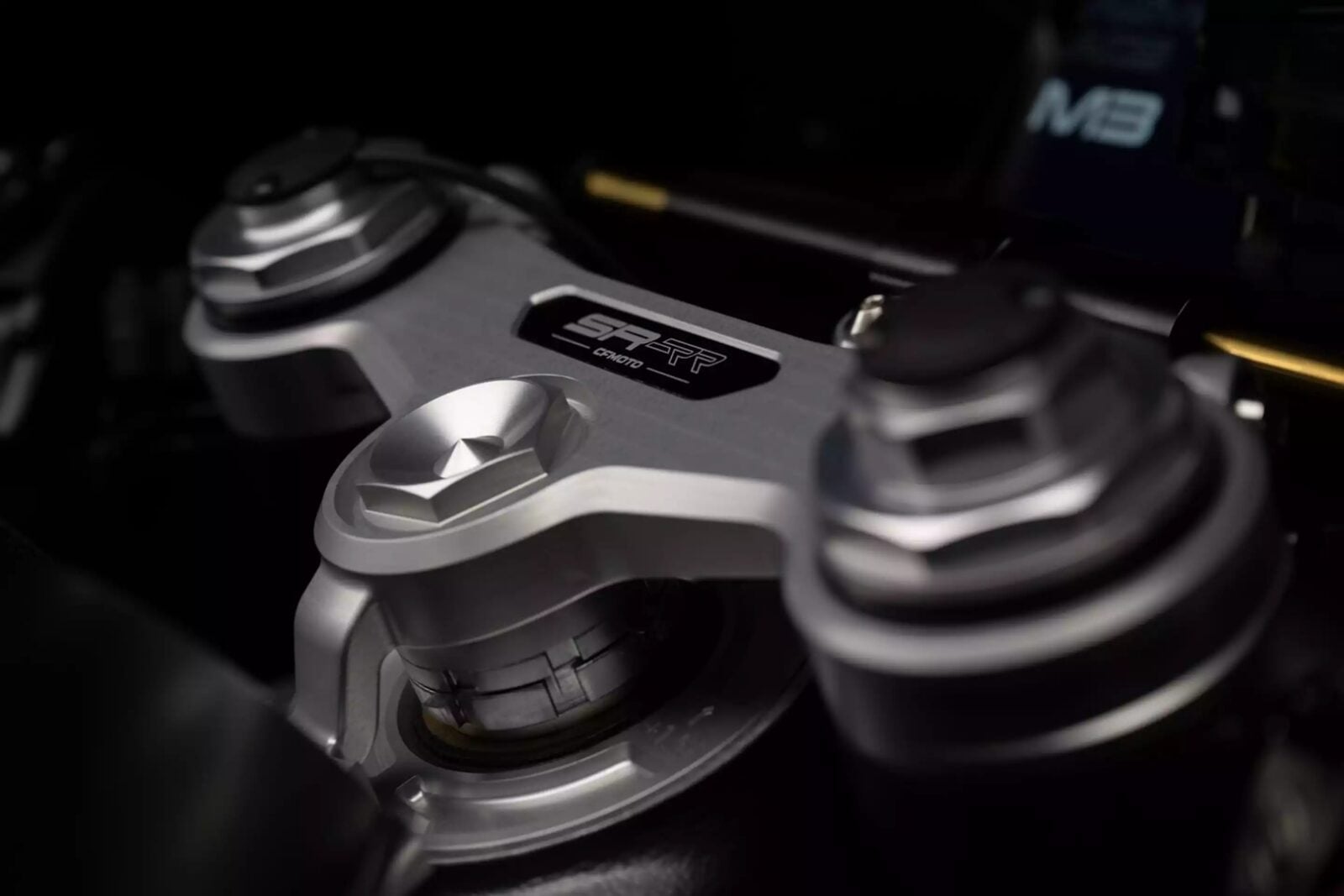 Pod owiewkami V4 SR-RR kryje się imponująca jednostka napędowa. Mowa o silniku V4 o pojemności 997 cm³ z cylindrami rozstawionymi pod kątem 90 stopni, co stanowi klasyczną konfigurację w świecie wysokowydajnych motocykli. Ciekawostką konstrukcyjną jest zastosowanie silnika jako elementu nośnego ramy, podobnie jak w Ducati Panigale V4. Aluminiowy wspornik osi wahacza mocowany jest bezpośrednio do skrzyni biegów i tylnej głowicy cylindrów, co znacząco redukuje masę i zwiększa sztywność całej konstrukcji.