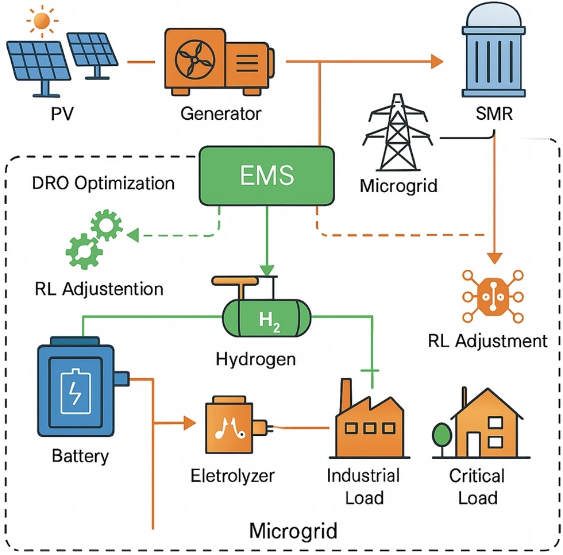 Najciekawsza w tym wszystkim jest nie tylko lista technologii, ale filozofia sterowania. System Zarządzania Energią (EMS) pełni rolę centrum dowodzenia i łączy dwa podejścia. Na etapie planowania wykorzystuje wielokryterialny, rozkładowo odporny algorytm optymalizacji (DRO), który generuje dobowe harmonogramy pracy, starając się minimalizować koszty operacyjne i emisyjność dwutlenku węgla przy wysokiej niezawodności, nawet gdy pogoda i popyt odchylają się od prognoz. Na poziomie pracy w czasie rzeczywistym agent oparty na uczeniu ze wzmocnieniem (RL) koryguje te bazowe plany, gdy warunki się zmieniają, a więc np. wtedy, gdy nagłe zachmurzenie ogranicza produkcję z fotowoltaiki. Cała optymalizacja została zaimplementowana w Pythonie z użyciem frameworka modelowania Pyomo oraz komercyjnego solvera Gurobi 10.0, zdolnego rozwiązywać złożone zadania programowania mieszanoliczbowego.