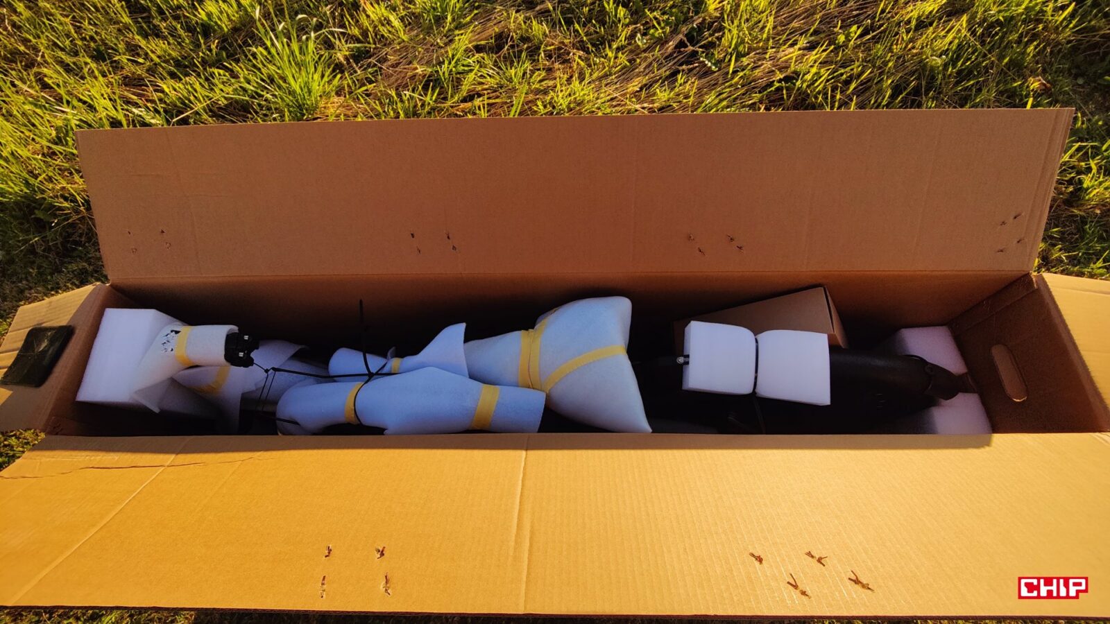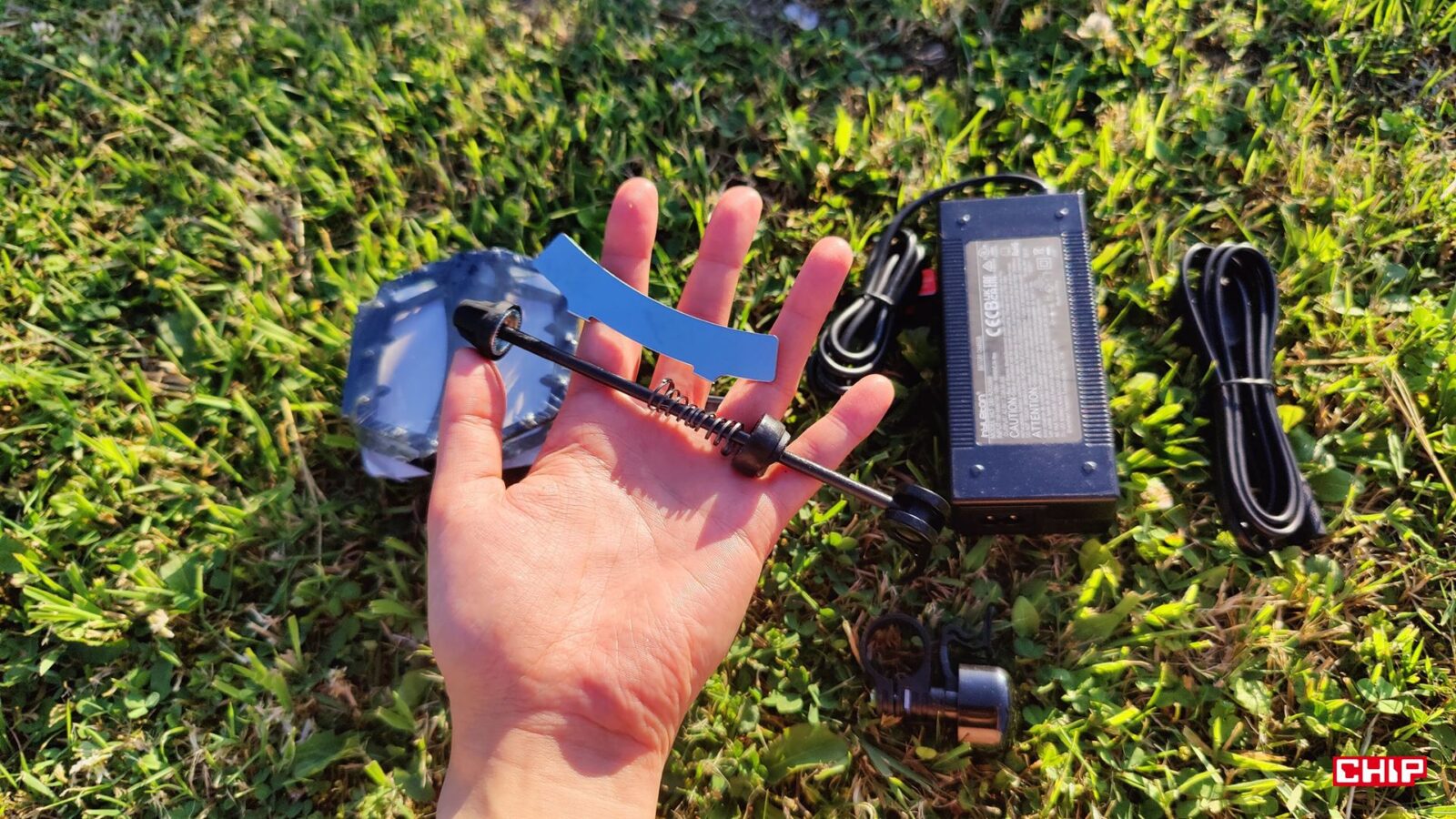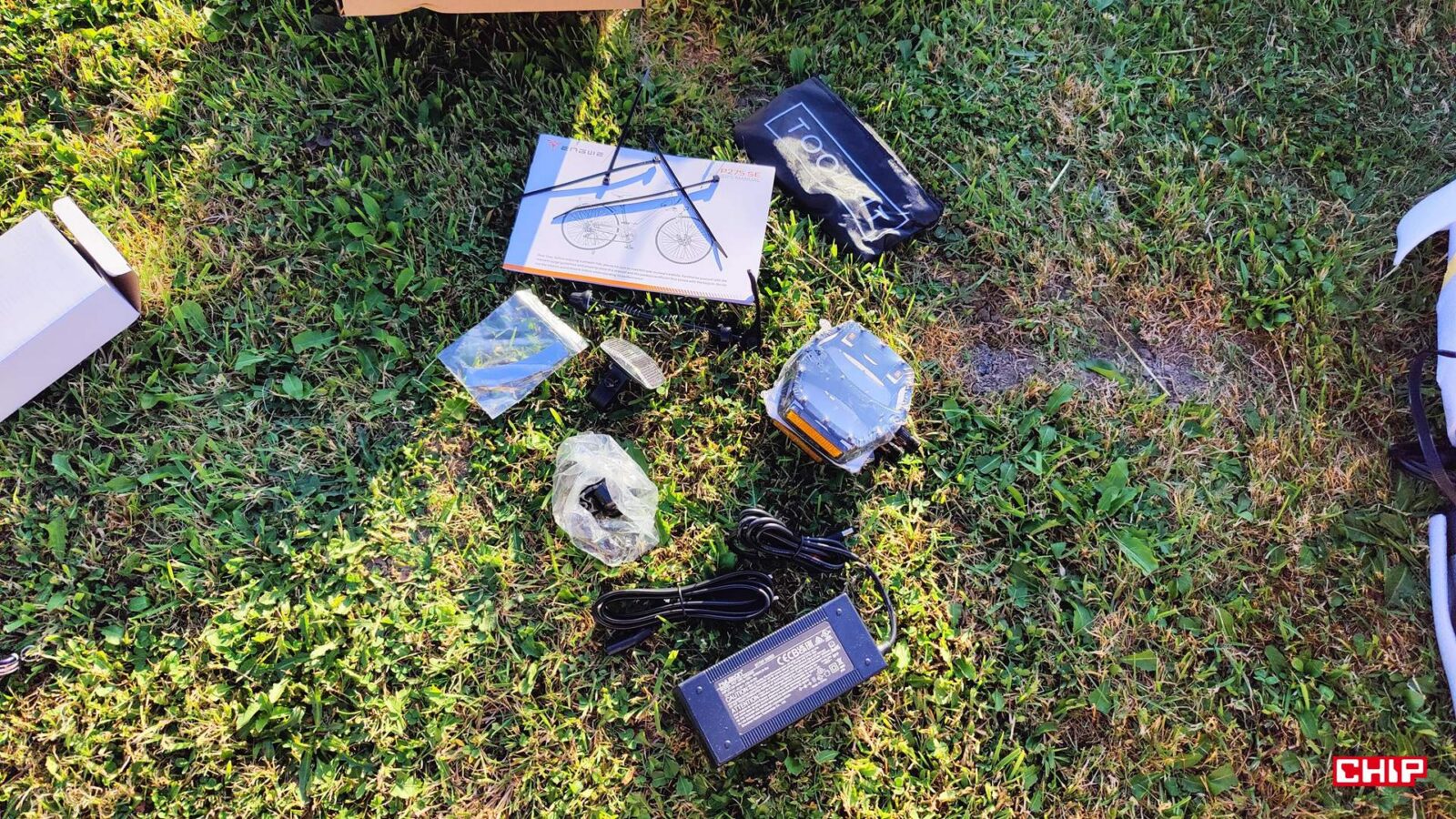 Zacznijmy od samego roweru wyjętego z kartonu. P275 SE przyjeżdża już częściowo złożony, w jednym dużym pudle razem z akumulatorem 36 V 13 Ah, dwoma kluczykami, ładowarką 42 V/2 A, kompletem narzędzi montażowych, wymiennymi klockami hamulcowymi, metalowymi(!) platformami pedał, dwoma plastikowymi błotnikami z trzema punktami mocowania, podpórką, instrukcją i oczywiście samą ramą z zamontowanym napędem. To wyposażenie jest dość typowe dla miejskiego e-bike, ale warto po prostu podkreślić to, że w pudełku faktycznie dostajemy pełny rower użytkowy, a nie “sportową bazę”, do której musimy dokupić jeszcze błotniki, stopkę czy oświetlenie.