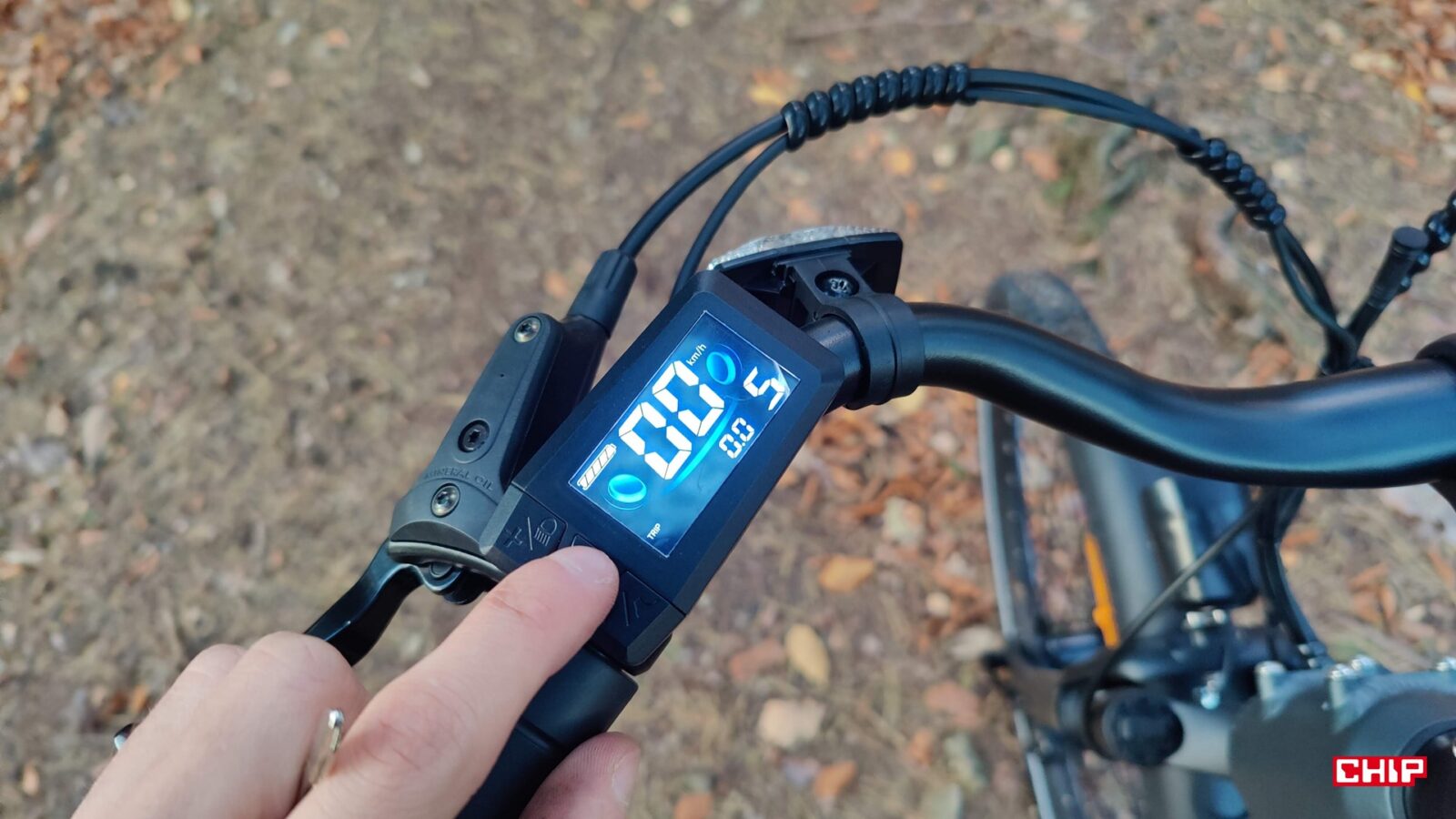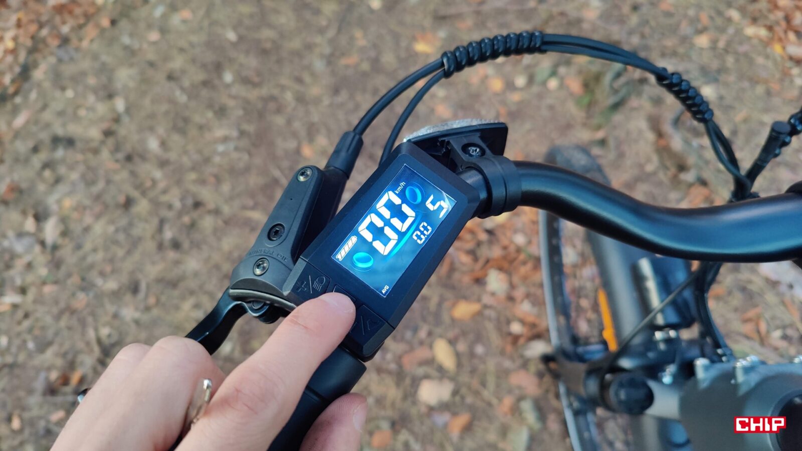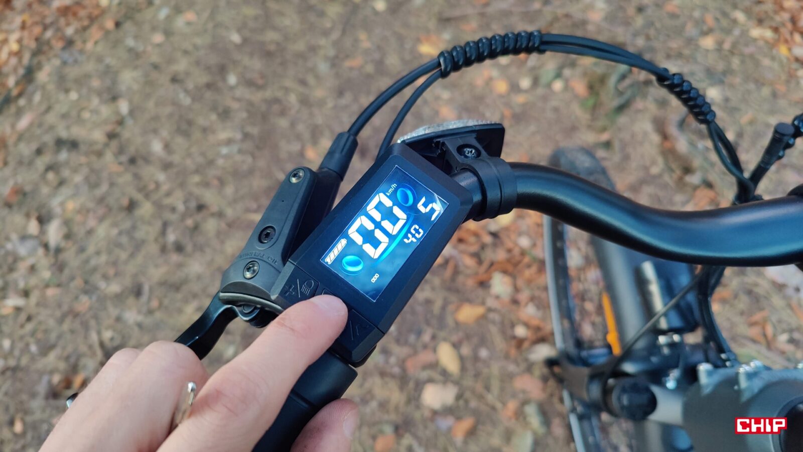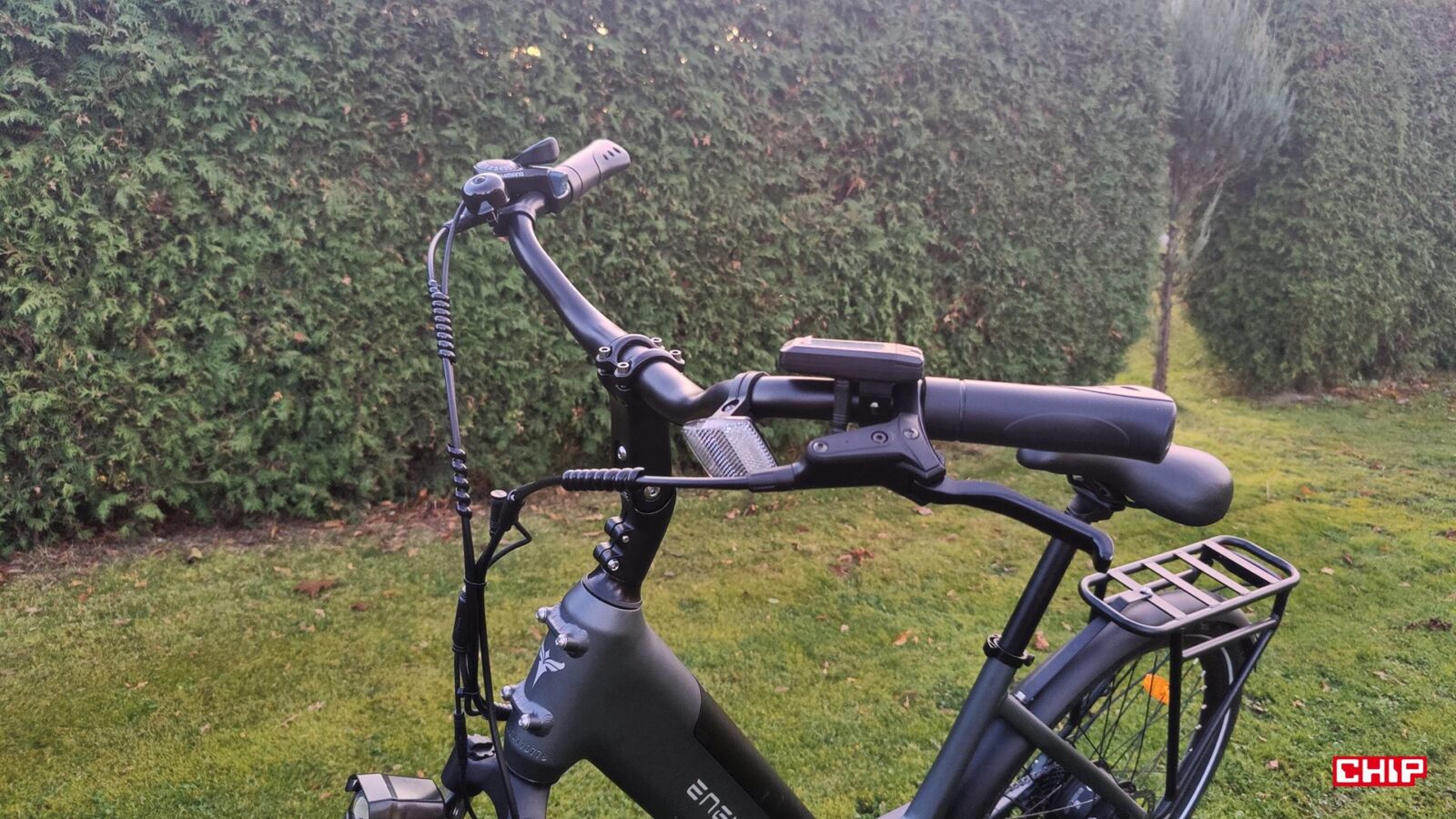 Cały rower jest fabrycznie wyposażony jak solidne miejskie narzędzie do podróży – zarówno tych małych, jak i dużych – nieważne, czy w deszczu czy po zmroku. Dostajemy bowiem kompletne oświetlenie na przód i tył, pełne błotniki, osłonę łańcucha, stopkę oraz deklarowaną odporność IP54 na wodę i brud. Dochodzi do tego kolorowy wyświetlacz LCD na kierownicy, po którym poruszamy się za sprawą trzech przycisków. Podglądamy na nim przejechany dystans, poziom wspomagania i stan akumulatora, a do tego pełni on rolę prostego komputera pokładowego, w którym można np. zmodyfikować maksymalną prędkość wspomagania.